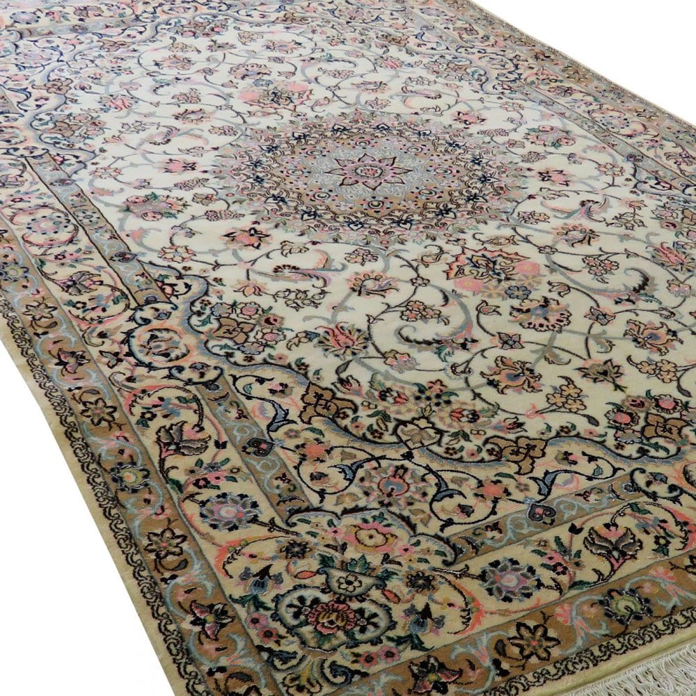 Der Teppich stammt aus Nain, einer bekannten Provinz im Iran, die für ihre exquisiten handgeknüpften Teppiche berühmt ist. Nain-Teppiche zeichnen sich durch ihre feine Verarbeitung und die Verwendung von edlen Materialien aus. Die Region hat eine lange Tradition in der Teppichknüpfkunst, die bis ins 16. Jahrhundert zurückreicht. Die typischen Muster und Designs dieser Region sind oft von persischer Kunst und Kultur inspiriert und spiegeln die reiche Geschichte der Region wider.