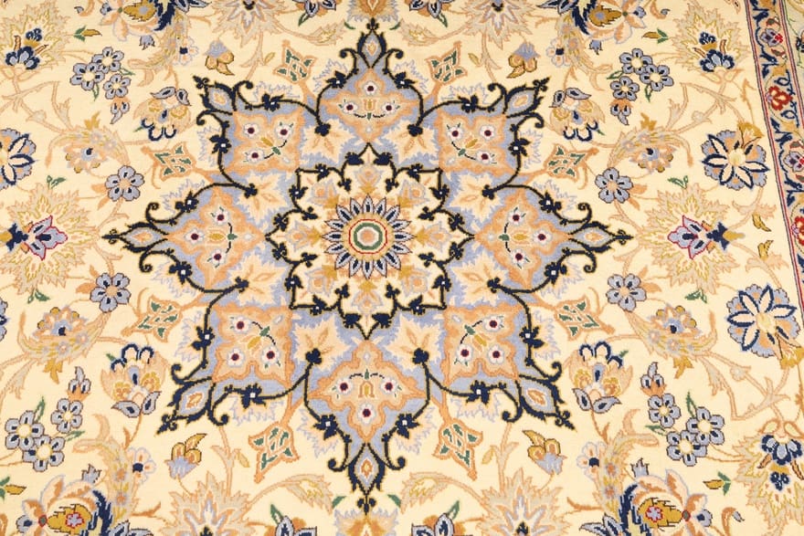 Der Najafabad-Teppich präsentiert ein klassisches Blumenmedaillon auf einem cremefarbenen Grund. Diese Art von Muster ist typisch für die Region und spiegelt die floralen Motive wider, die in vielen persischen Teppichen zu finden sind. Die sanften Farbtöne von Weiß und Beige verleihen dem Teppich eine elegante Ausstrahlung und machen ihn zu einer idealen Ergänzung für Gästezimmer und stilvolle Wohnräume. Die Verwendung von symmetrischen Mustern und floralen Elementen sorgt für eine harmonische Gesamtästhetik.
