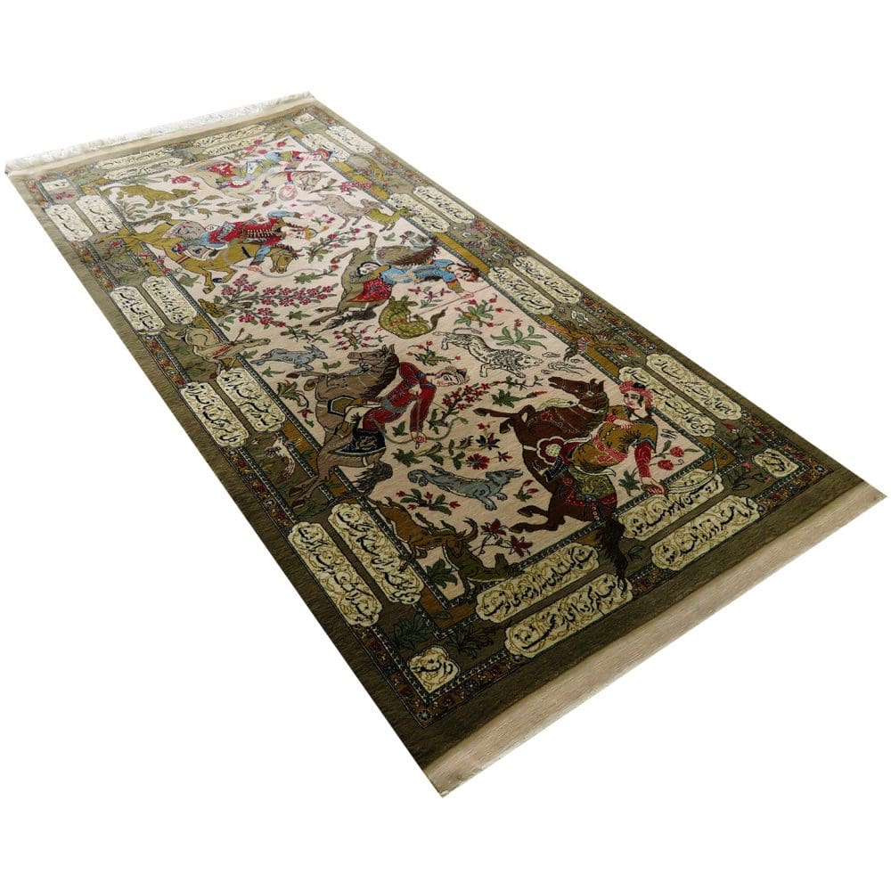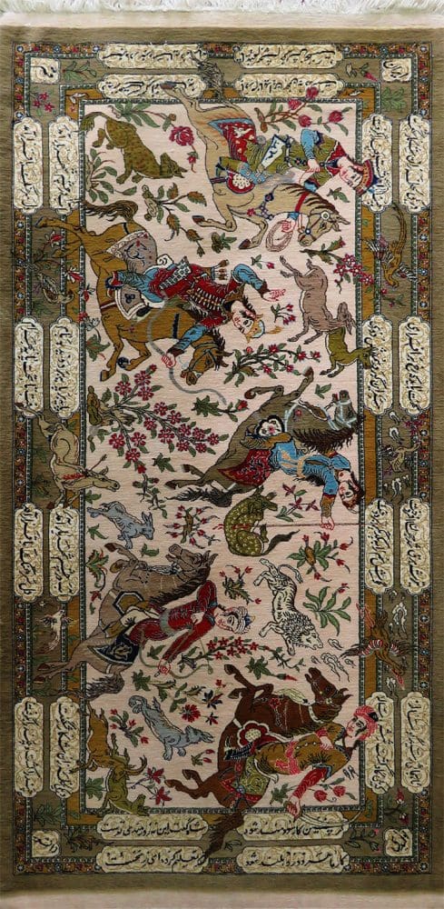 Der Teppich präsentiert ein elegantes Design mit einem Hauptfarbton in cremigem Beige, ergänzt durch eine farbige Umrandung, die dem Gesamtbild Lebendigkeit verleiht. Die Muster sind sorgfältig gestaltet, wobei das Hauptmotiv eine Jagdszene darstellt, was typisch für die Kunst dieser Region ist. Die Symmetrien und Details sind präzise ausgeführt, was den Teppich zu einem Kunstwerk für jeden Raum macht. Die Farbpalette ist harmonisch und fügt sich gut in verschiedene Einrichtungsstile ein.
