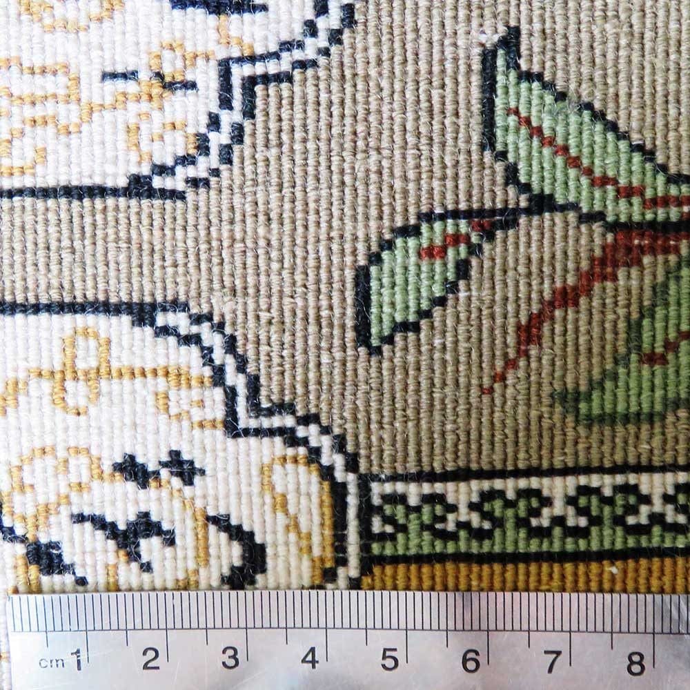 Der Orientteppich stammt aus der Region Qom, die für ihre hochwertigen handgeknüpften Teppiche bekannt ist. Das Material des Teppichs besteht aus einer Kombination von Kork und Seide, wobei der Seidenanteil etwa 20% beträgt. Der Flor des Teppichs ist aus einer Mischung von Kork und Seide gefertigt, was ihm eine besondere Weichheit und Glanz verleiht. Die Kette besteht aus robustem Baumwollgarn, das für zusätzliche Stabilität sorgt. Der Teppich ist in einem neuwertigen Zustand, was ihn besonders attraktiv für Käufer macht, die Wert auf Qualität und Langlebigkeit legen.