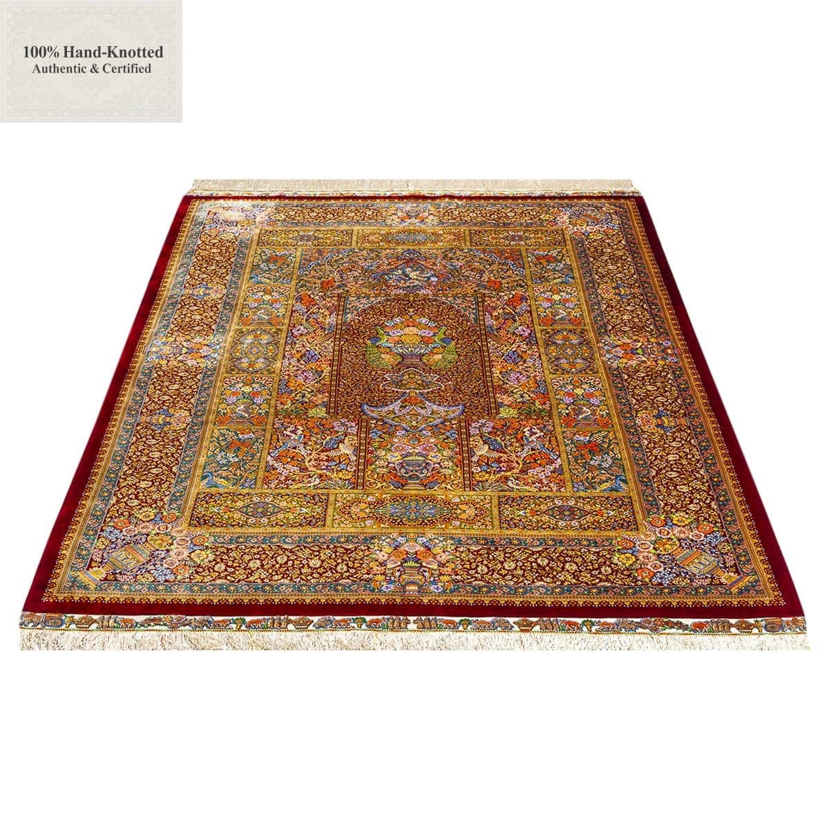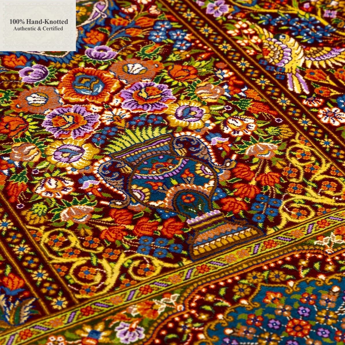 Dieser Teppich ist handgeknüpft. Das Material besteht vollständig aus Seide. Die Feinheit wird mit 70 Raj angegeben, was einer Knotendichte von (ca. 1.000.000 Knoten / m²) entspricht. Das Gewicht beträgt 6 kg. Das Design wird als Pfau (Tavus) angegeben.