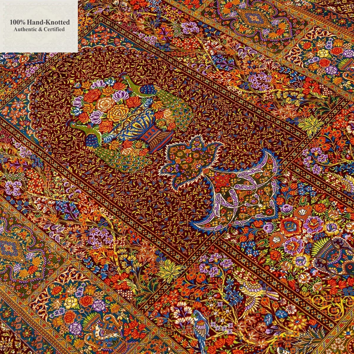 Handgeknüpfter Qom Orientteppich | Knotendichte: 1.000.000 / m² | Material: Seide | Größe: 135 x 200 cm | Herkunft: Qom | Design: Pfau | Hinweis: Bei Unikaten bitte vor Bestellung die Verfügbarkeit prüfen