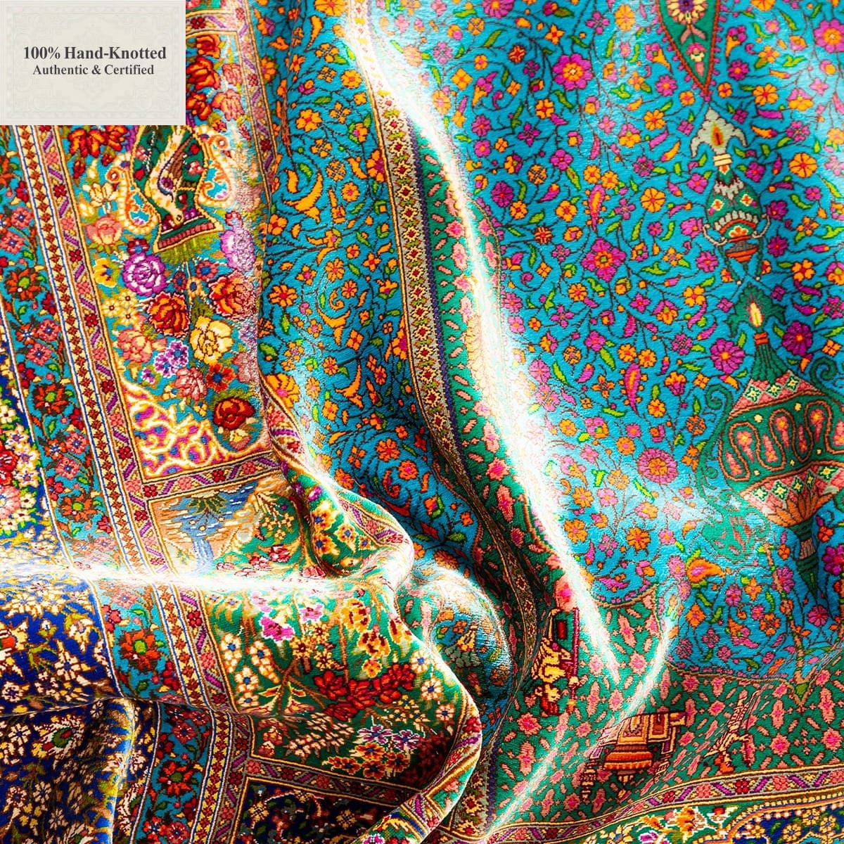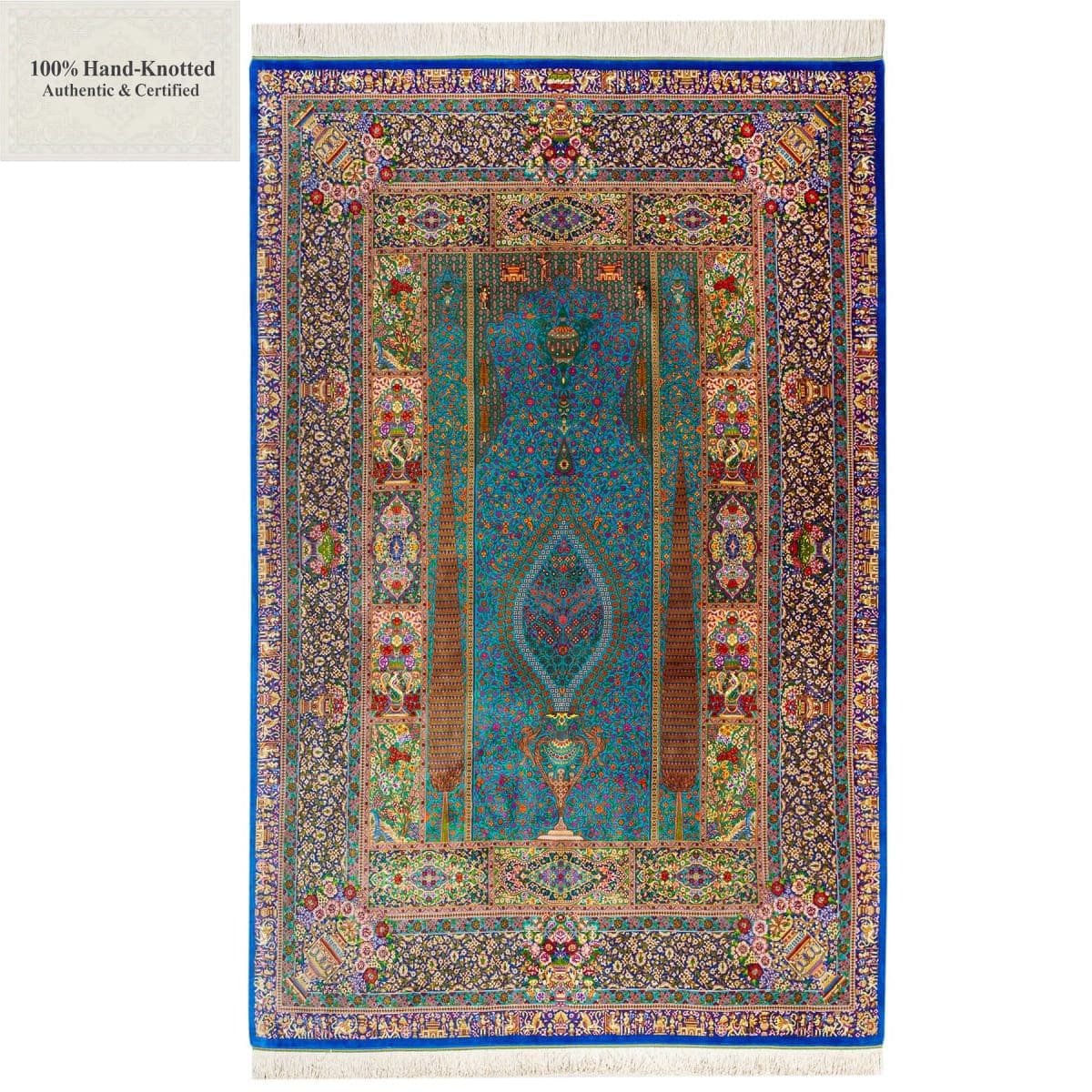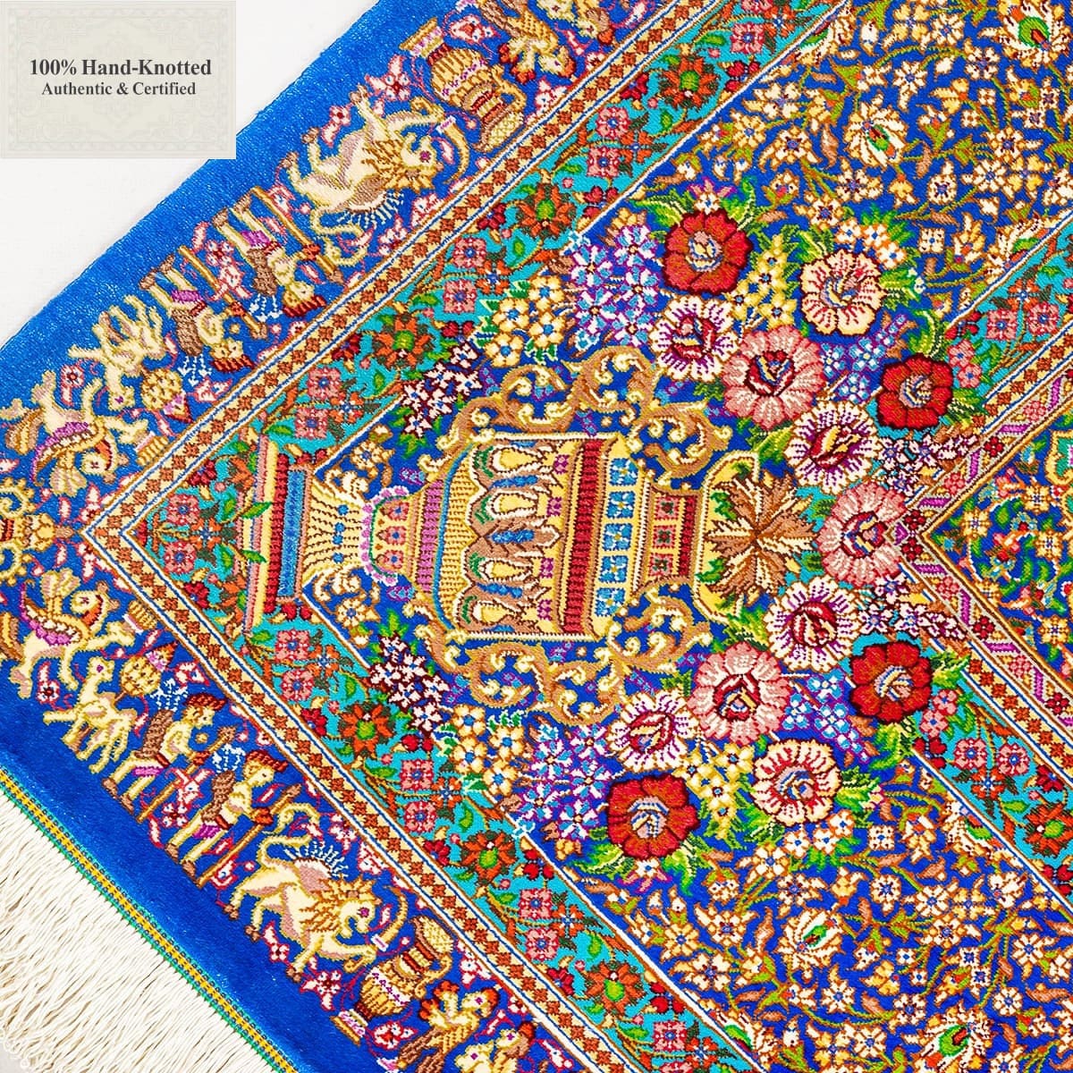 Handgeknüpfter Qom Orientteppich | Knotendichte: 1.200.000 / m² | Material: Flor: Seide, Kette: Seide, Schuss: Seide | Größe: 200 x 136 cm | Herkunft: Qom | Farbe: blau | Marke: Arablou | Hinweis: Bei Unikaten bitte vor Bestellung die Verfügbarkeit prüfen