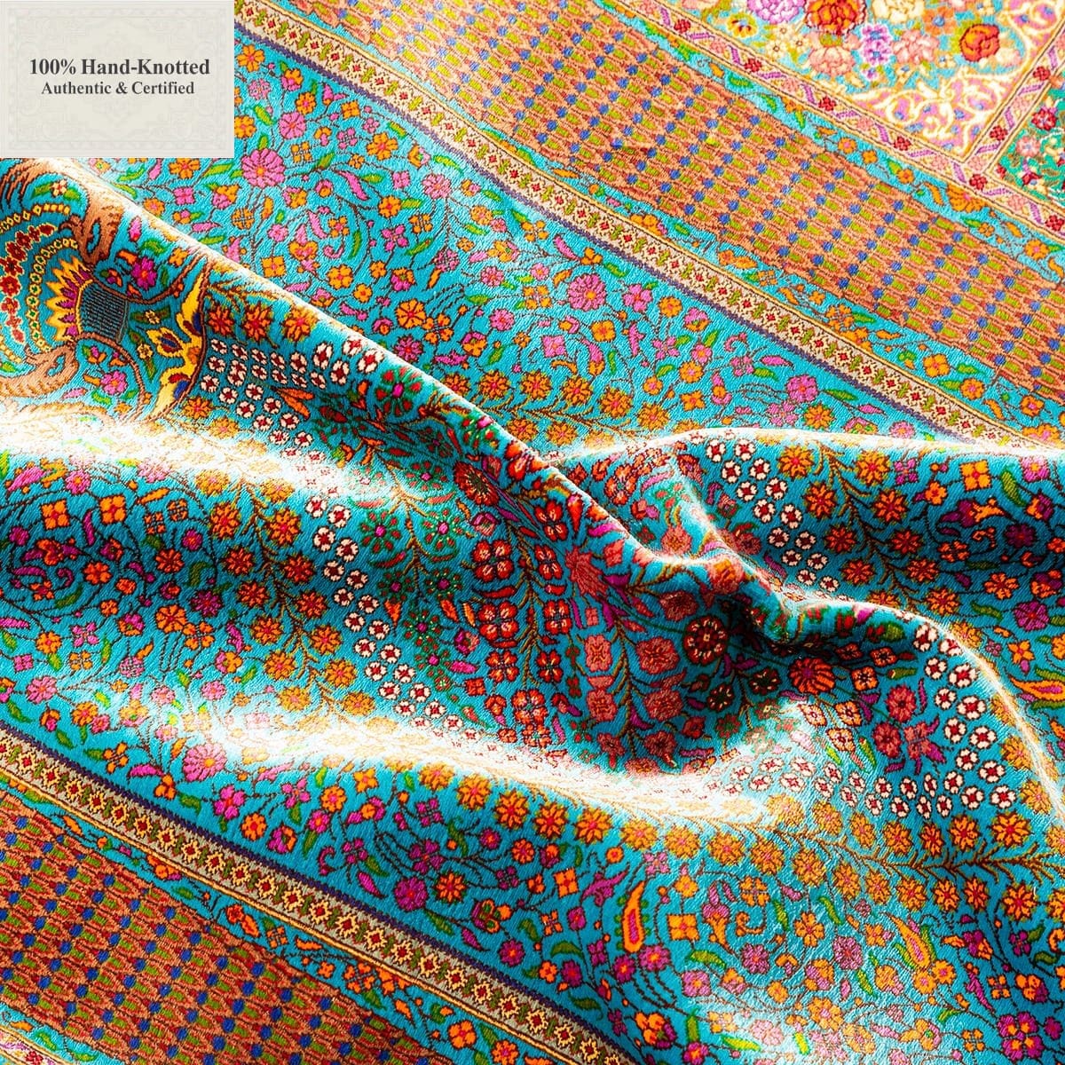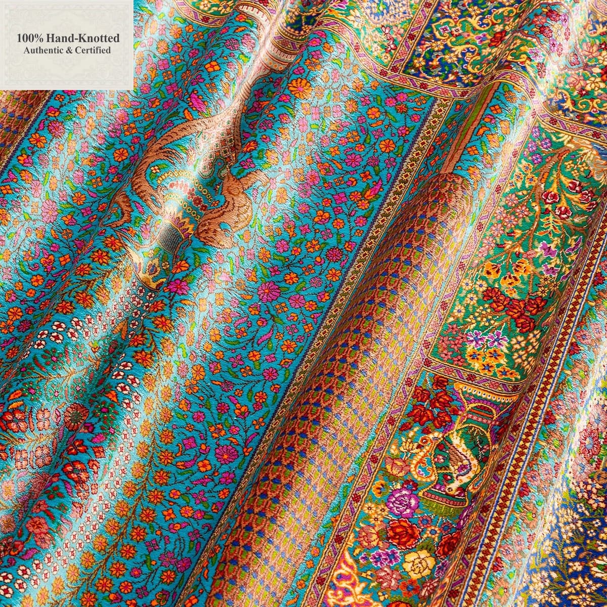 Dieser Teppich ist handgeknüpft. Der Flor besteht aus Seide. Kette (Kettfaden) und Schuss (Schussfaden) bestehen ebenfalls aus Seide. Die Feinheit wird mit 80 Raj angegeben, was einer Knotendichte von (ca. 1.200.000 Knoten / m²) entspricht. Das Gewicht beträgt 5,50 kg. Das Design wird als Sarvi angegeben.