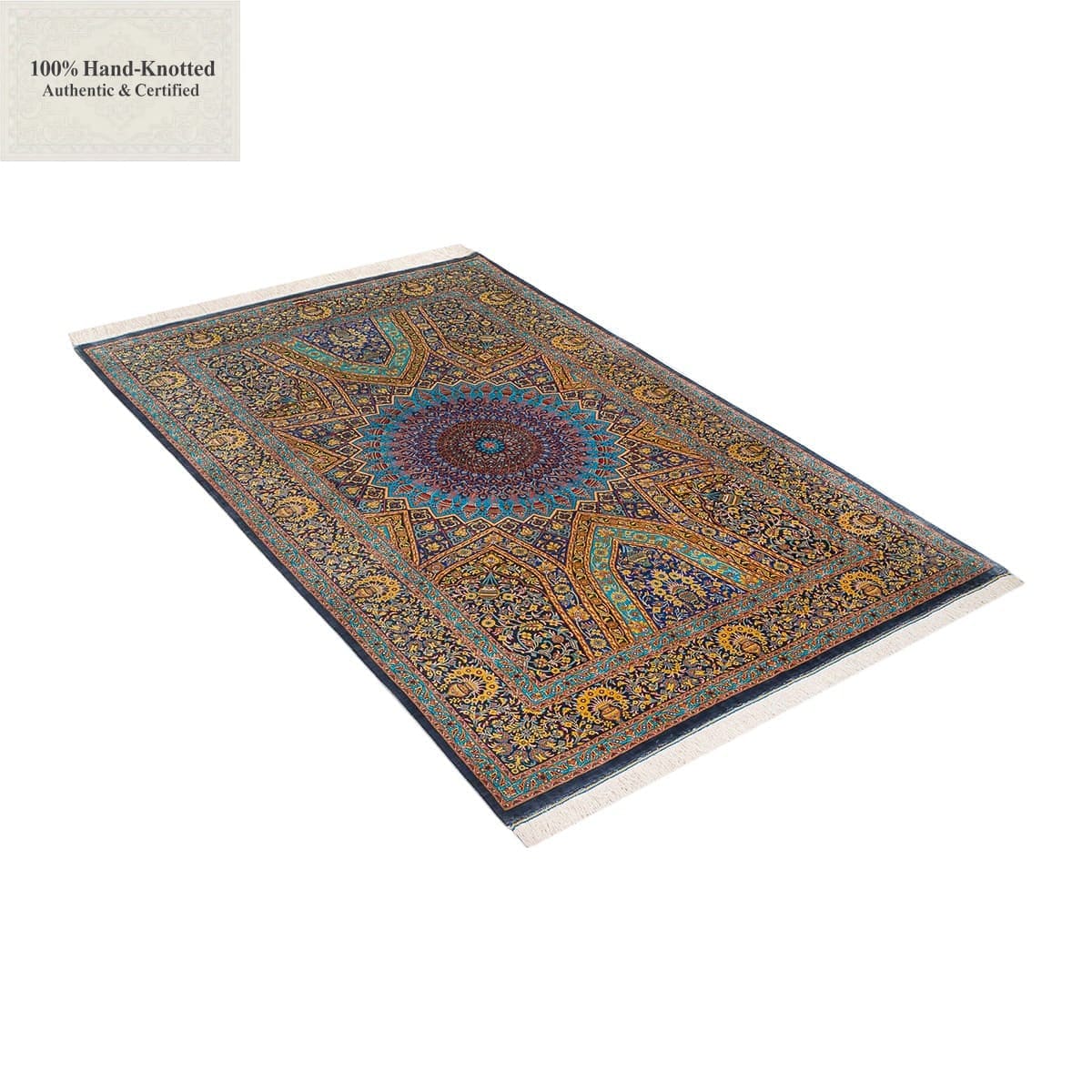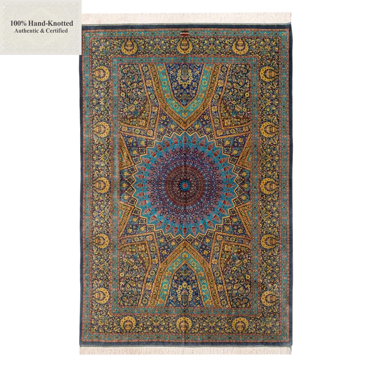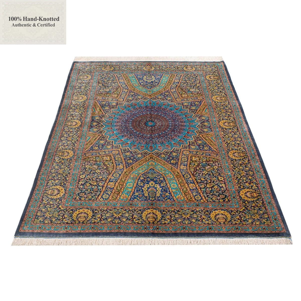 Dieser Teppich ist handgeknüpft. Das Material besteht vollständig aus Seide. Die Feinheit wird mit 70 Raj angegeben, was einer Knotendichte von (ca. 1.100.000 Knoten / m²) entspricht. Das Gewicht beträgt 5,20 kg. Das Design wird als Gonbad angegeben.