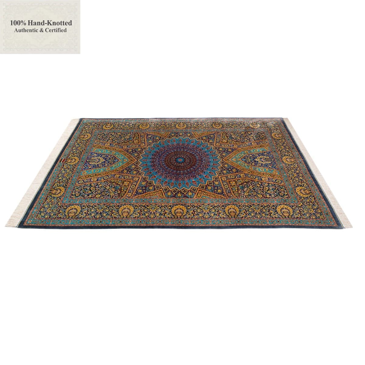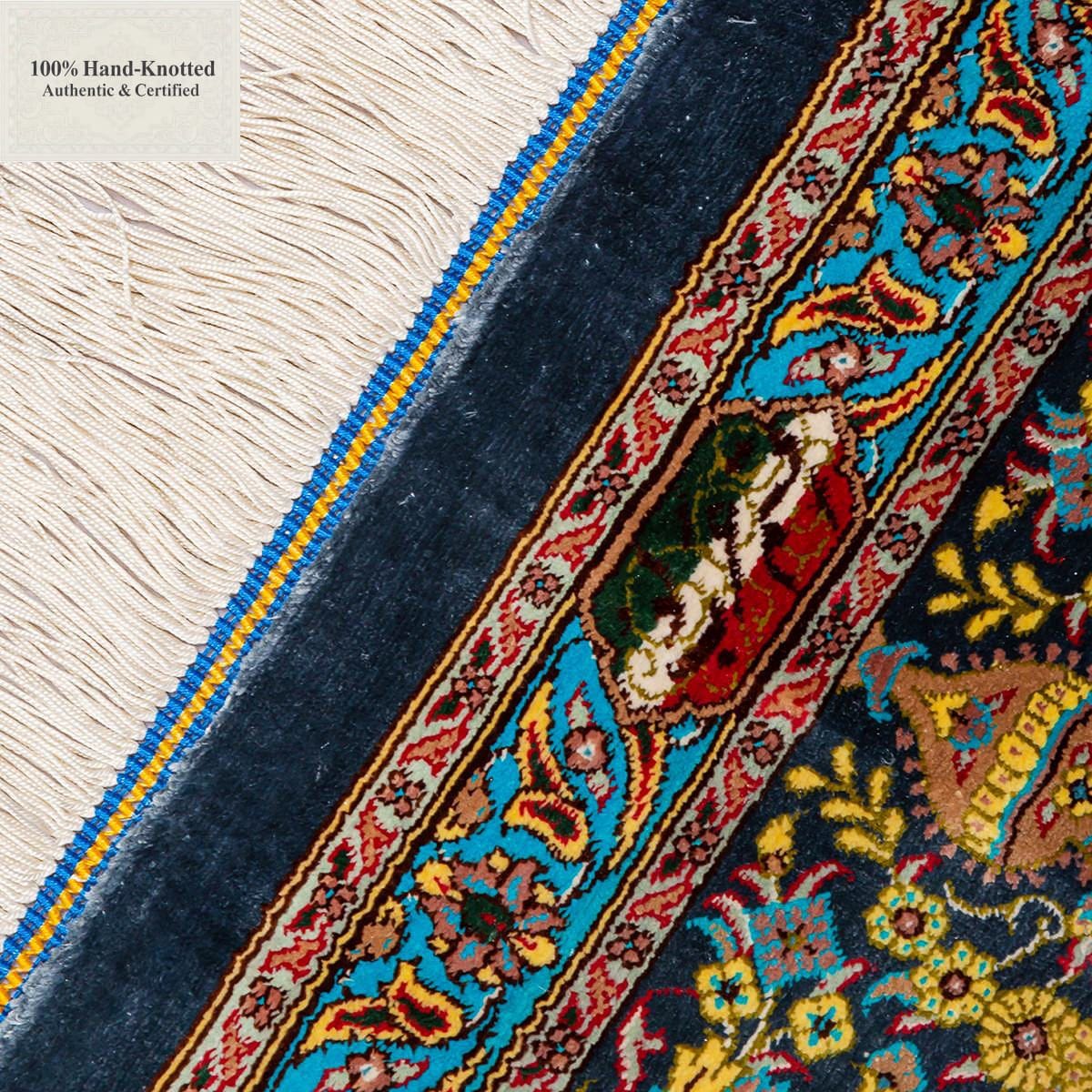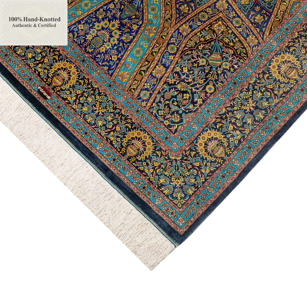 Der Teppich besteht vollständig aus Seide.