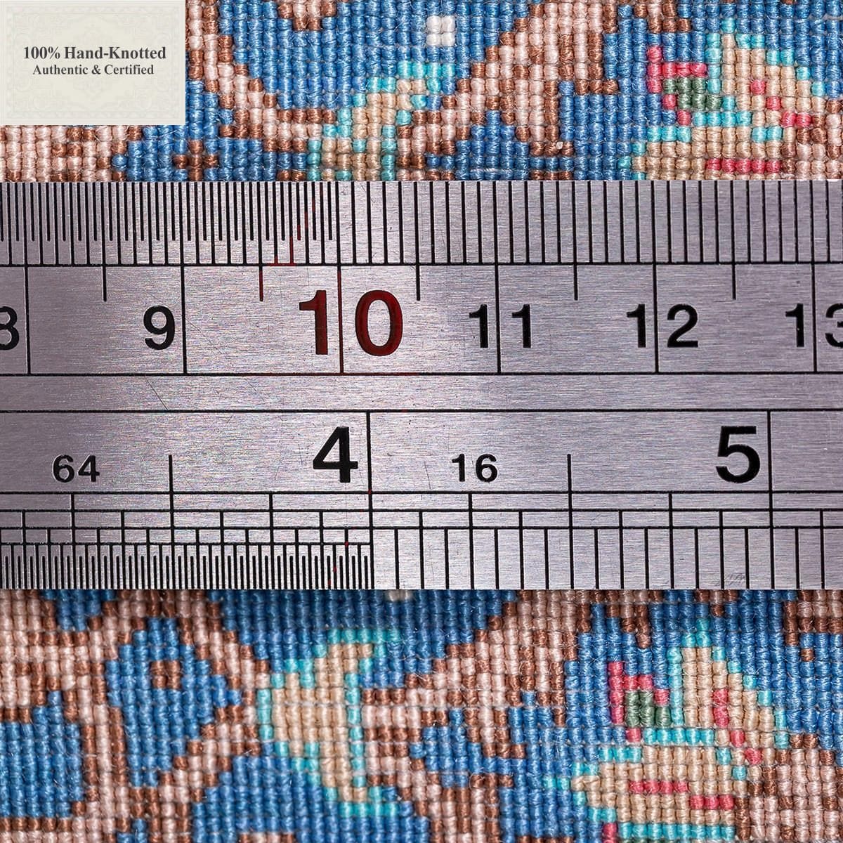 Die Angabe 70 Raj beschreibt die Feinheit der Knüpfung und entspricht (ca. 1.100.000 Knoten / m²).