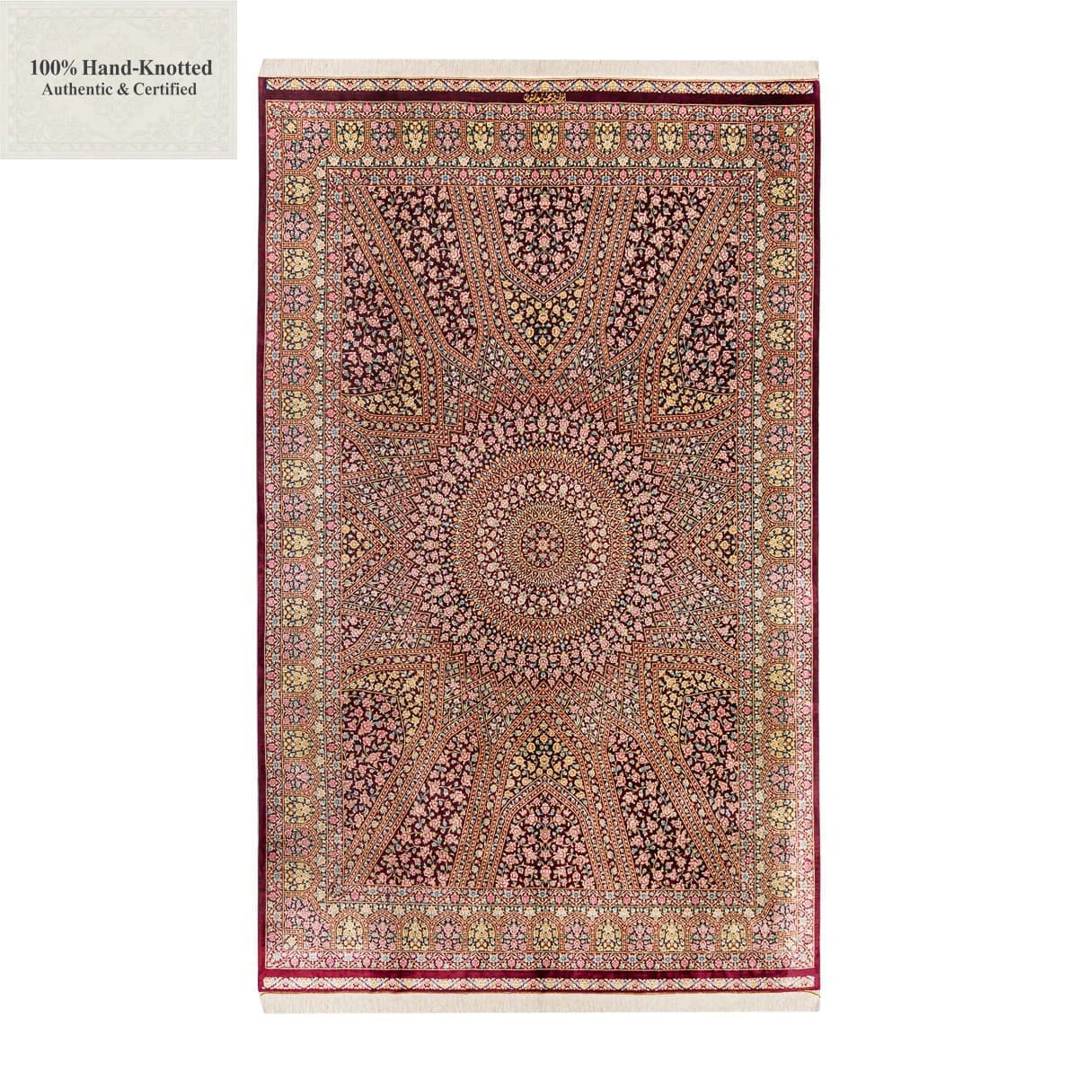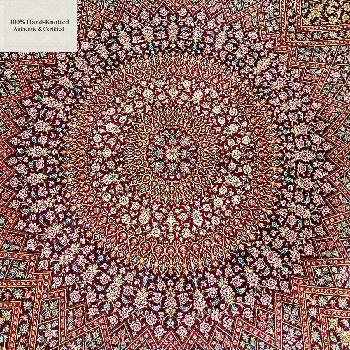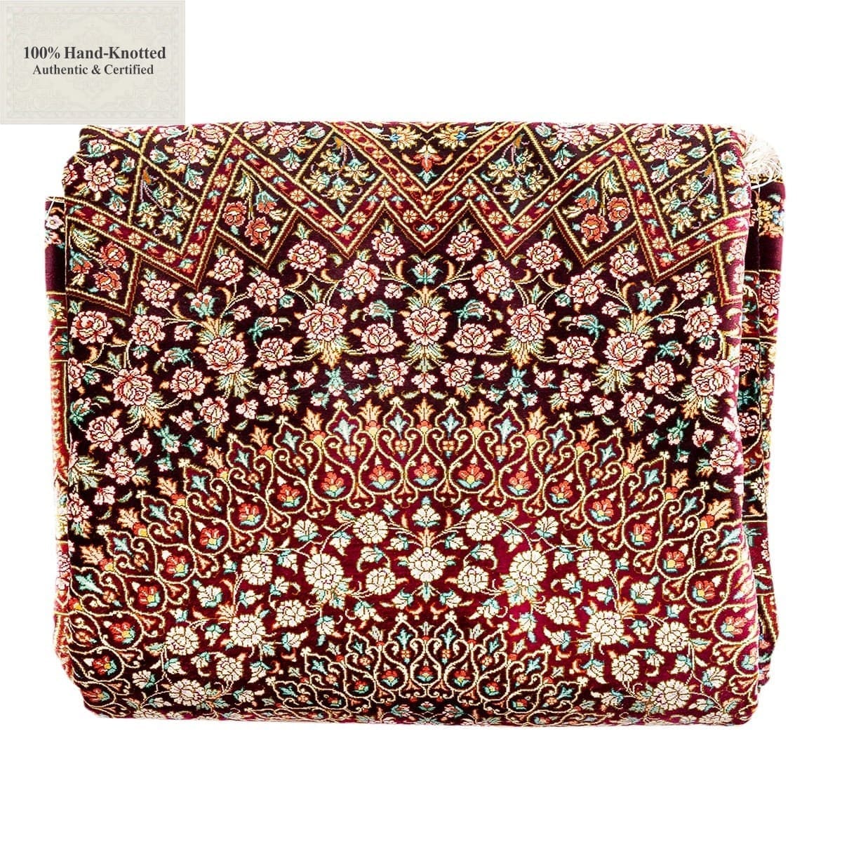 Dieser Teppich ist handgeknüpft. Das Material besteht vollständig aus Seide. Flor, Kette (Kettfaden) und Schuss (Schussfaden) sind aus Seide gefertigt. Die Feinheit wird mit 80 Raj angegeben, was einer Knotendichte von (ca. 1.200.000 Knoten / m²) entspricht. Das Design wird als „Gonbad“ angegeben.