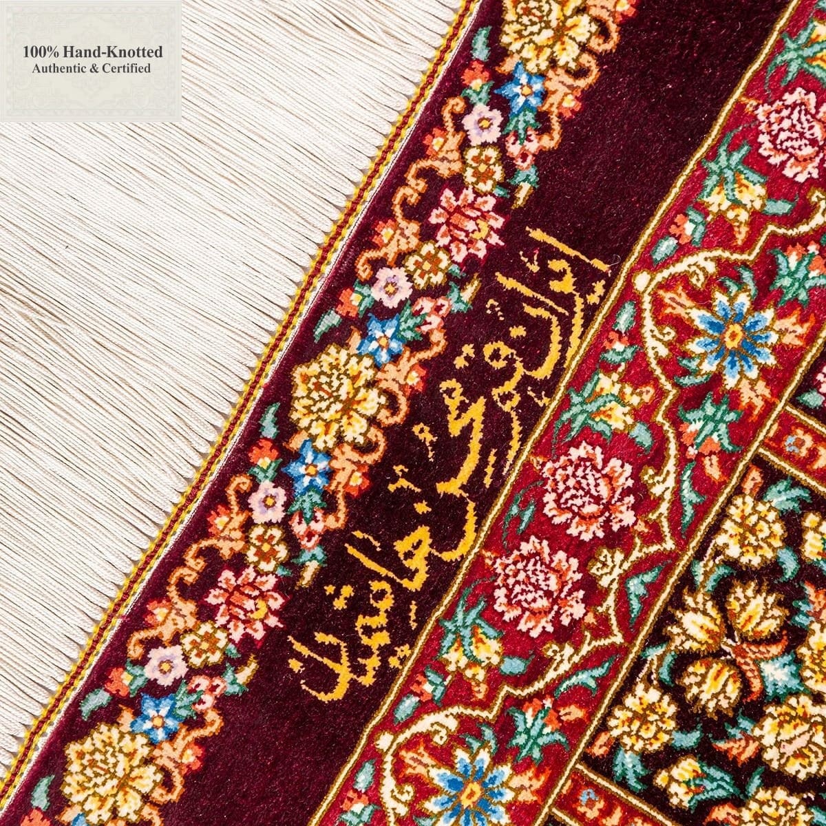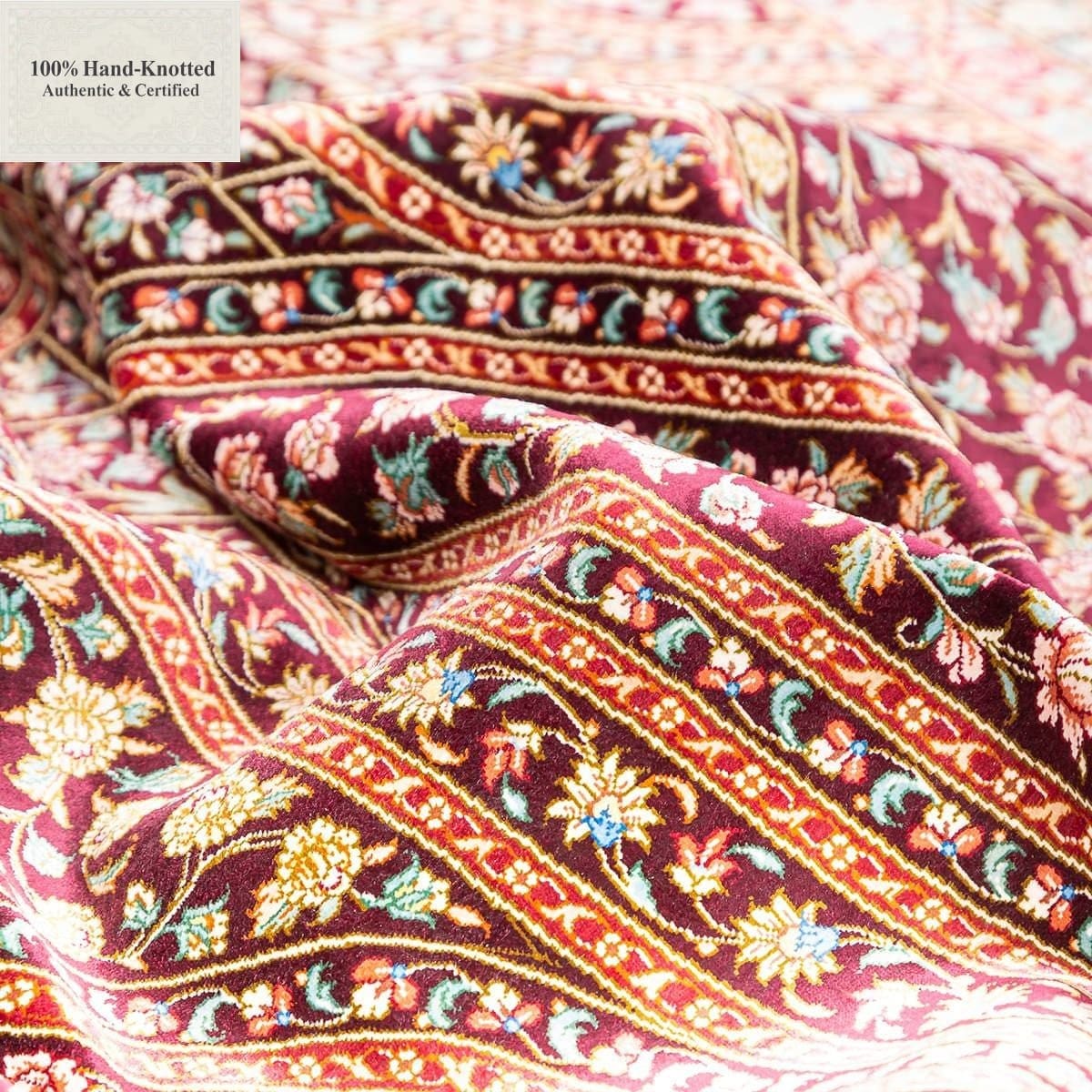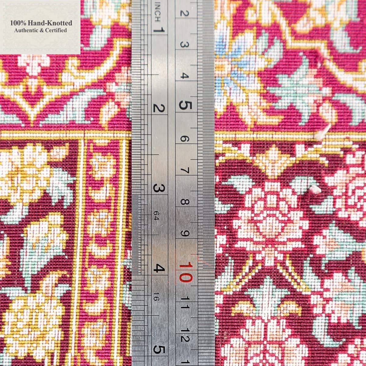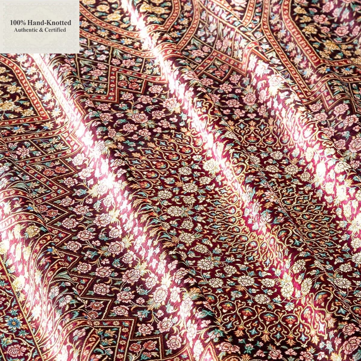 Dieser Teppich ist handgeknüpft. Das Material besteht vollständig aus Seide. Flor, Kette (Kettfaden) und Schuss (Schussfaden) sind aus Seide gefertigt. Die Feinheit wird mit 80 Raj angegeben, was einer Knotendichte von (ca. 1.200.000 Knoten / m²) entspricht. Das Design wird als „Gonbad“ angegeben.