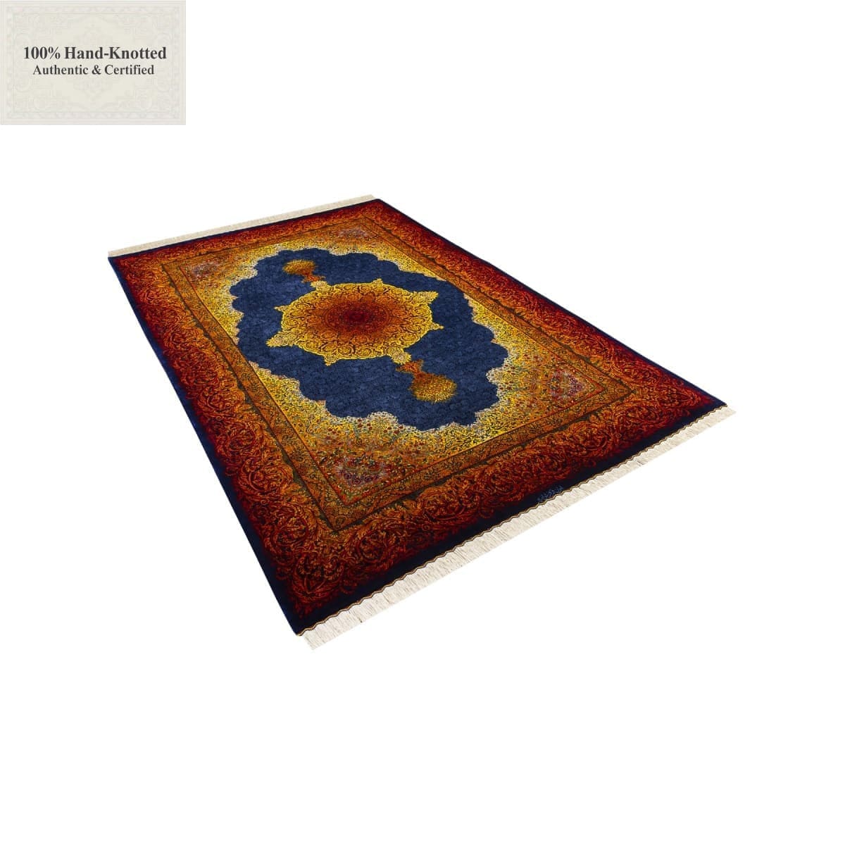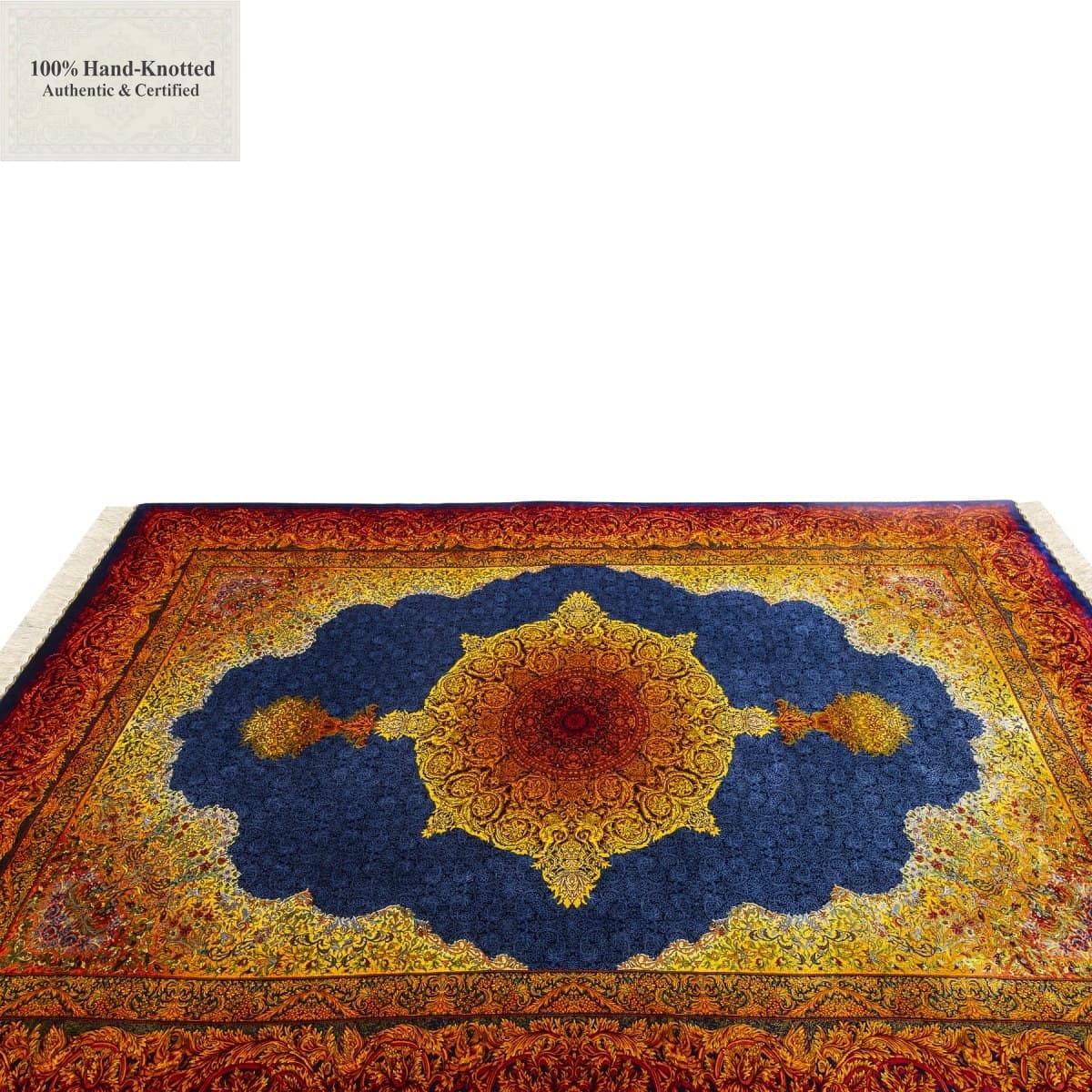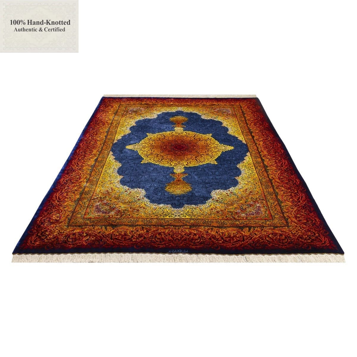 Dieser Teppich ist handgeknüpft. Der Flor besteht aus Seide. Kette (Kettfaden) und Schuss (Schussfaden) bestehen ebenfalls aus Seide. Die Feinheit wird mit 70 Raj angegeben, was einer Knotendichte von (ca. 1.000.000 Knoten / m²) entspricht. Das Gewicht beträgt 11 kg. Das Design wird als Lechek Toranj angegeben.