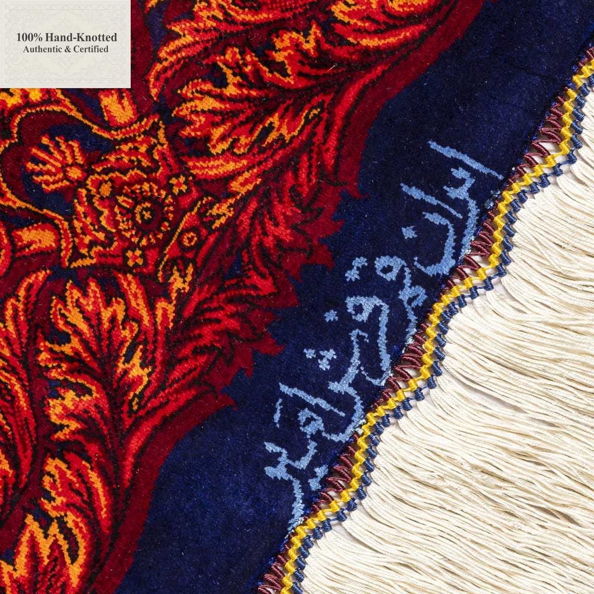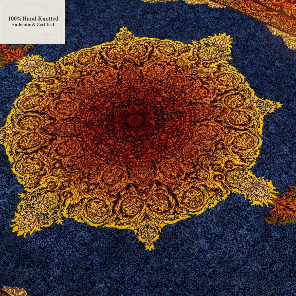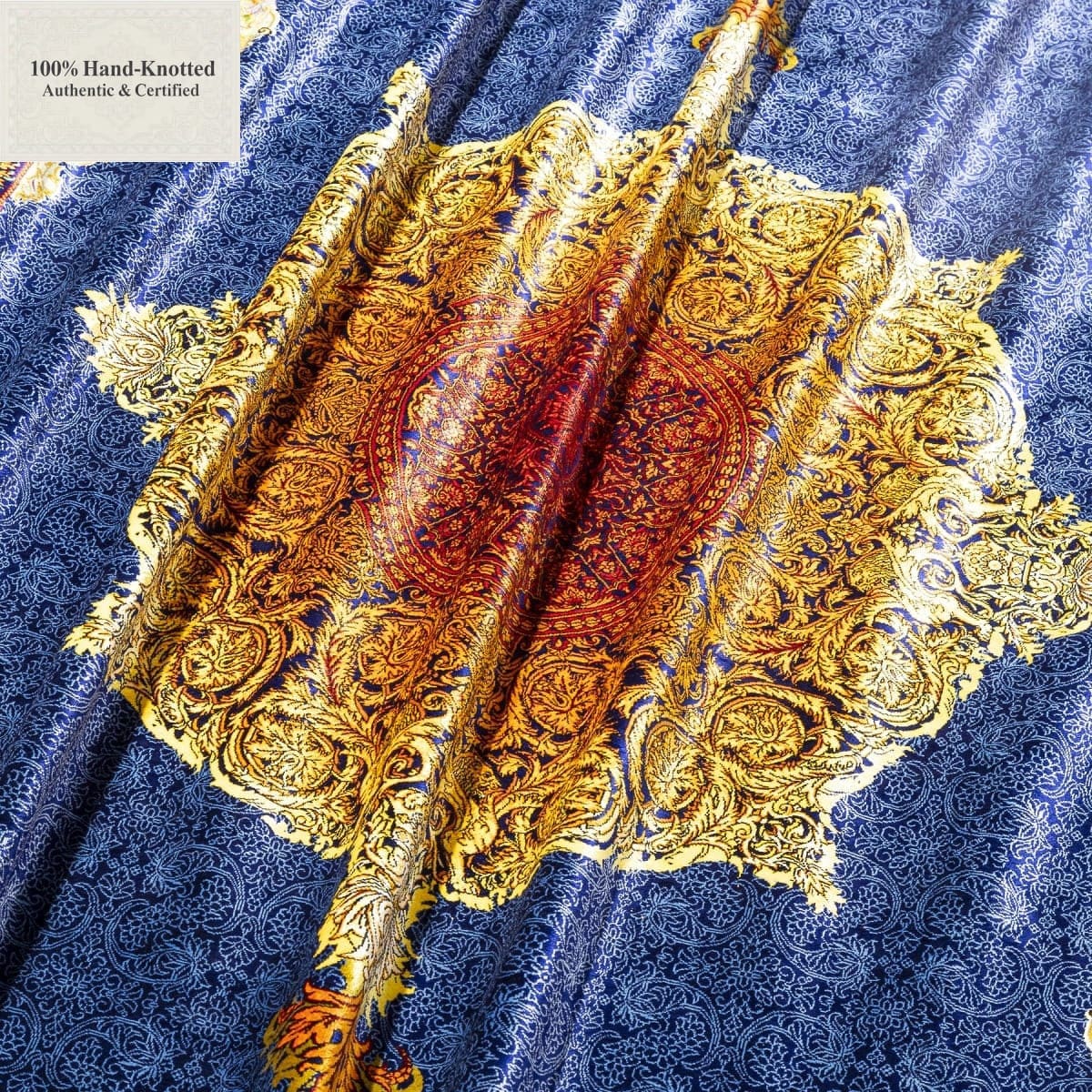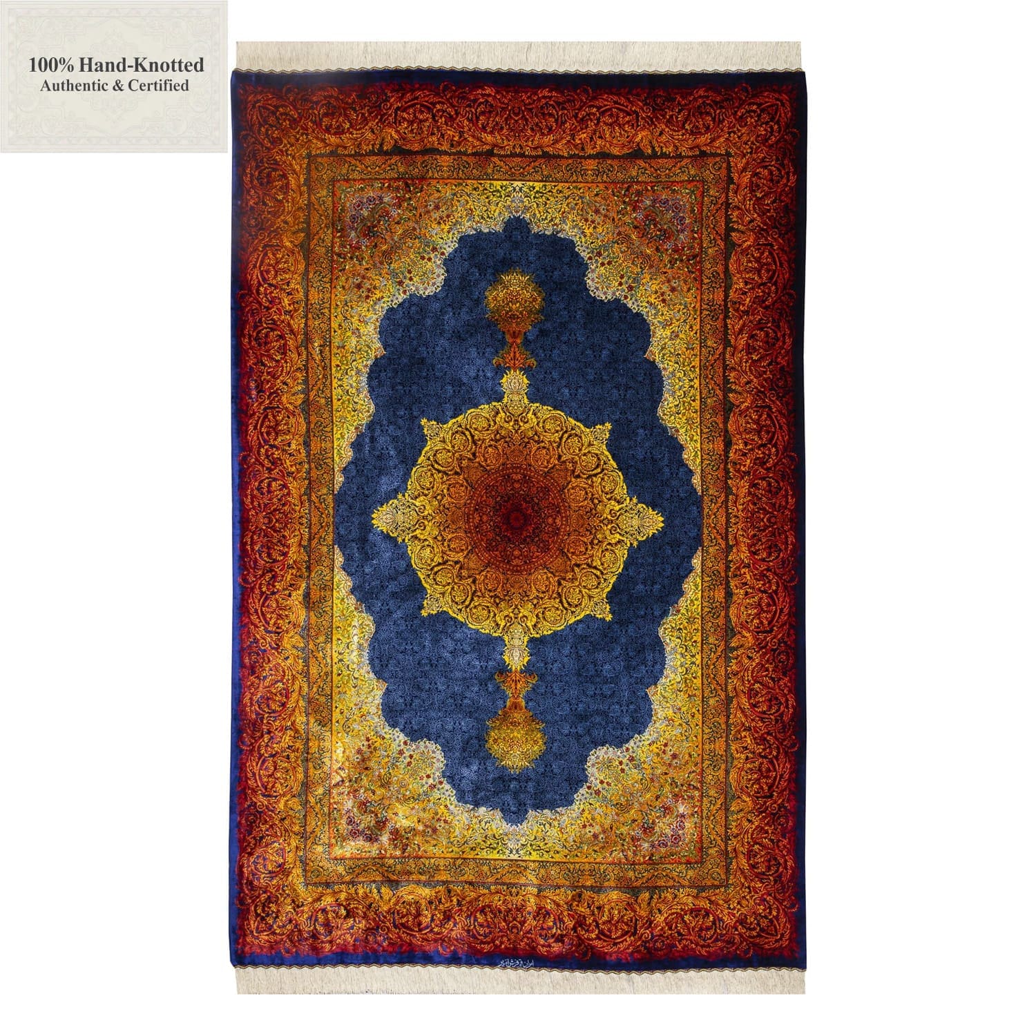 Dieser Teppich ist handgeknüpft. Der Flor besteht aus Seide. Kette (Kettfaden) und Schuss (Schussfaden) bestehen ebenfalls aus Seide. Die Feinheit wird mit 70 Raj angegeben, was einer Knotendichte von (ca. 1.000.000 Knoten / m²) entspricht. Das Gewicht beträgt 11 kg. Das Design wird als Lechek Toranj angegeben.