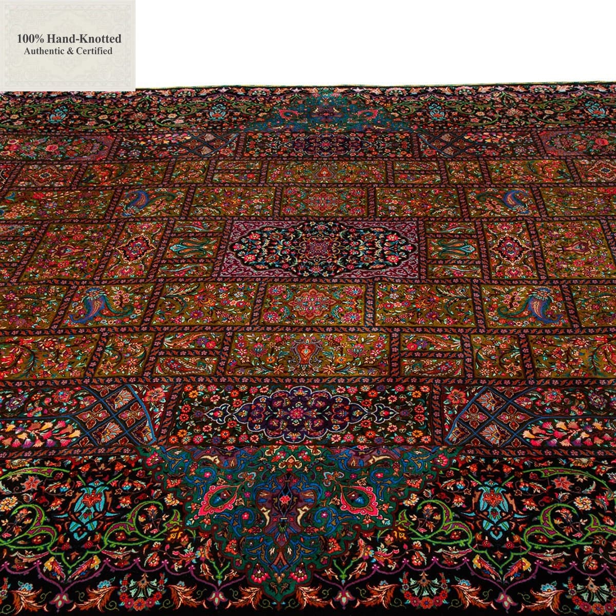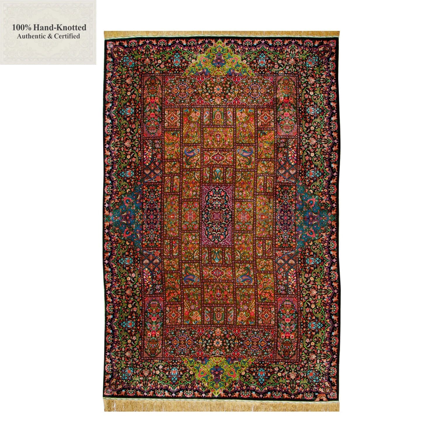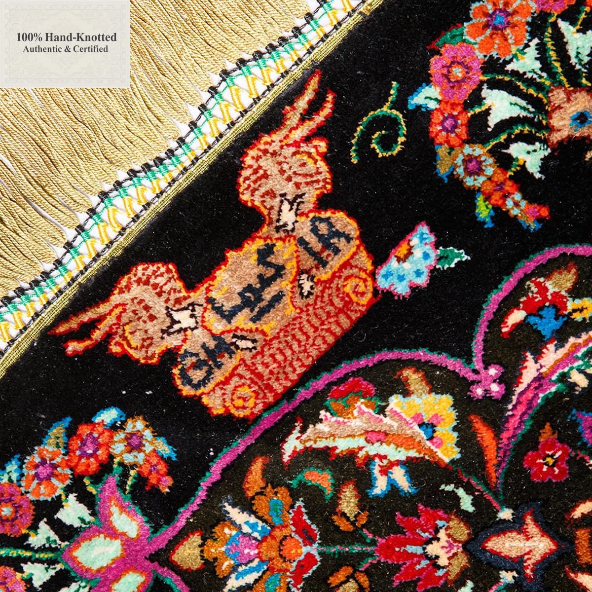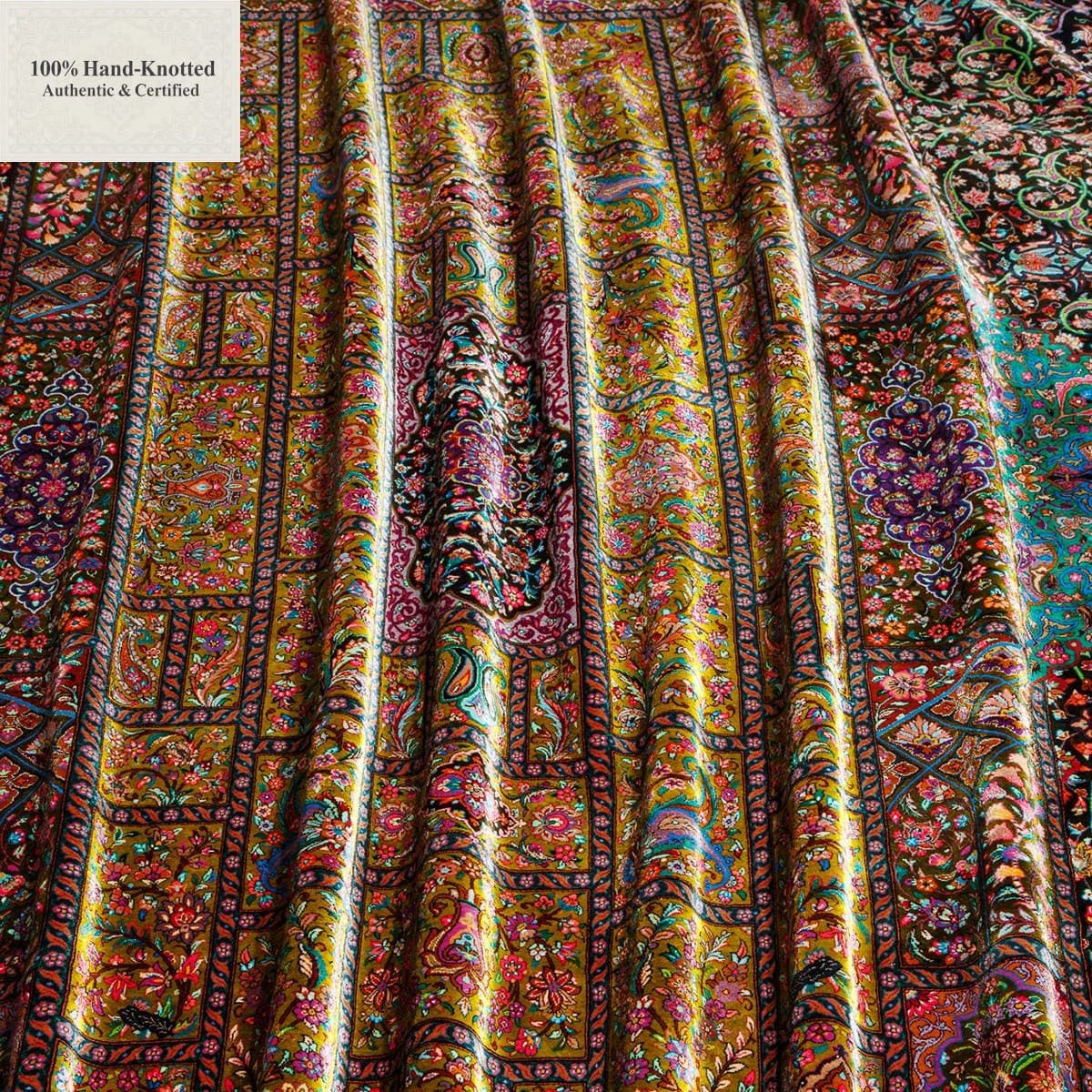 Dieser Teppich ist handgeknüpft. Das Material besteht vollständig aus Seide. Die Feinheit wird mit 70 Raj angegeben, was einer Knotendichte von (ca. 1.000.000 Knoten / m²) entspricht. Das Gewicht beträgt 15,90 kg. Das Design wird als Ghaabi angegeben.
