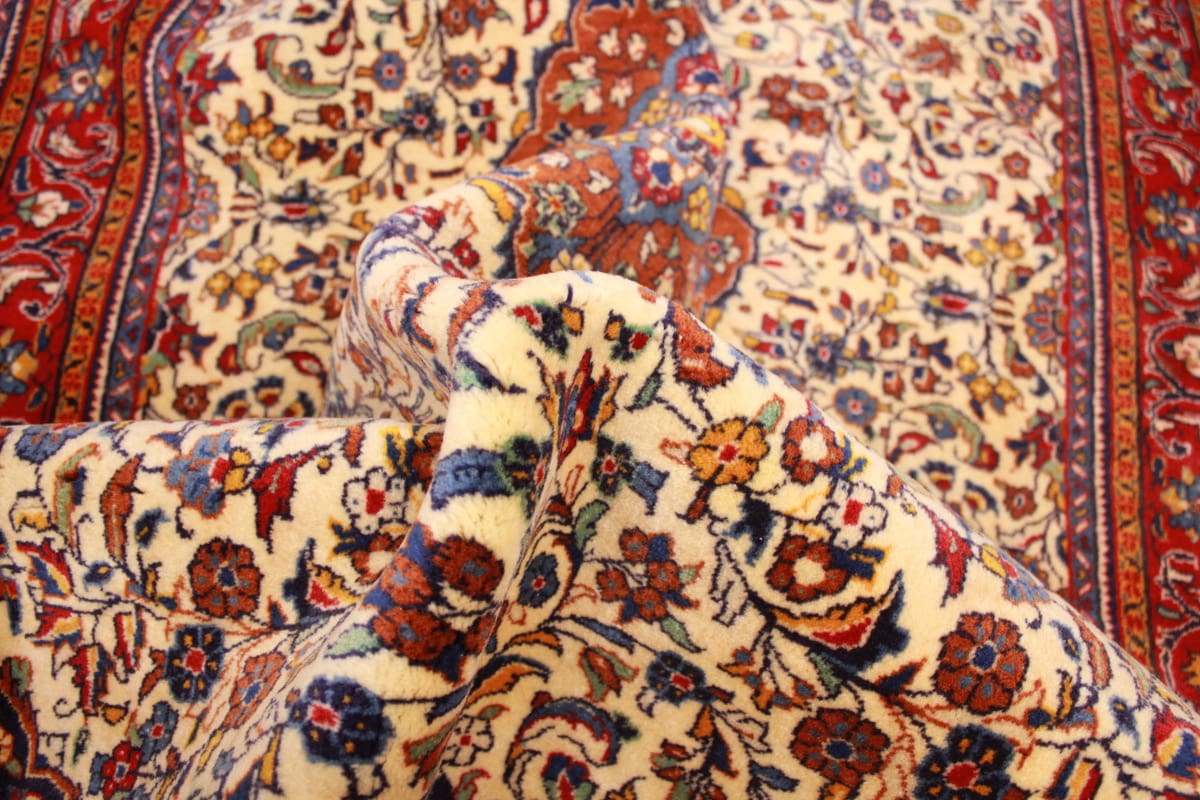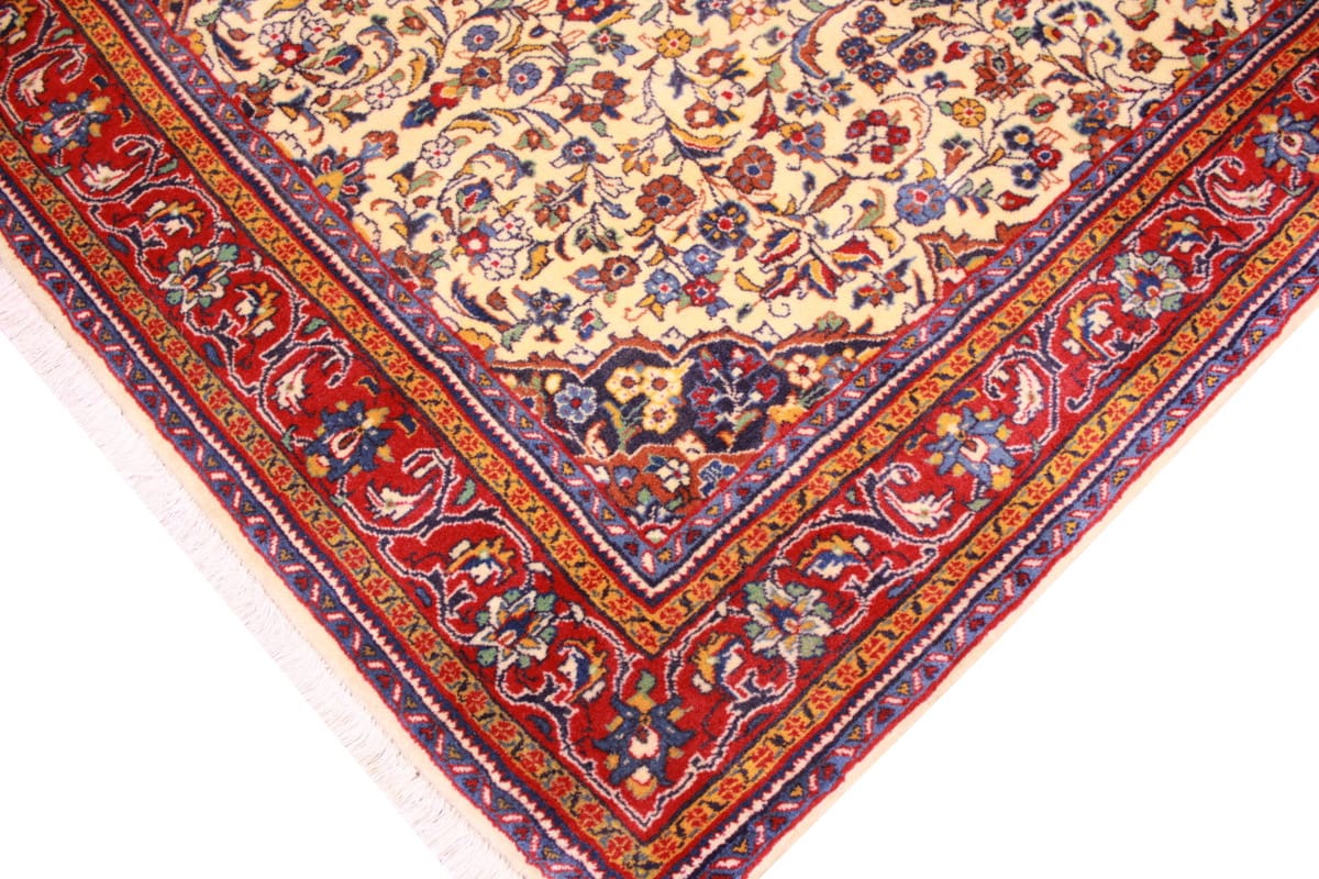 Der blumige Gestaltungsstil des Sarough Teppichs ist nicht nur zeitlos, sondern auch vielseitig einsetzbar. Das elegante Beige dient als neutrale Basis, die eine Vielzahl von Einrichtungsstilen ergänzt, von klassisch bis modern. Die floralen Muster symbolisieren Wachstum und Erneuerung, und das harmonische Zusammenspiel der Farben bringt Natur und Lebensfreude ins Zuhause. Solche Motive finden sich in vielen persischen Teppichen wieder und tragen zur kulturellen Tiefe des Designs bei.