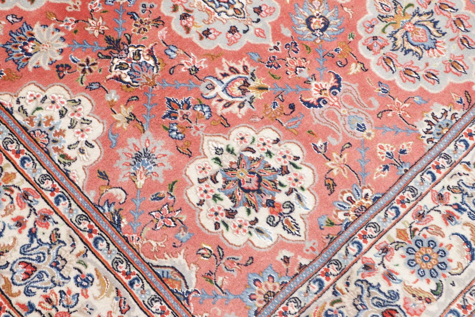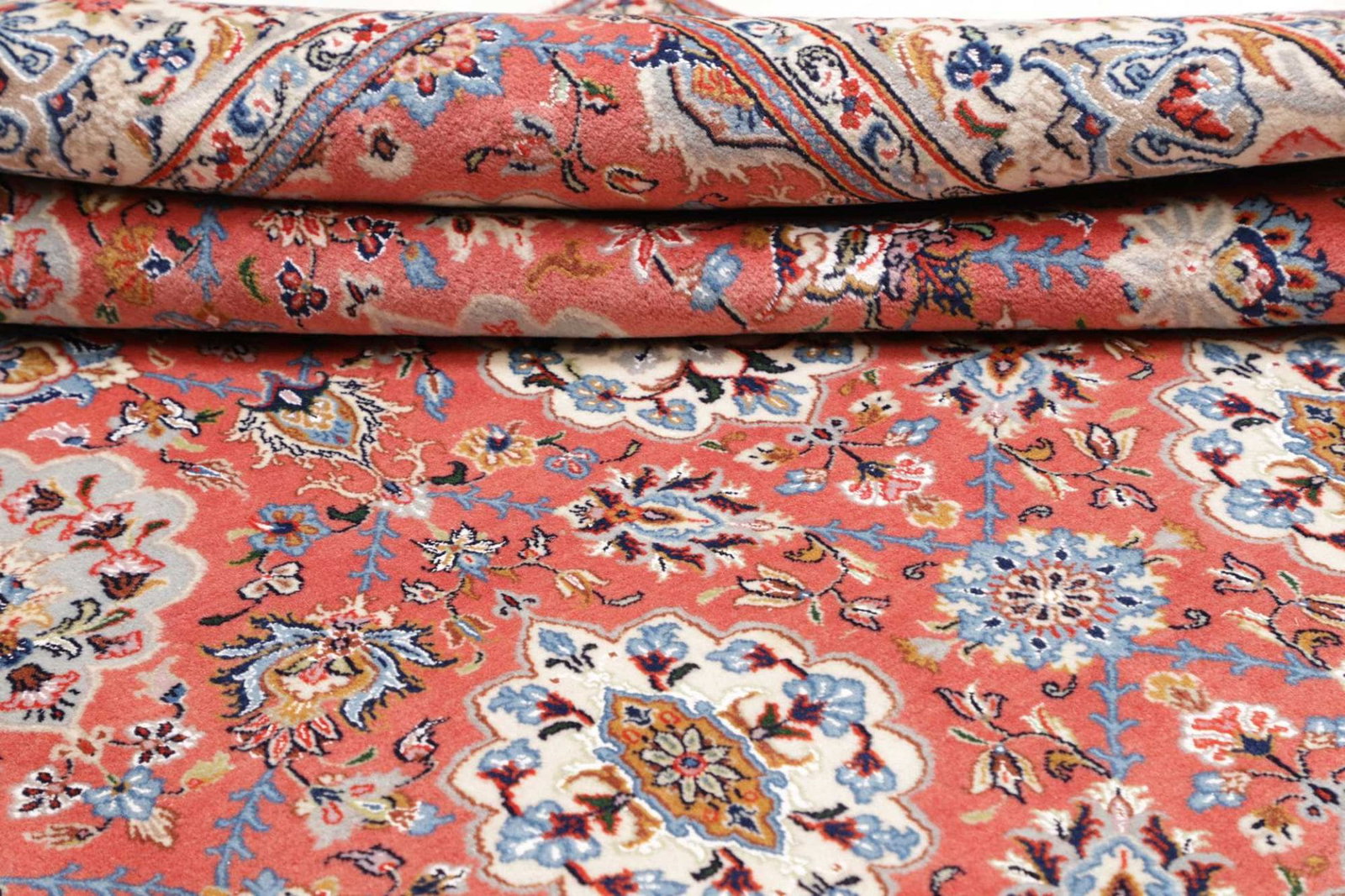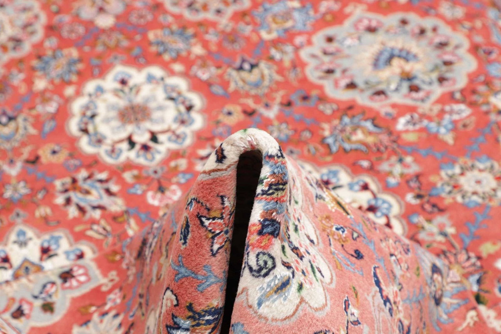 Die hohe Knotendichte von ca. 200.000 Knoten pro Quadratmeter steht für die exquisite Qualität und die Detailgenauigkeit der Handarbeit. Der Flor hat eine Höhe von etwa 10-12 mm, was zu einer angenehmen und weichen Oberfläche beiträgt. Die Verwendung von 100% Schurwolle und 100% Baumwolle in der Kette sorgt für Langlebigkeit und Strapazierfähigkeit, während die handgeknüpfte Verarbeitung den Teppich zu einem einzigartigen und wertvollen Stück macht.