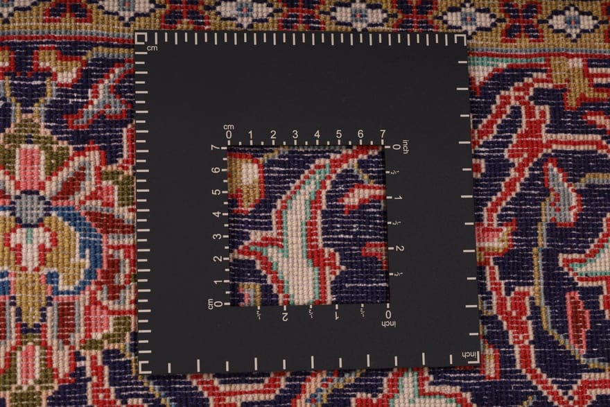 Der Sarough Teppich ist ein handgeknüpftes Kunstwerk, das aus hochwertiger Wolle besteht. Der Flor ist aus reiner Wolle gefertigt, was nicht nur für eine angenehme Haptik sorgt, sondern auch für eine lange Lebensdauer des Teppichs. Die Kette ist aus Baumwolle gefertigt, was die Stabilität und Langlebigkeit des Teppichs zusätzlich unterstützt. Die Dicke des Teppichs beträgt etwa 10 mm, was ihn sowohl weich als auch robust macht. Mit einer Knotendichte von ca. 200.000 bis 250.000 Knoten pro Quadratmeter wird ein sehr feines und detailliertes Muster ermöglicht, das für die Qualität und Handwerkskunst des Teppichs spricht.