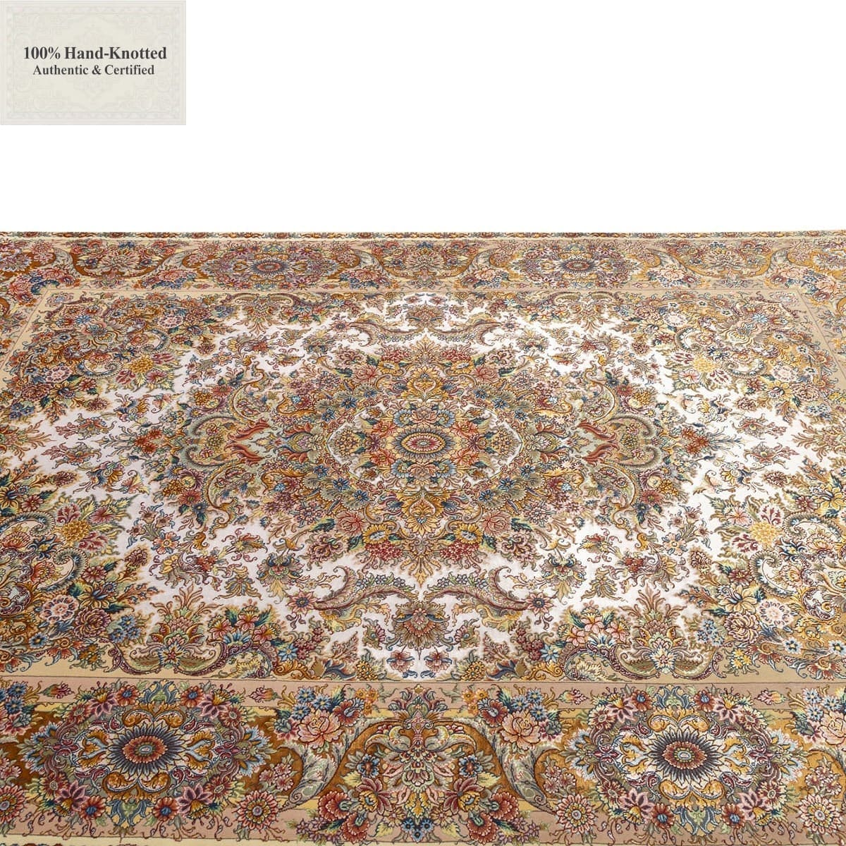Dieser Teppich ist handgeknüpft. Die Kette besteht aus Baumwolle, während der Flor aus Seide gefertigt ist. Die Feinheit wird mit 60 Raj angegeben, was einer Knotendichte von (ca. 900.000 Knoten / m²) entspricht. Das Gewicht beträgt 13,5 kg. Das Design wird als Khatibi angegeben.