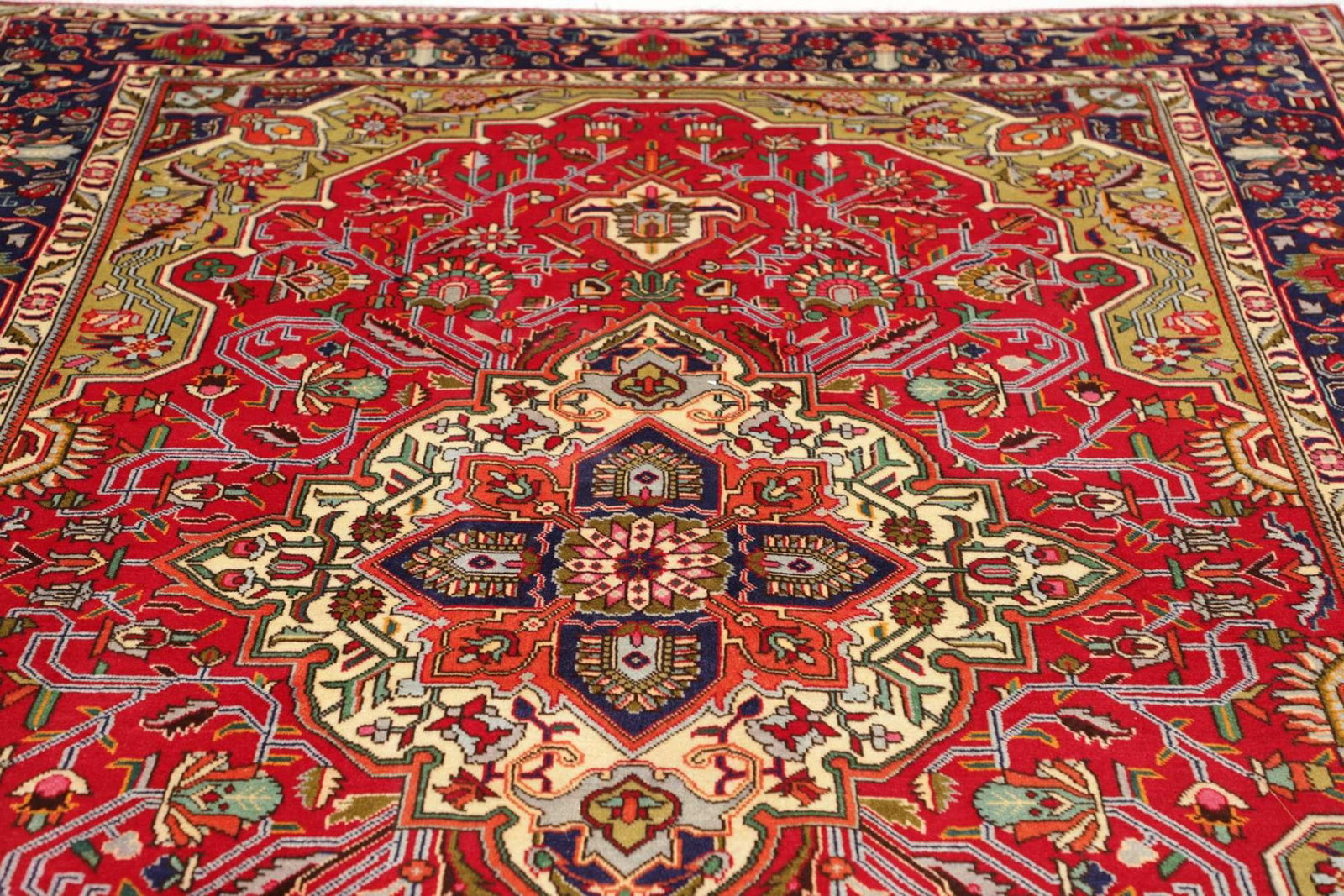 Der Täbriz-Teppich stammt aus der gleichnamigen Stadt im Iran, die für ihre jahrhundertealte Teppichknüpftradition bekannt ist. Täbriz gilt als eine der bedeutendsten Teppichhochburgen im Iran, wo die Kunst des Teppichknüpfens über Generationen hinweg weitergegeben wurde. Die Region ist berühmt für ihre exquisiten, handgeknüpften Teppiche, die durch ihre hohe Qualität und kreativen Designs bestechen. Die Tradition des Teppichknüpfens in Täbriz ist nicht nur eine handwerkliche Fertigung, sondern auch ein Ausdruck kultureller Identität und historischer Werte, die tief in der Geschichte des Iran verwurzelt sind.