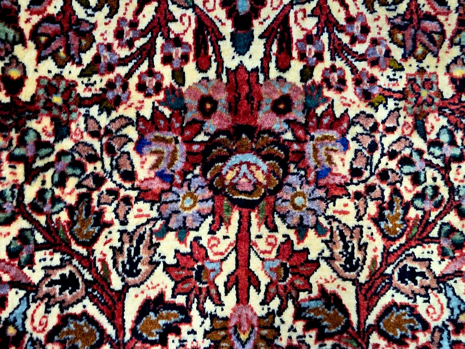 Die Designs von Bidjar-Teppichen sind häufig von floralen und geometrischen Mustern geprägt, die eine harmonische Komposition ergeben. Die Farbpalette reicht typischerweise von warmen Erdtönen bis hin zu kräftigen Rottönen, die mit Blau- und Beigetönen kombiniert werden. Diese harmonischen Farbkombinationen und die sorgfältige Anordnung der Motive spiegeln die hohe Handwerkskunst und den kulturellen Reichtum der Region wider. Bidjar-Teppiche sind bekannt für ihre Symmetrie und die Detailtiefe, die in jedem einzelnen Knoten zu finden ist.