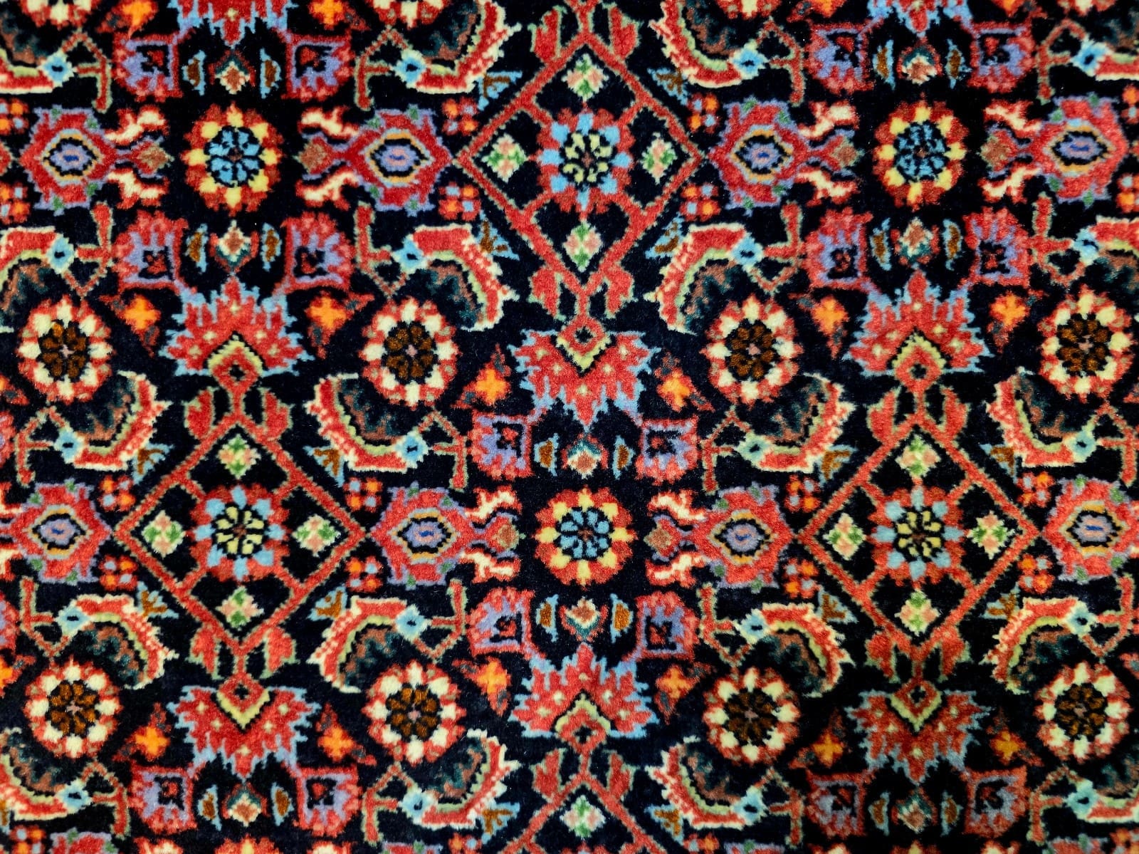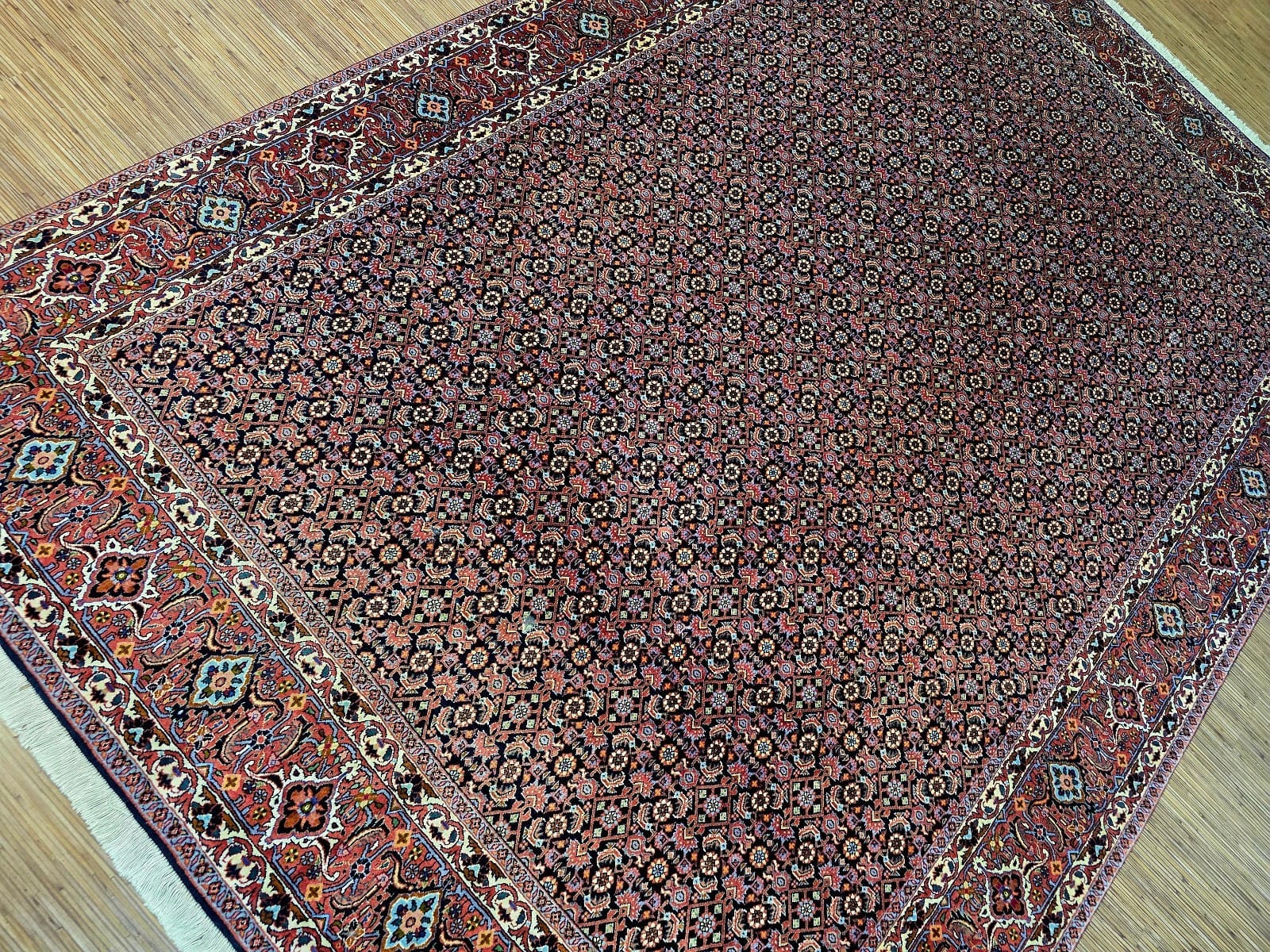 Teppiche aus Bidjar sind bekannt für ihre hohe Knotendichte, robuste Bauweise und detaillierte Muster, die oft florale und geometrische Designs kombinieren. Sie haben eine ausgeglichene Farbpalette, die in der Regel kräftige Rottöne, Blau- und Beigetöne umfasst.