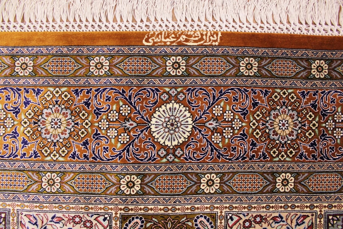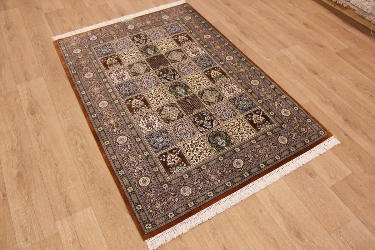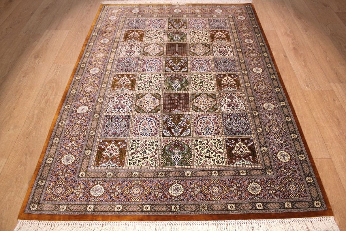 • Seidenteppich Ghom | Knotendichte: Exakte Knüpfung, fast 1000000 Knoten pro Quadratmeter | Muster: Quadratisch unterteilte Gartenteppiche, Jagdschilderungen, Vasenmuster | Größe: 155×101 cm | Material: Hochwertige Seide und Wolle | Zustand: Ausgezeichnet | Ursprung: Persien