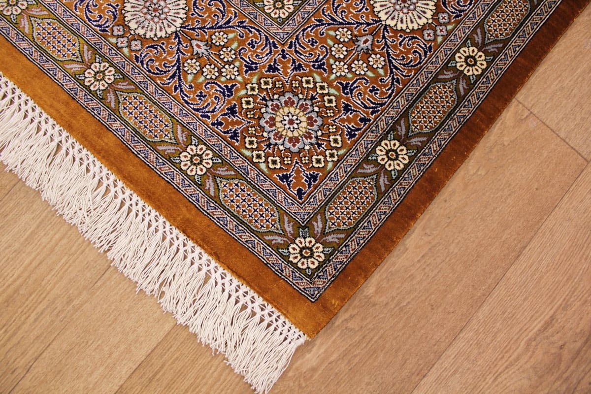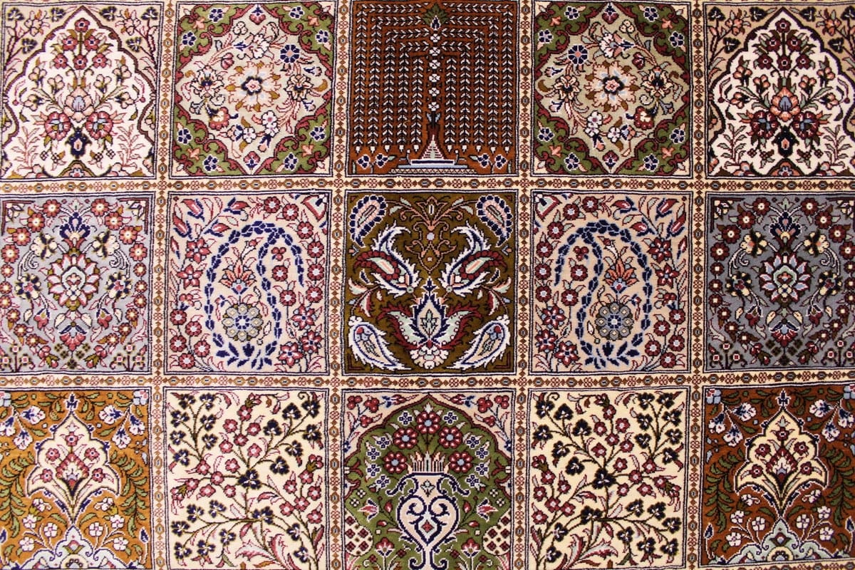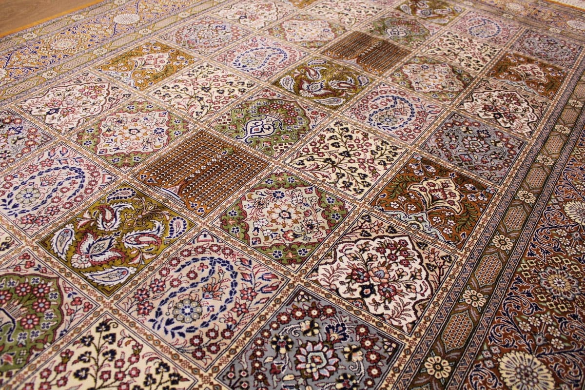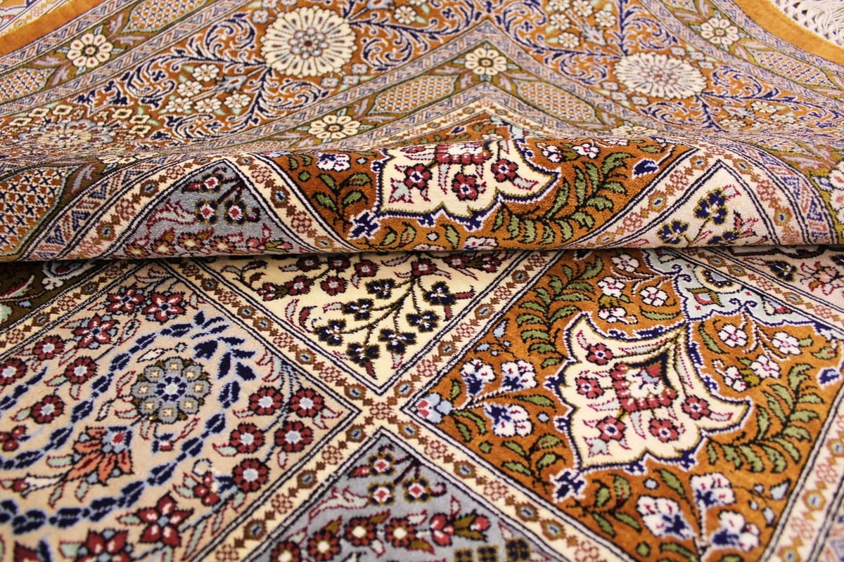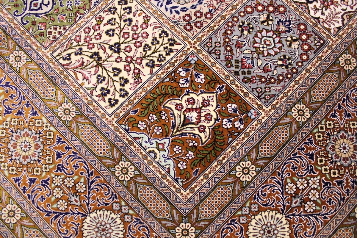 Das Feldermotiv, das in diesem Seidenteppich zu finden ist, ist ein charakteristisches Element vieler Perserteppiche. Es symbolisiert die Harmonie und das Gleichgewicht des Lebens. Die sorgfältig angeordneten Felder bieten Platz für verschiedene florale und geometrische Muster, die in lebendigen Farben ausgearbeitet sind. Diese Designs sind nicht nur ästhetisch ansprechend, sondern tragen auch kulturelle Bedeutungen und Geschichten, die über Generationen hinweg erzählt werden. Ein Teppich mit einem solch bedeutungsvollen Design wird sicher zum Blickfang in jedem Raum.