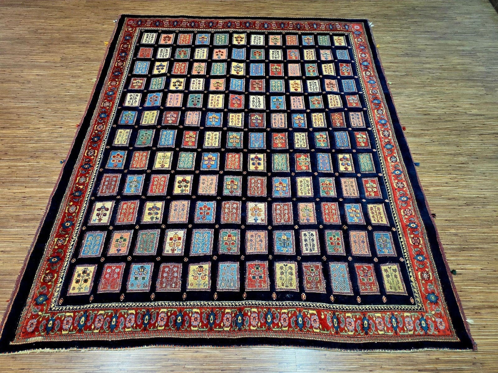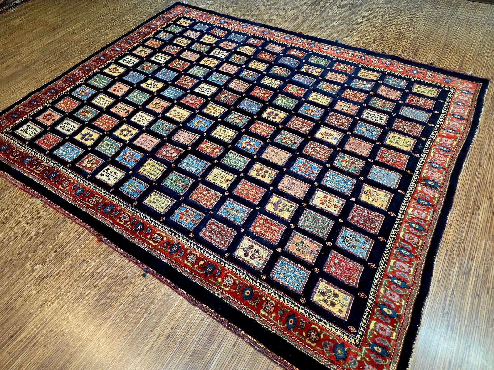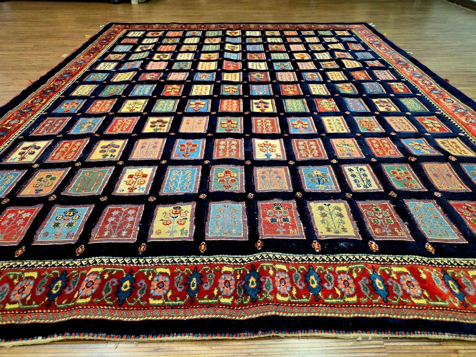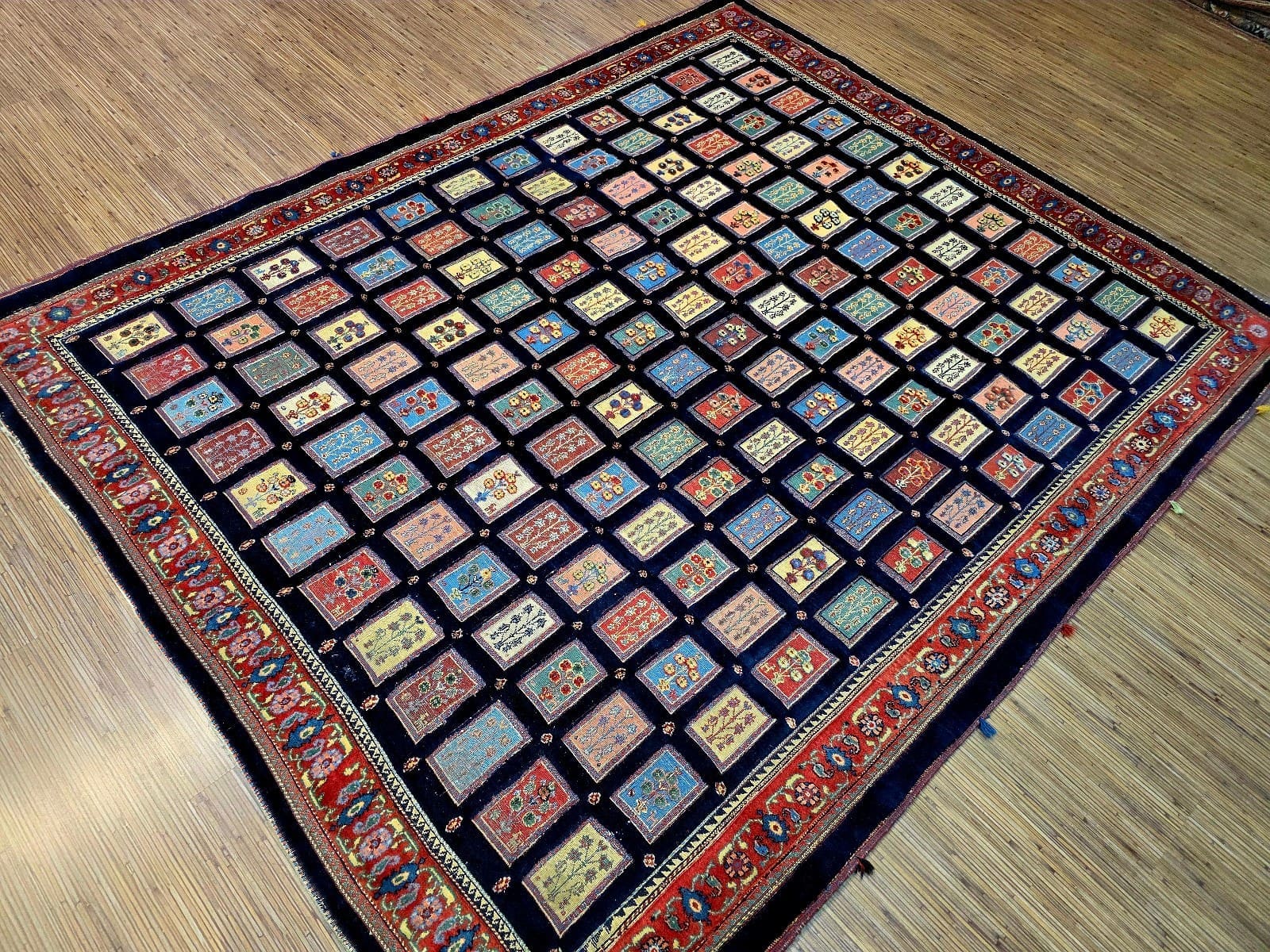 Dieser Teppich zeigt ein charakteristisches Feldmotiv, das für Loribaf-Teppiche typisch ist. Die Farben sind vielfältig und harmonisch aufeinander abgestimmt, was dem Teppich eine lebendige Ausstrahlung verleiht. Die Muster sind oft geometrisch und symmetrisch angeordnet, was die hohe Handwerkskunst der Region widerspiegelt. Die Detailtreue der Motive und die Verwendung von kräftigen, aber ausgewogenen Farben machen diesen Teppich zu einem einzigartigen Kunstwerk.