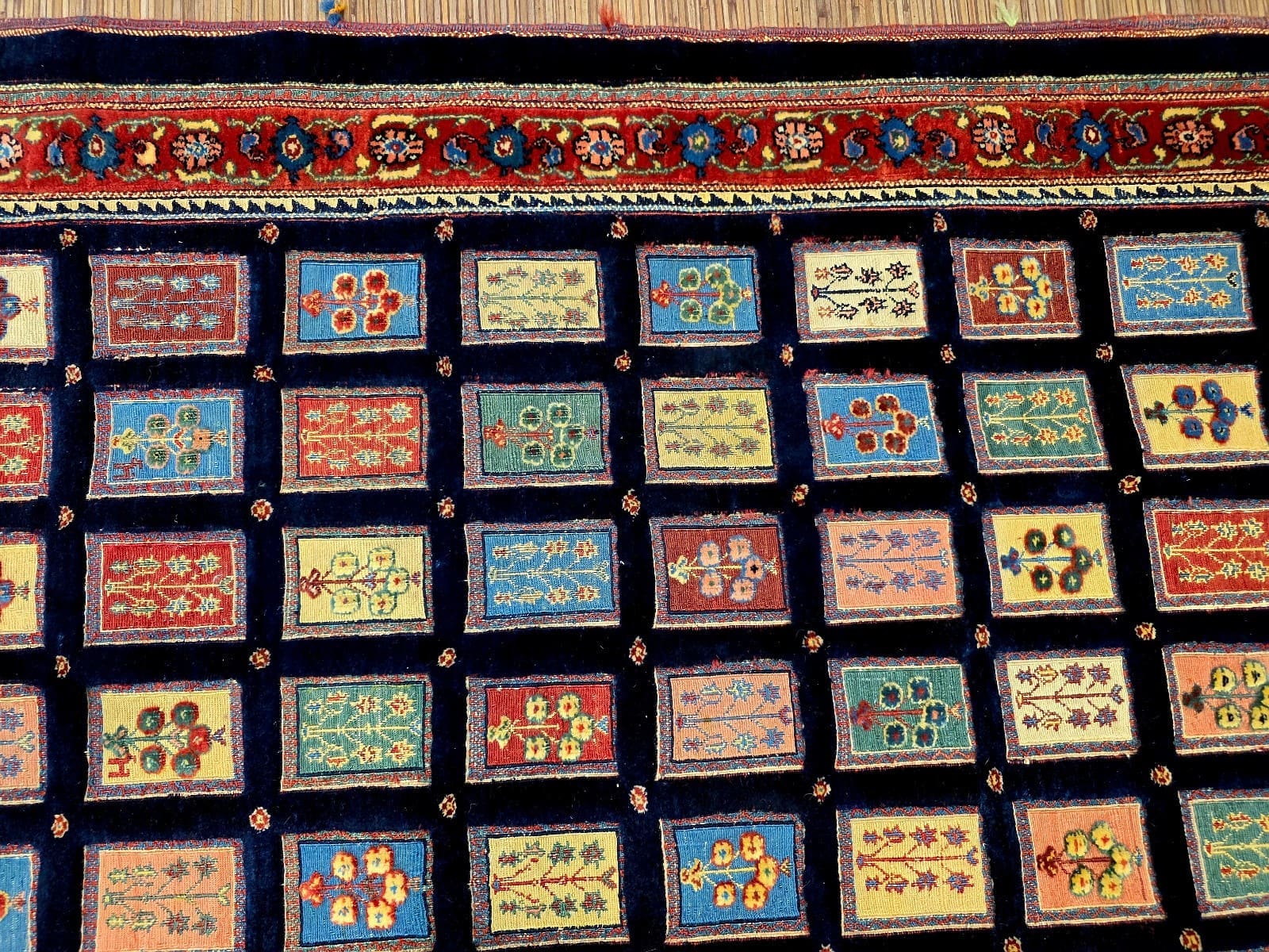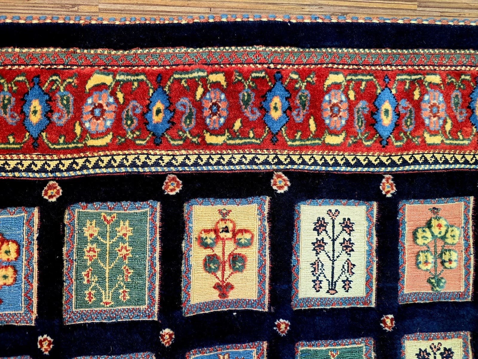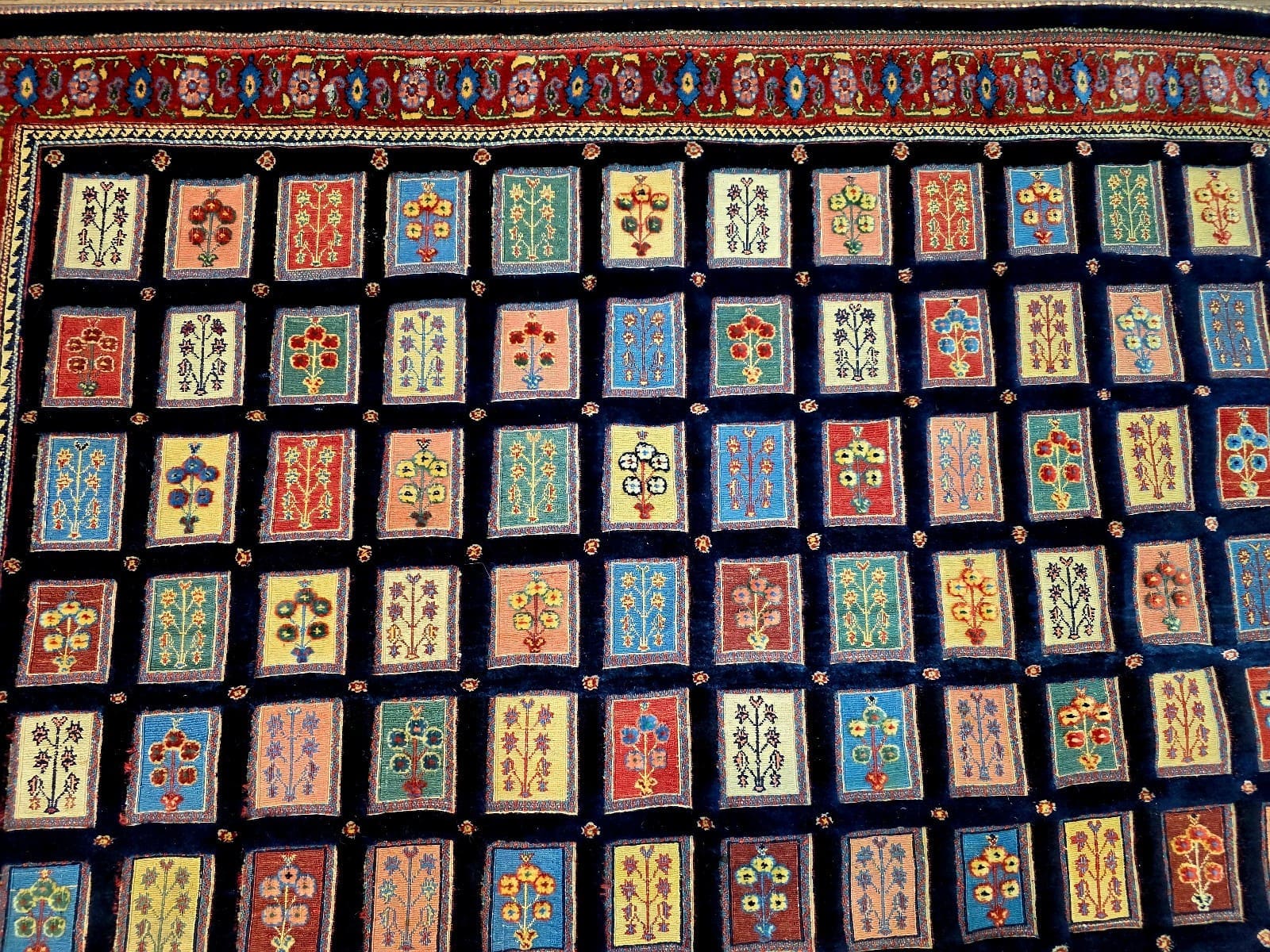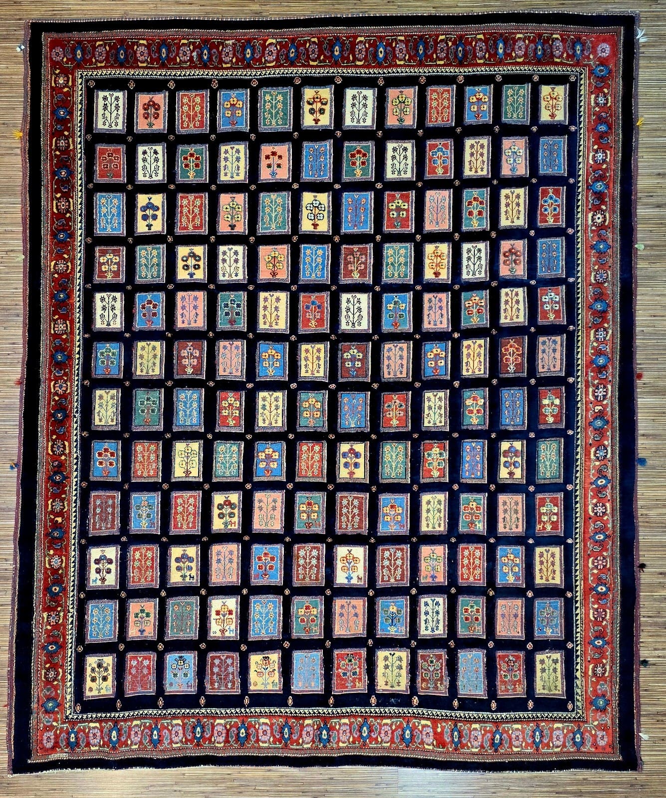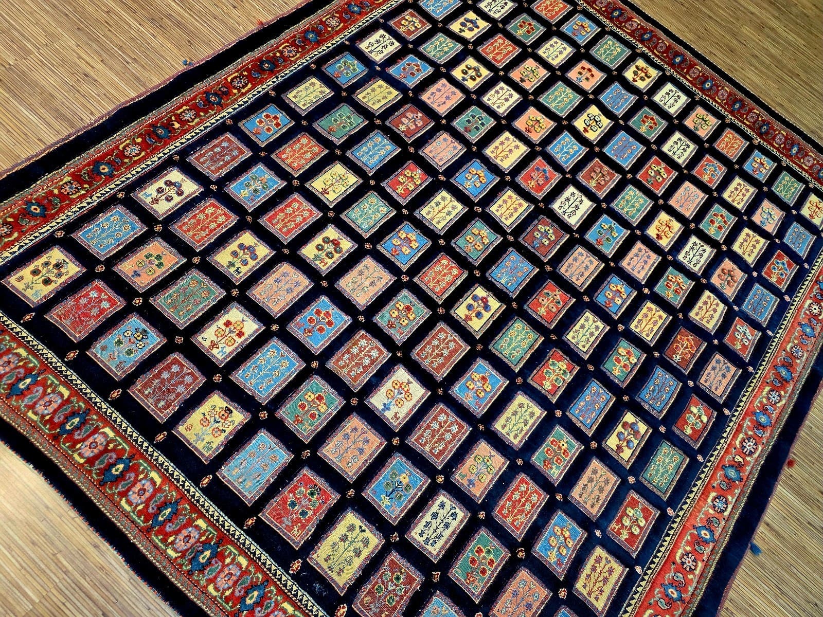Dieser Teppich zeigt ein charakteristisches Feldmotiv, das für Loribaf-Teppiche typisch ist. Die Farben sind vielfältig und harmonisch aufeinander abgestimmt, was dem Teppich eine lebendige Ausstrahlung verleiht. Die Muster sind oft geometrisch und symmetrisch angeordnet, was die hohe Handwerkskunst der Region widerspiegelt. Die Detailtreue der Motive und die Verwendung von kräftigen, aber ausgewogenen Farben machen diesen Teppich zu einem einzigartigen Kunstwerk.