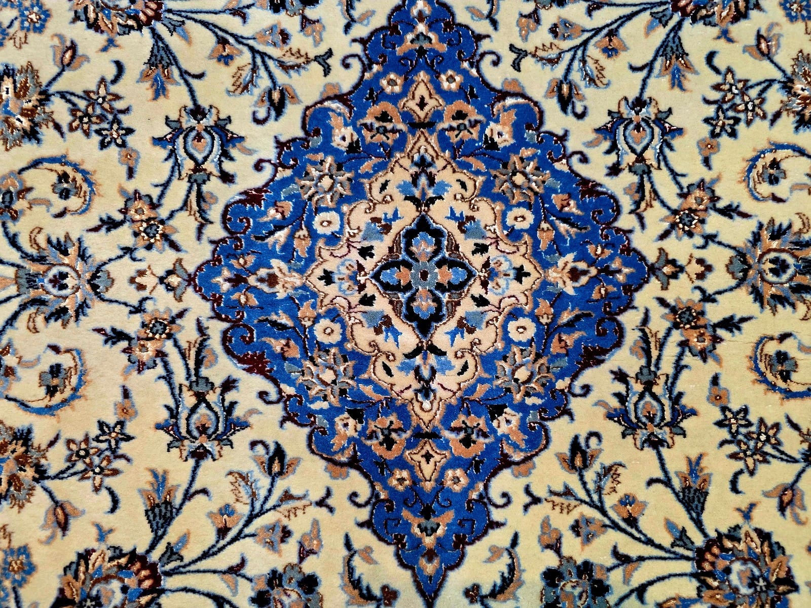 Nain-Teppiche zeichnen sich durch ihre feine Knotung, florale Designs und eine elegante Farbpalette aus. Sie sind bekannt für ihre hohe Knotendichte und die Verwendung edler Materialien wie Seide und Wolle.