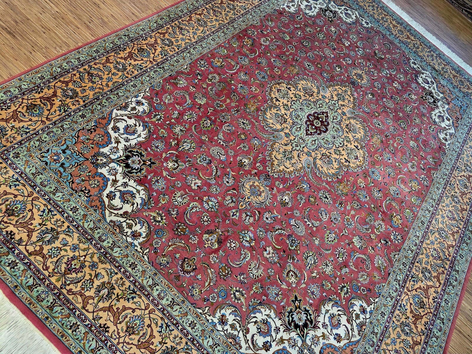 Teppiche aus Täbriz sind bekannt für ihre feinen Knüpfungen, floralen Muster und eine hohe Knotendichte. Die Verwendung von Korkwolle und Seide im Flor sorgt für eine luxuriöse Haptik und Optik.