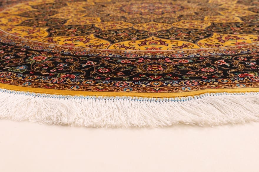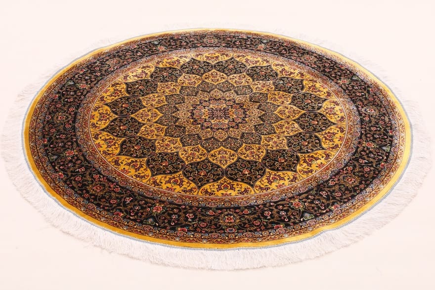 Designer-Teppich | Knotendichte: Hoch | Material: Kunstseide | Größe: 202×201 cm | Farbe: Braun/Gelb | Form: Rund | Zustand: Neuzeitlich (0-20 Jahre) | Ursprung: Iran/Persien | Verarbeitung: Hand & Machine | Dicke: ca. 6 mm