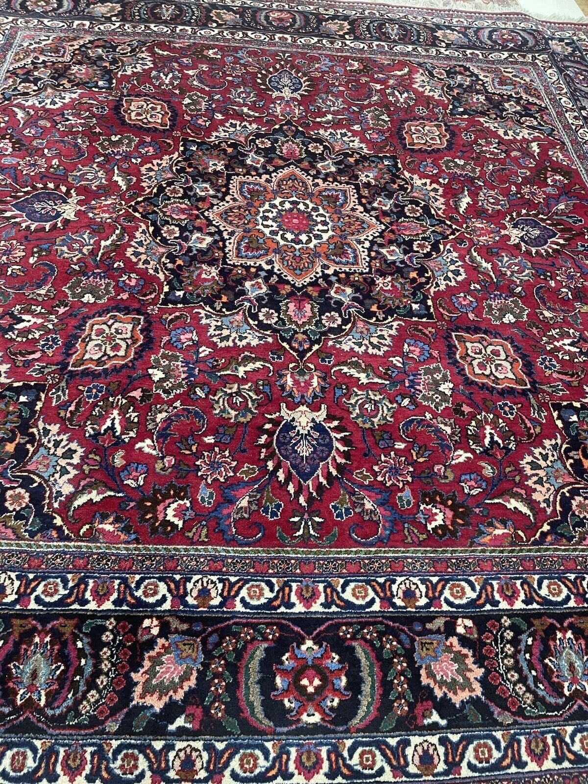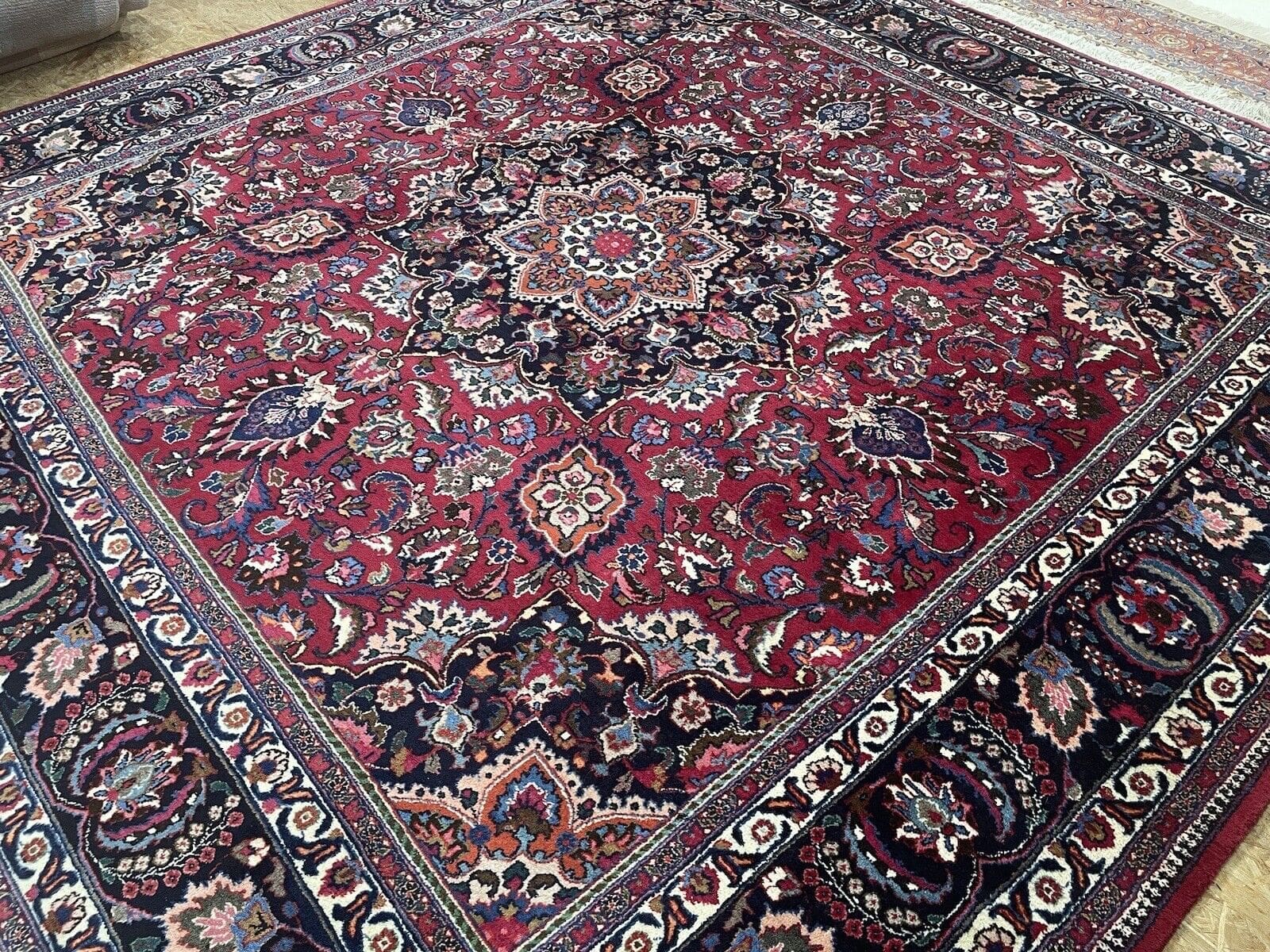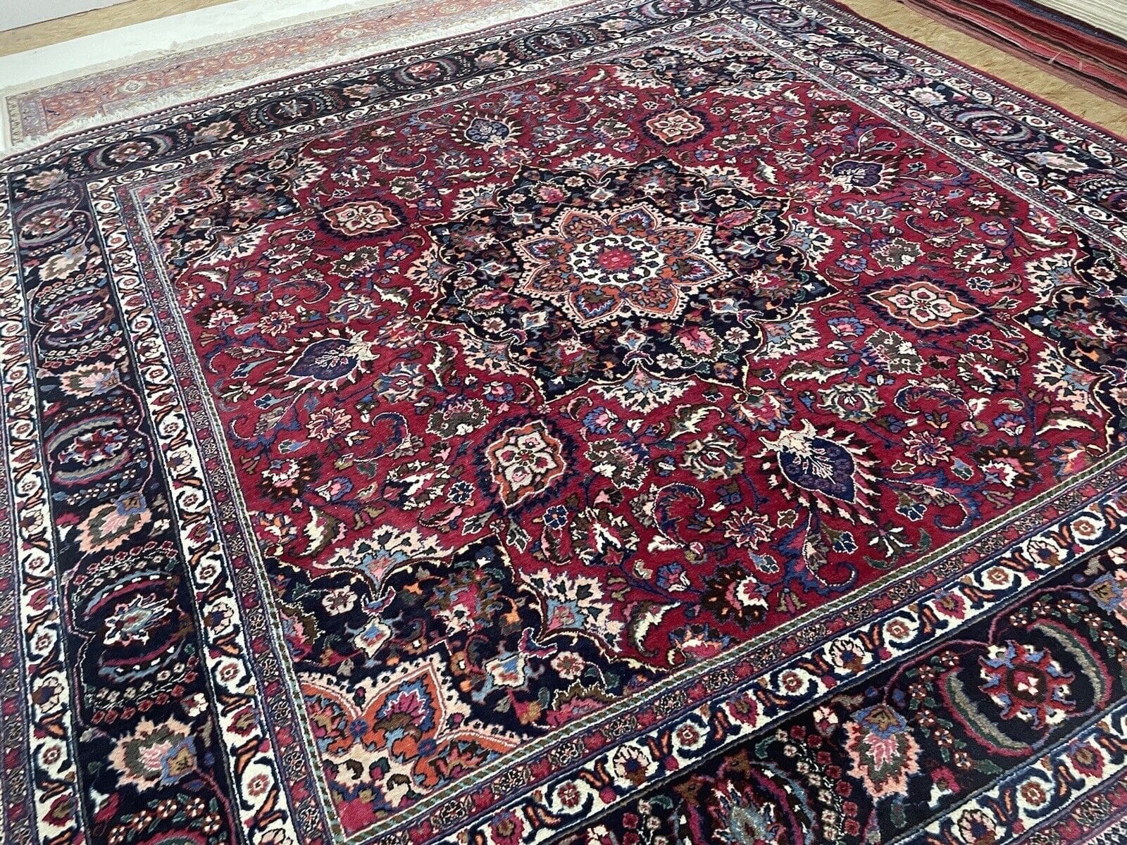 Handgeknüpfter persischer Teppich | Größe: 300 x 300 cm | Knotendichte: Hochwertige Verarbeitung | Material: Wolle mit Baumwoll-Kettfaden | Muster: Florales Design mit Medaillon und breiter blauer Bordüre | Zustand: Gebraucht, aber gut erhalten | Florhöhe: 8 mm | Geeignet für Fußbodenheizung | Stil: Traditionell Persisch/Orientalisch | Ursprungsort: Maschad