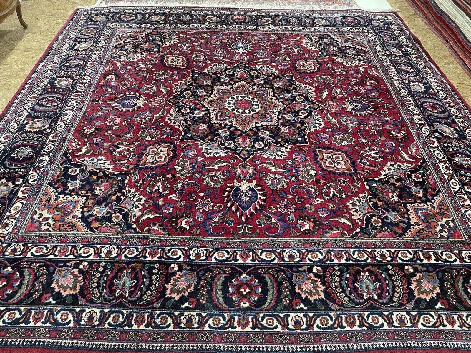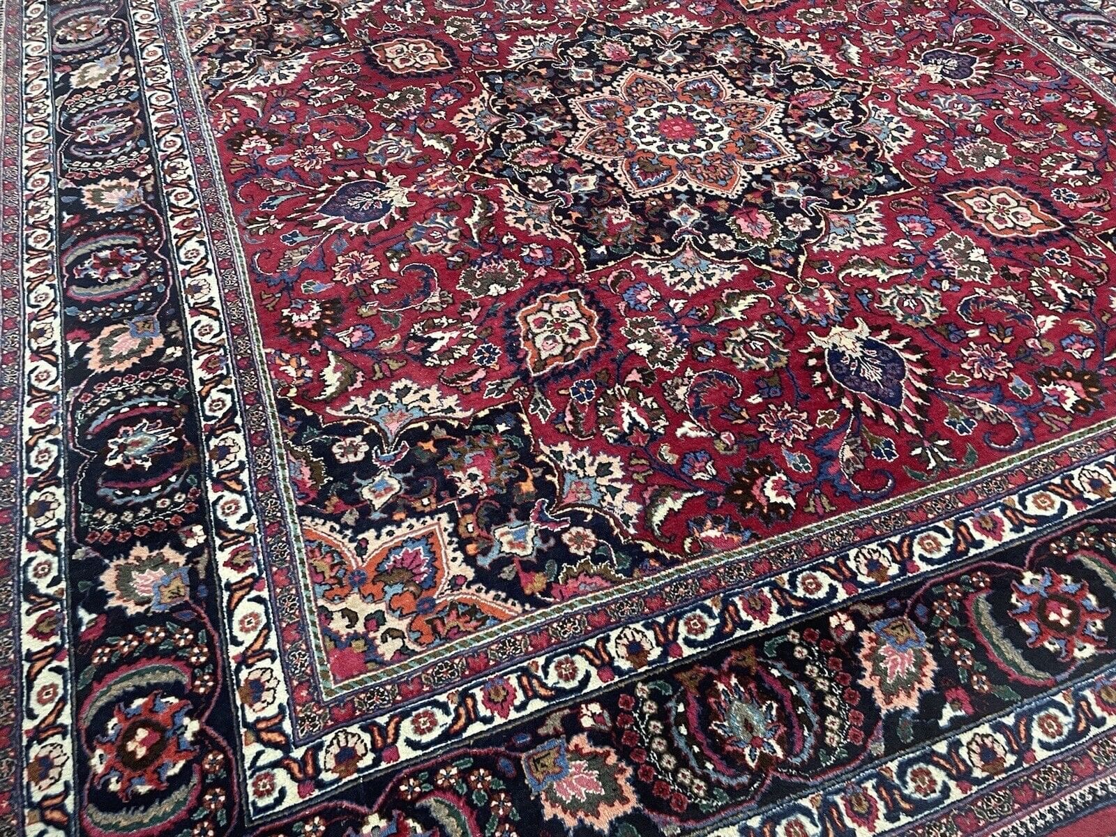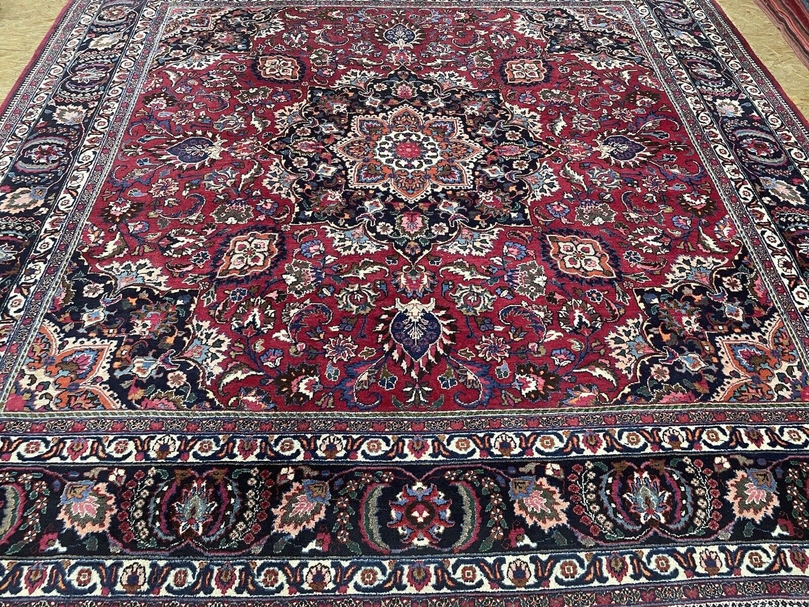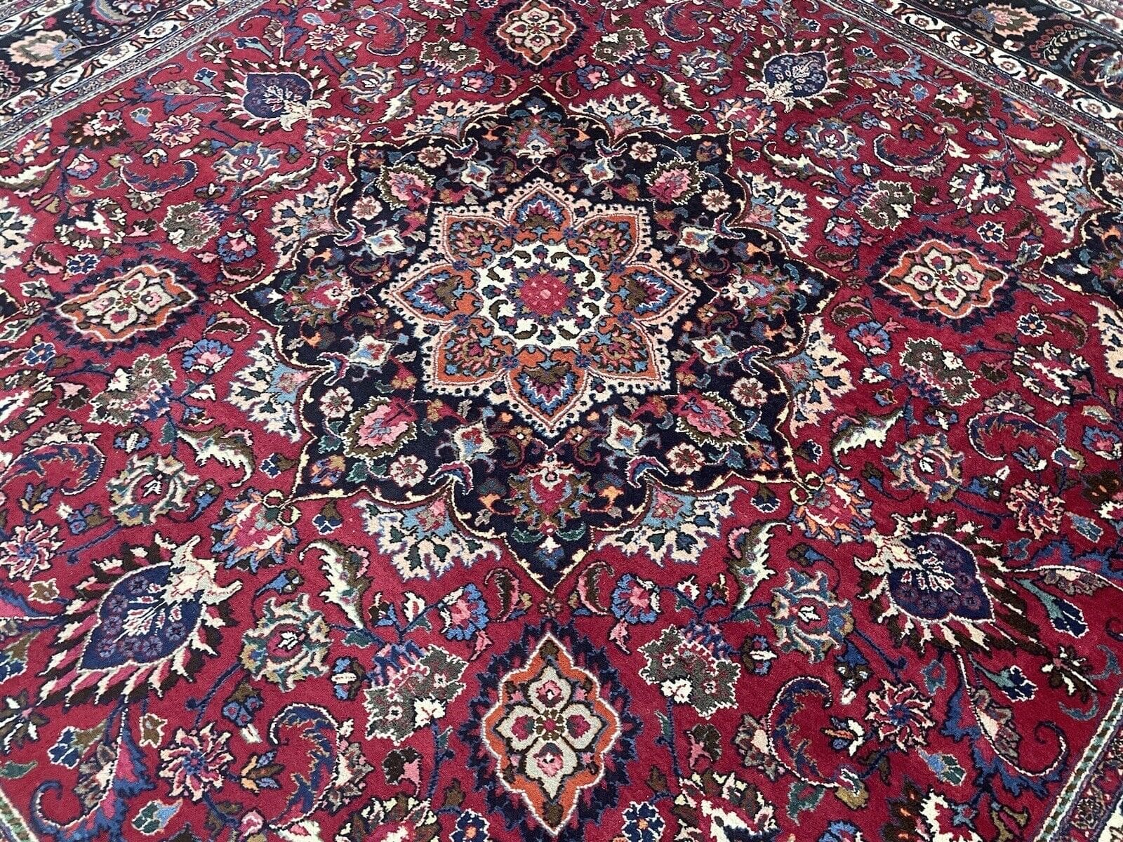 Handgeknüpfter persischer Teppich | Größe: 300 x 300 cm | Knotendichte: Hochwertige Verarbeitung | Material: Wolle mit Baumwoll-Kettfaden | Muster: Florales Design mit Medaillon und breiter blauer Bordüre | Zustand: Gebraucht, aber gut erhalten | Florhöhe: 8 mm | Geeignet für Fußbodenheizung | Stil: Traditionell Persisch/Orientalisch | Ursprungsort: Maschad