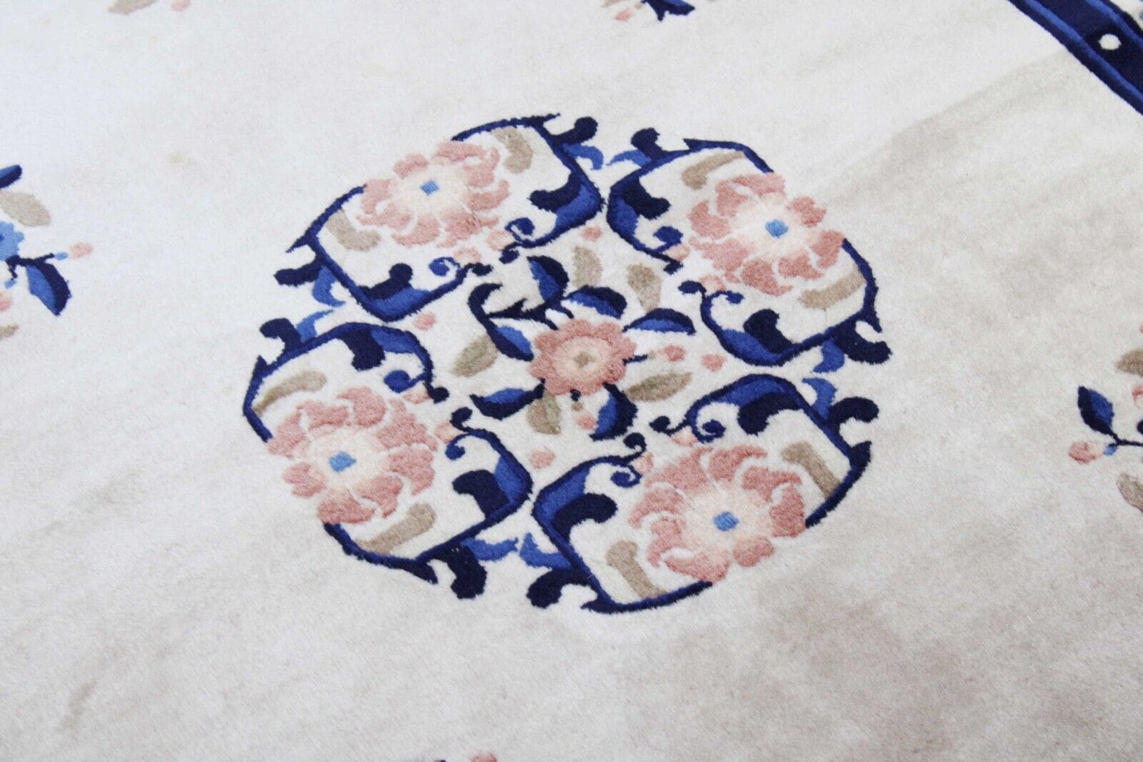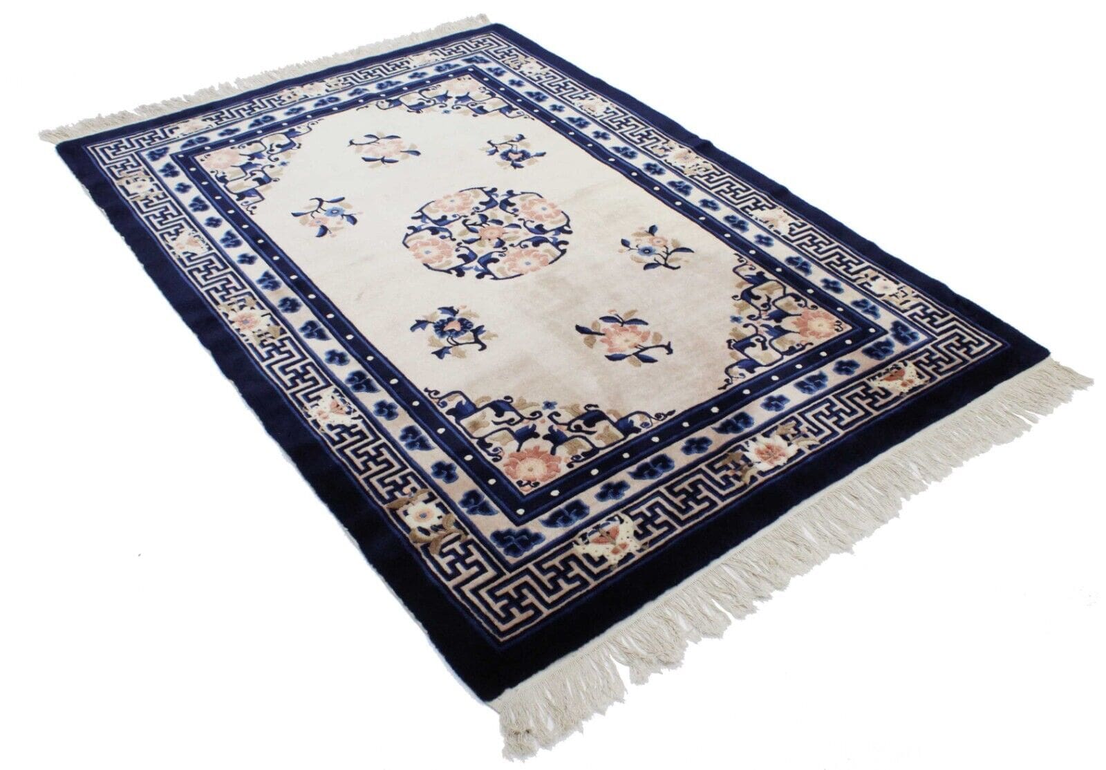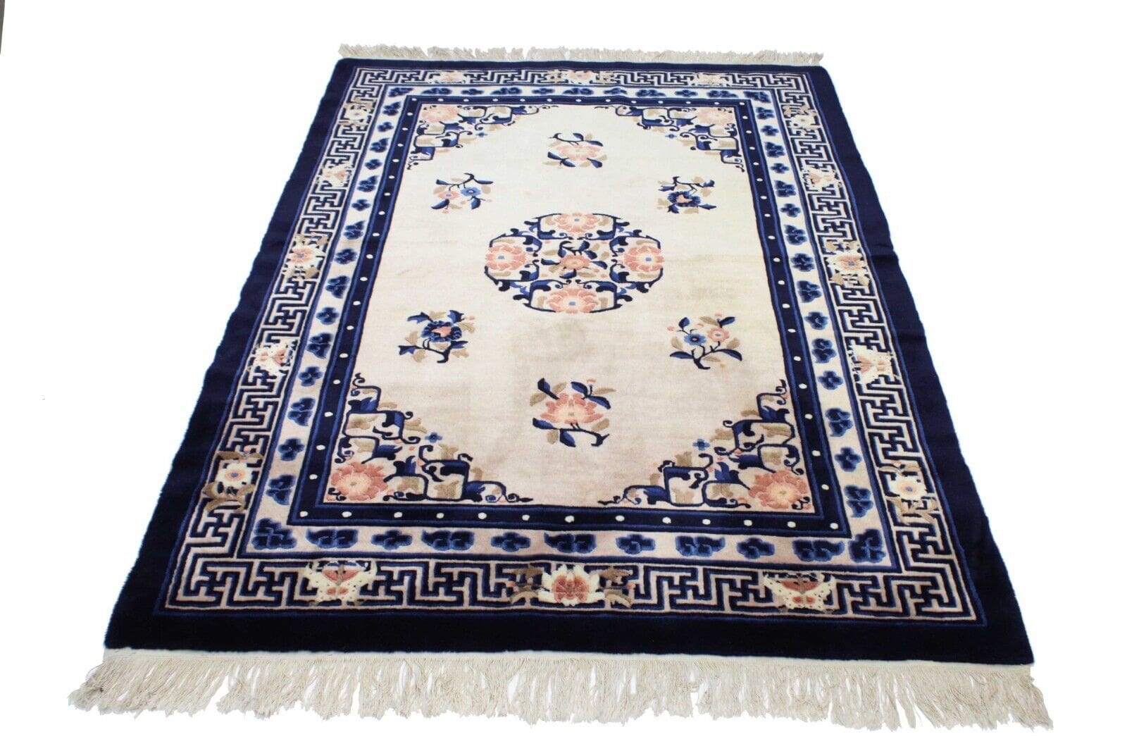 Handgeknüpfter Teppich im Blumen Design | Größe: 202 x 140 cm | Material: 100% Baumwolle und 100% Wolle | Muster: Abstrakt mit 3D-Effekt | Zustand: Gebraucht, semi-antike Art | Herkunft: Peking, China | Stil: Modern, geeignet für alle Zimmer | Florhöhe: Normal | Herstellungsmethode: Handgeknüpft | Herstellungszeitraum: 2000-2009 | Farbe: Beige | Für Fußbodenheizung geeignet