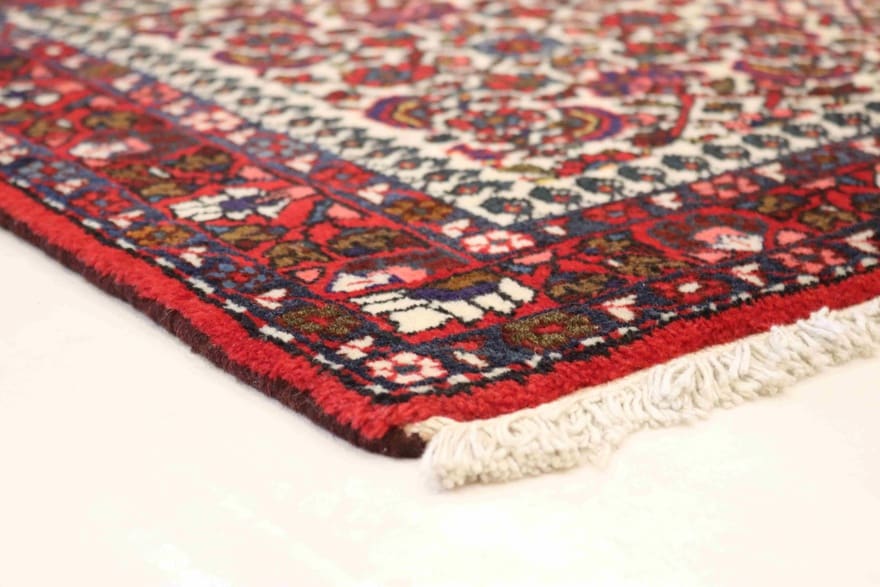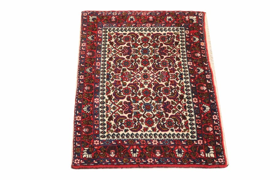 Teppich ID: 739988900377 | Zustand: Neu | Farbe: Weiß/Beige | Knotendichte: 160.000 – 200.000 Knoten/m² | Material: Handgesponnene Wolle, Kette aus Baumwolle | Größe: 109×71 cm | Form: Rechteckig | Dicke: ca. 6 mm | Gewicht: ca. 2 kg | Ursprung: Iran/Persien