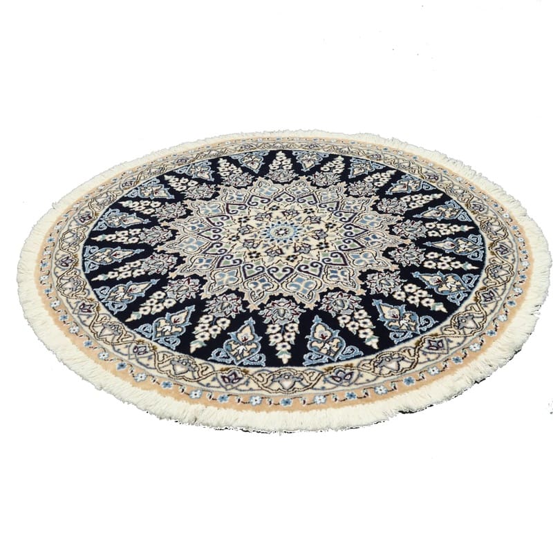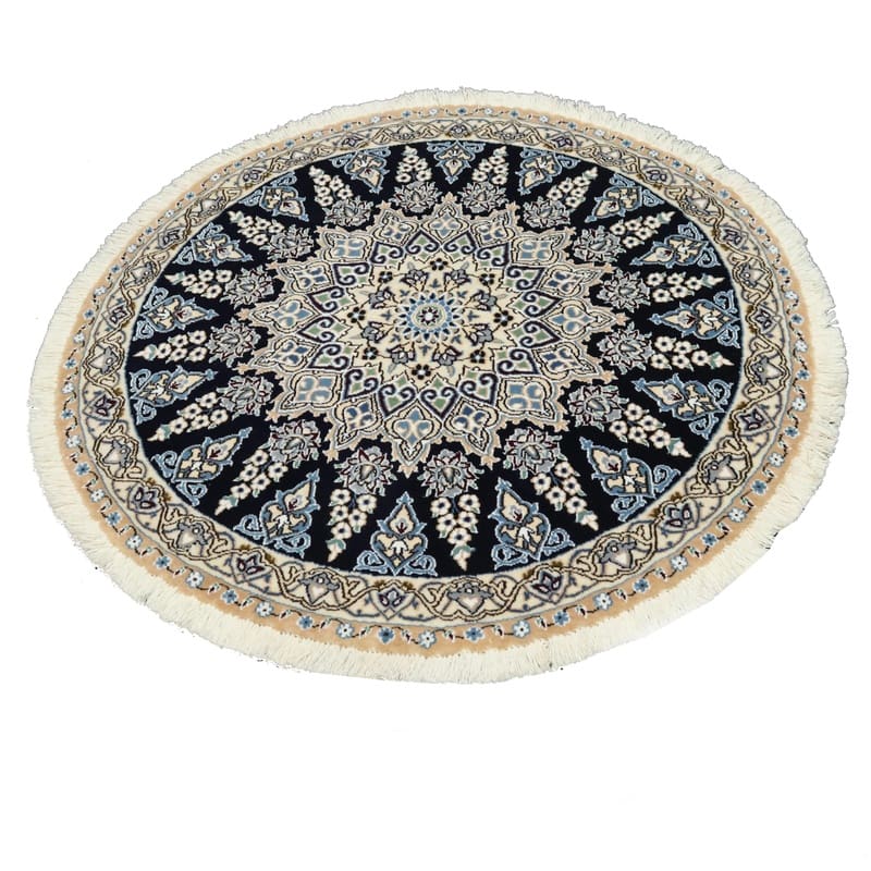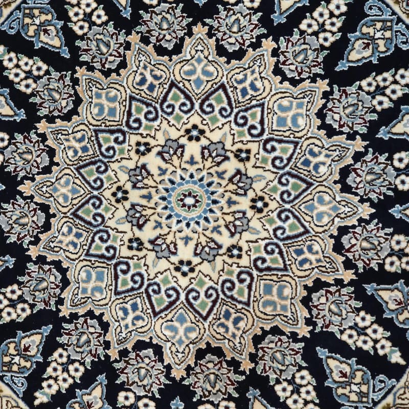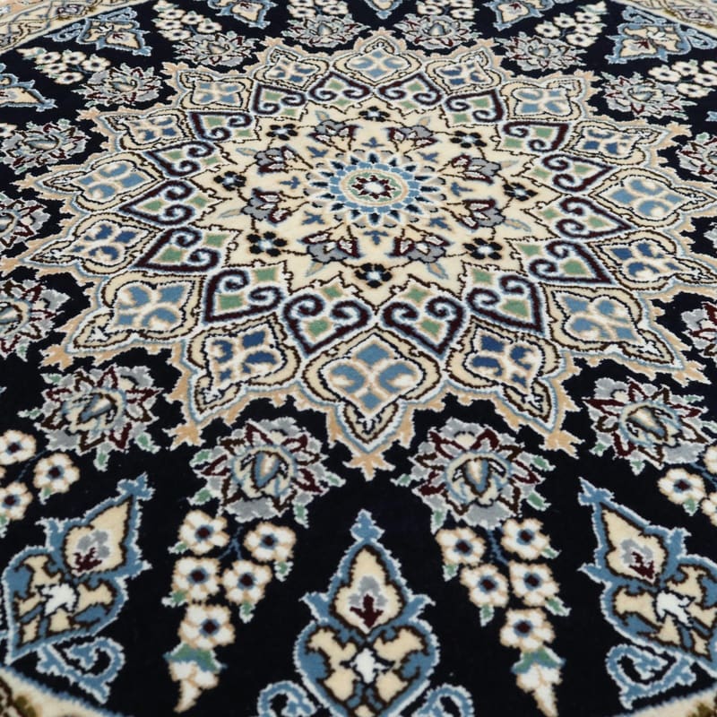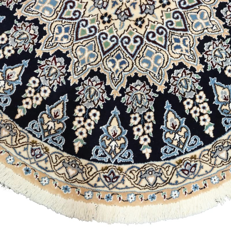 Runder Nain 9 La Teppich | Knotendichte: 440.000 – 490.000 Knoten/m² | Material: Wolle und Seide | Größe: 114×113 cm | Farbe: Nachtblau mit zarten Blumenmustern | Zustand: Neu | Ursprung: Iran / Persien | Handgeknüpft | Gewicht: ca. 5 kg | Dicke: ca. 8 mm