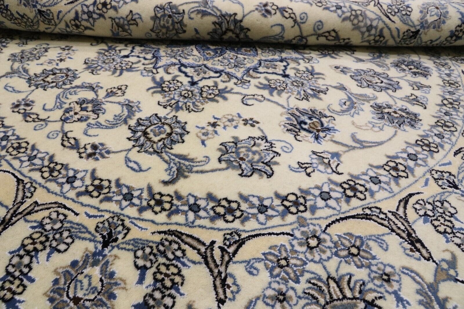 Der runde Perserteppich aus hochwertiger Schurwolle und Seide ist ein wahres Meisterwerk traditioneller Handwerkskunst. Mit einer beeindruckenden Knotendichte von 300.000 Knoten pro Quadratmeter wird dieser Teppich nicht nur zum Blickfang in jedem Raum, sondern bietet auch eine außergewöhnliche Strapazierfähigkeit und Langlebigkeit. Das handgeknüpfte Design zeugt von hoher Präzision und Hingabe, die in jedes einzelne Detail eingeflossen sind. Dieser Teppich vereint klassisches Design mit modernem Stil und ist die perfekte Ergänzung für jedes Zuhause.