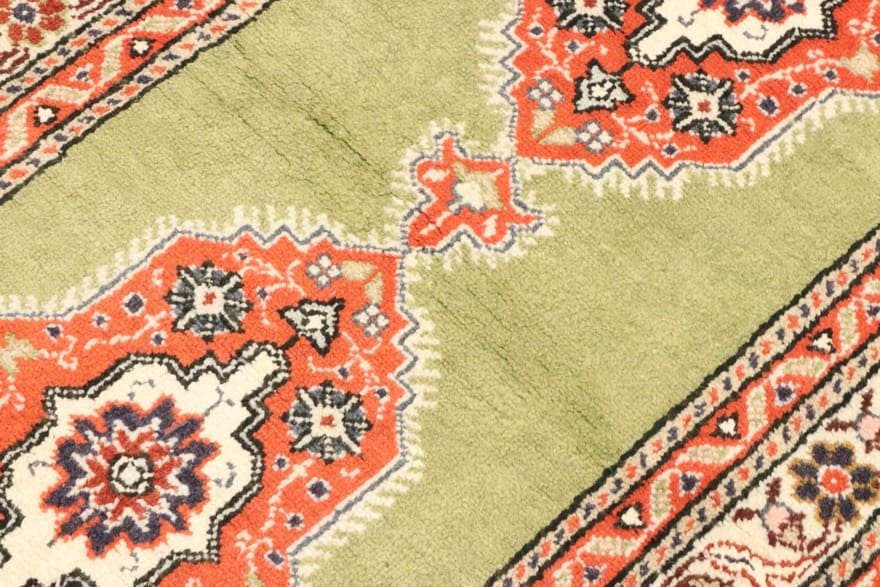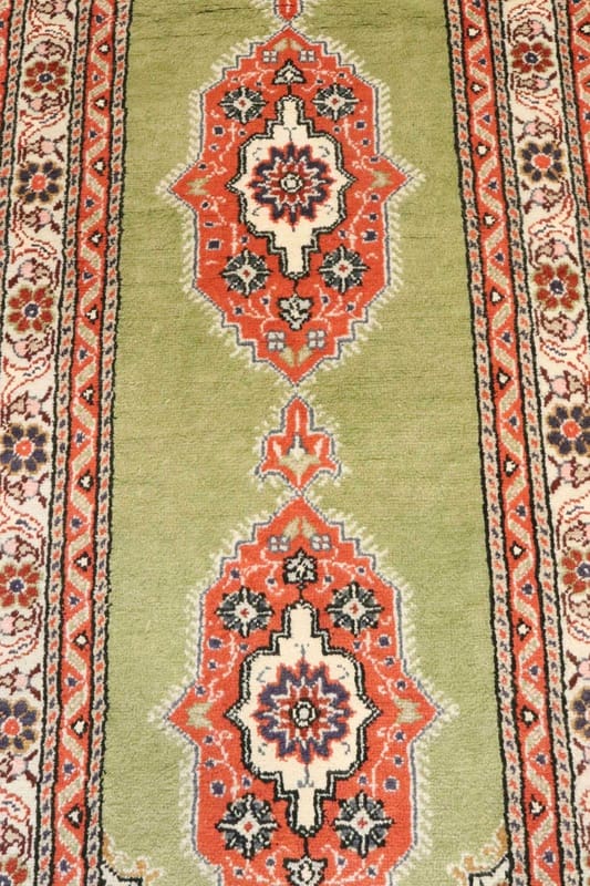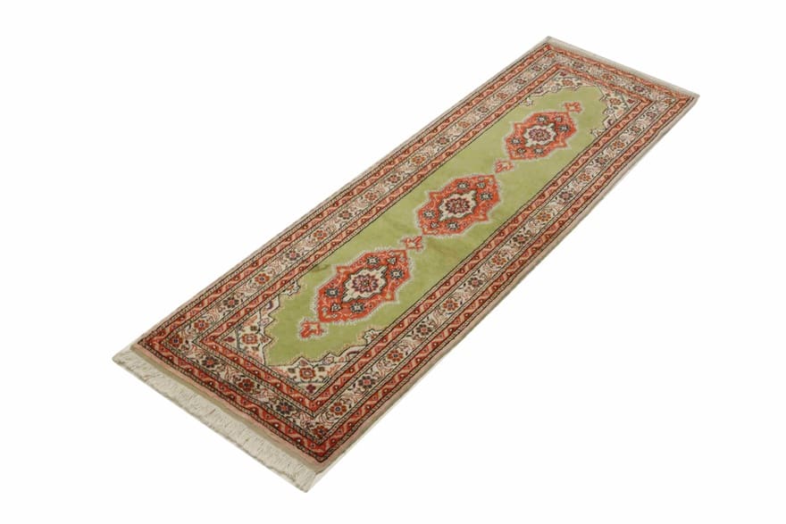 Handgeknüpfter Kaschmir-Teppich | Knotendichte: 160.000 – 200.000 Knoten/m² | Material: Wolle und Baumwolle | Größe: 184×61 cm | Farbe: Grün/Oliv | Zustand: Neu | Ursprung: Türkei | Florhöhe: ca. 4 mm