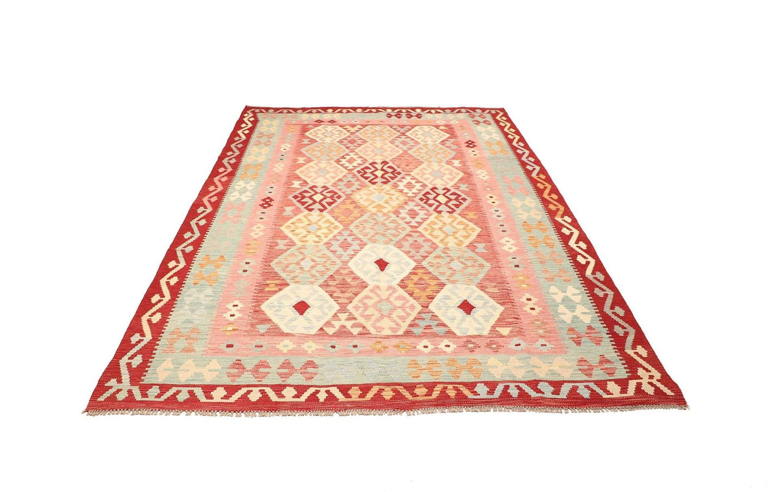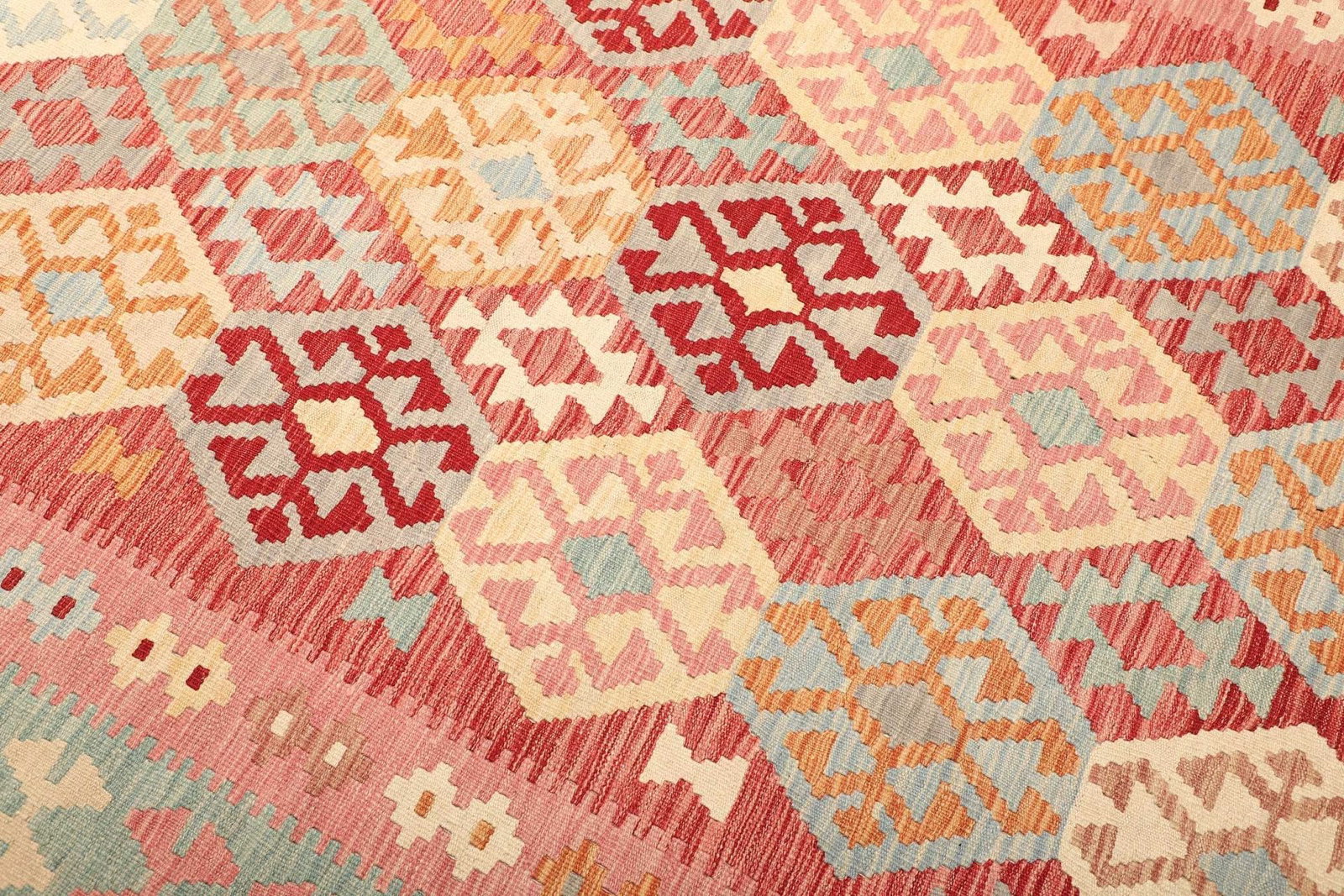 1022$Ursprünglicher Preis war: 1022$847$Aktueller Preis ist: 847$Kelim Teppich | Knotendichte: ca. 200.000 Knoten/m² | Material: 100% Schurwolle | Größe: 209 x 297 cm | Herkunft: Pakistan | Zustand: Handgewebte Qualität | Florhöhe: ca. 5 mm | Kette: 100% Baumwolle