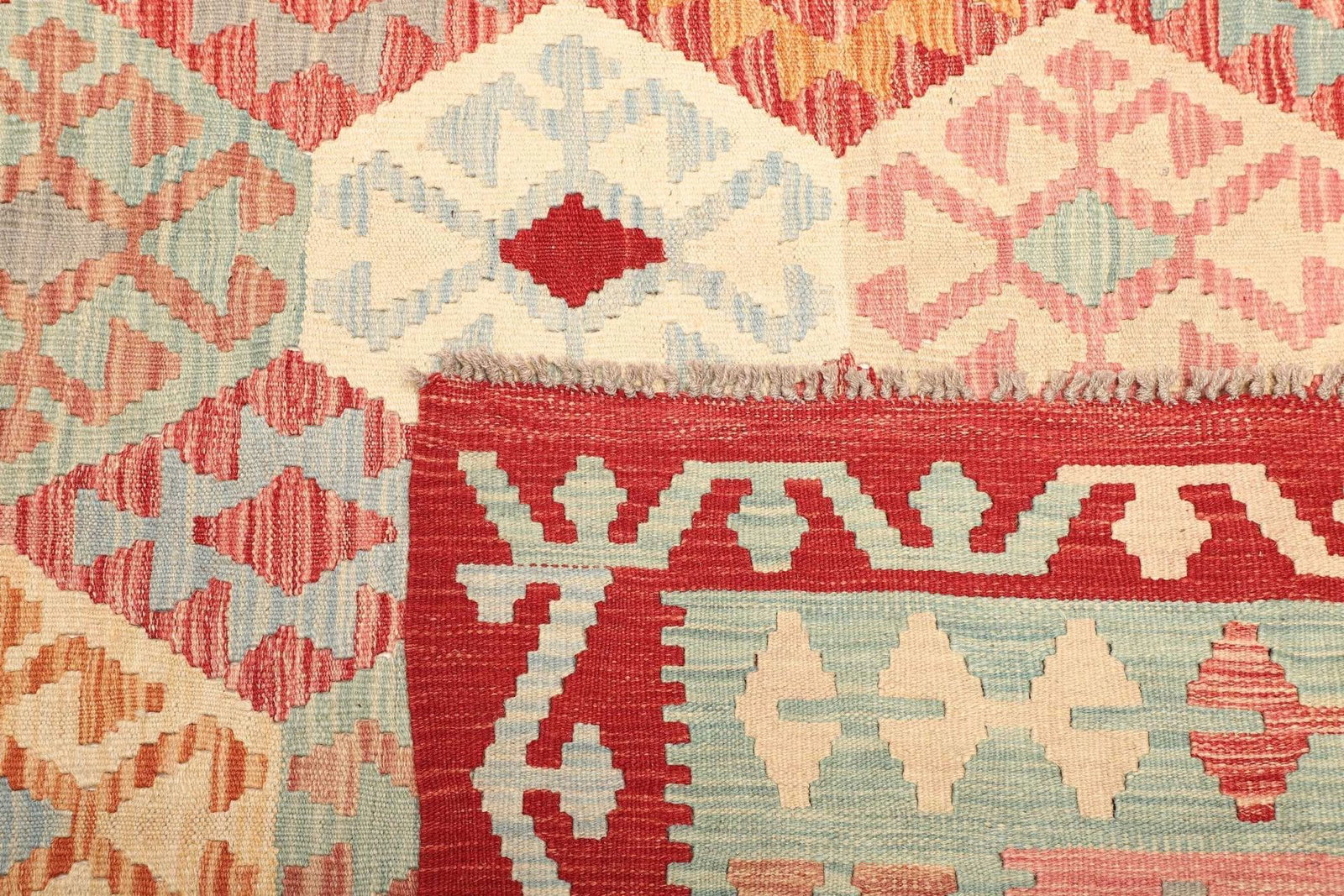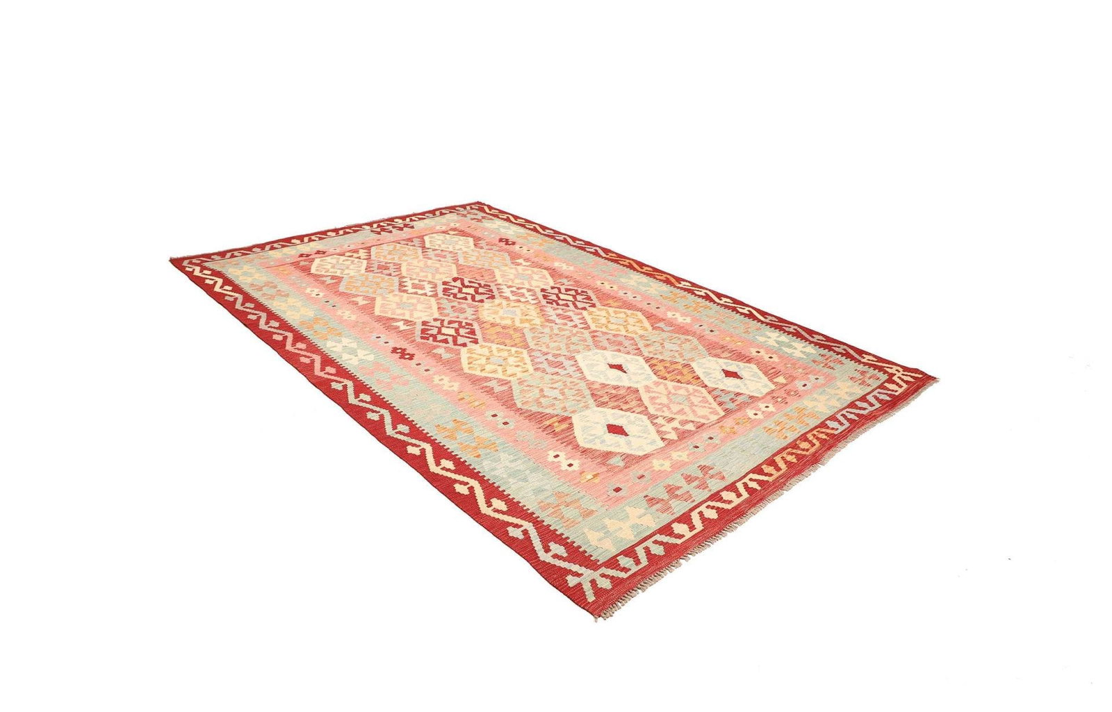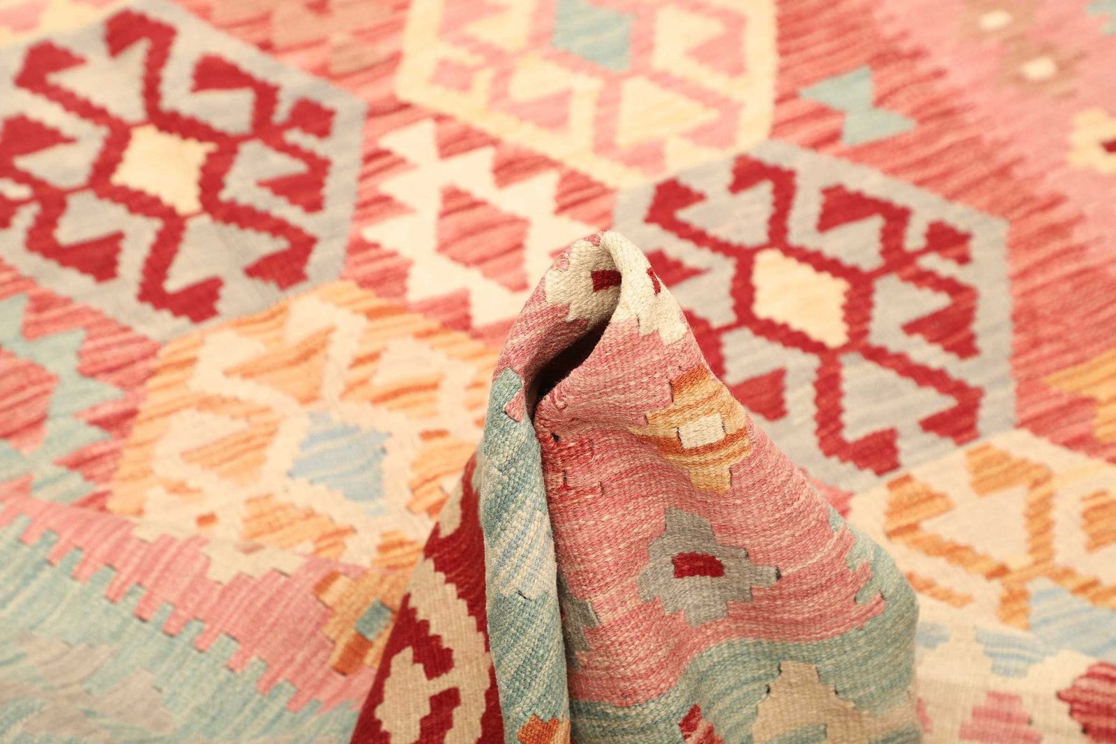 Der verwendete Schurwollstoff garantiert eine hervorragende Qualität und Komfort. Schurwolle ist nicht nur besonders weich, sondern auch temperaturausgleichend und trittschalldämmend. Ihre natürliche Beschaffenheit macht sie resistent gegen Staub und Schmutz, weshalb sich der Teppich äußerst pflegeleicht zeigt. Die handgewebte Technik, die für diesen Kelim verwendet wird, erfordert viel Geschick und Erfahrung und macht jeden Teppich zu einem Unikat.