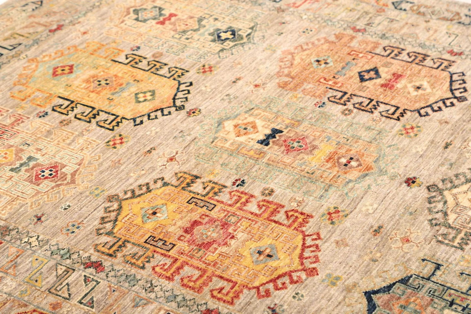 Der Samarkand Orientteppich ist aus feiner Schurwolle gefertigt, die für ihre Strapazierfähigkeit und ihren luxuriösen Glanz bekannt ist. Schurwolle ist nicht nur angenehm fußwarm, sondern weist auch eine besondere Widerstandsfähigkeit gegen Flecken und Abnutzung auf. Dies macht den Teppich ideal für Wohnräume, in denen er intensiv genutzt wird. Die handgeknüpfte Technik bedeutet, dass jeder Teppich ein Unikat ist, das mit viel Können und Geduld geschaffen wurde. Die Knotendichte ist hoch, was bedeutet, dass der Teppich sehr langlebig ist und über Jahre hinweg seine Schönheit behält.
