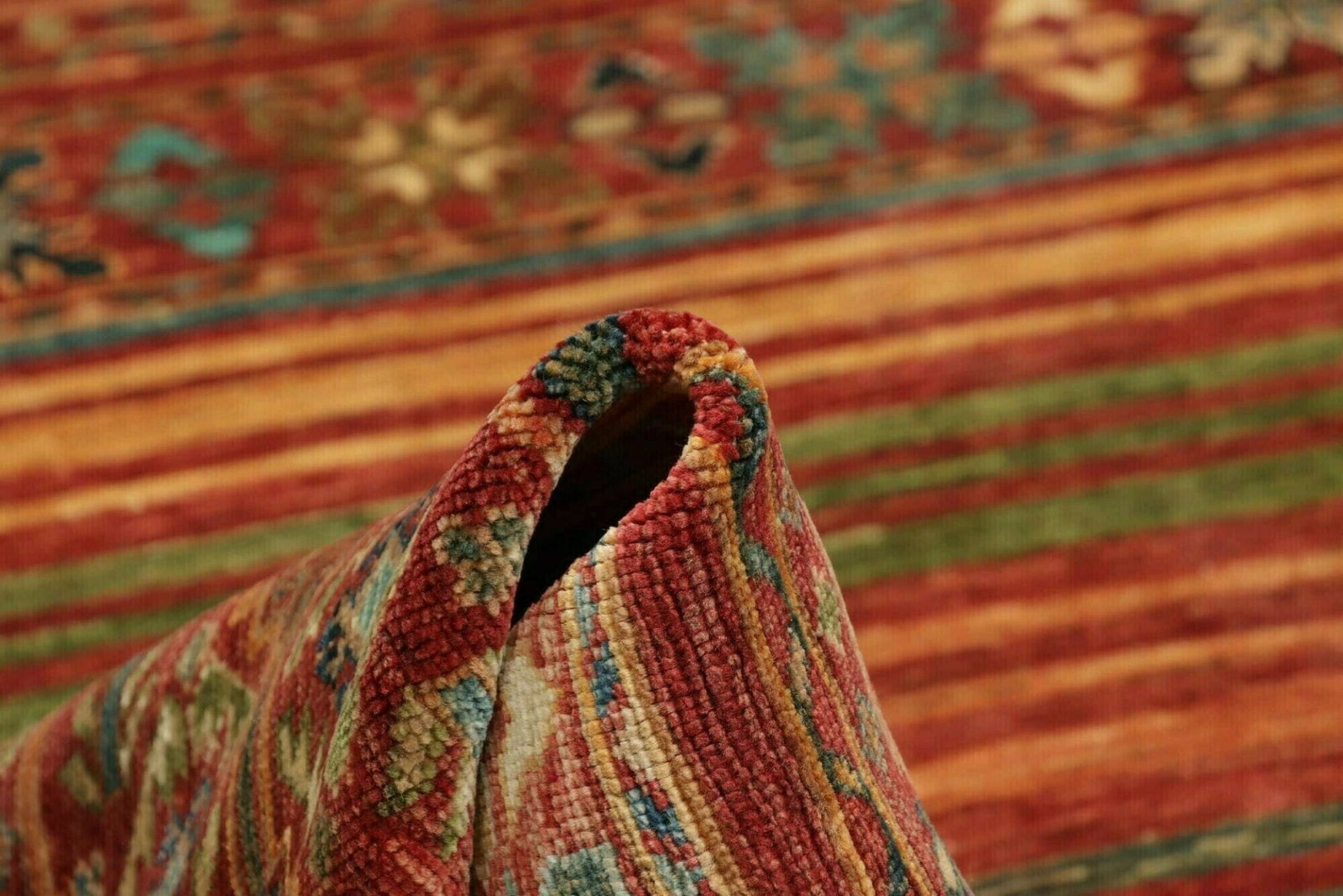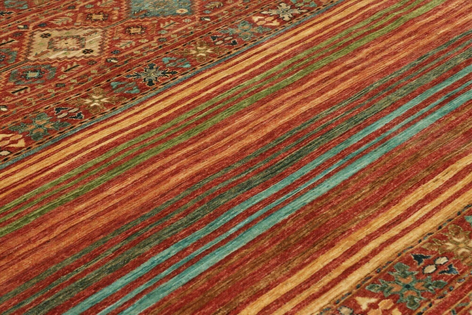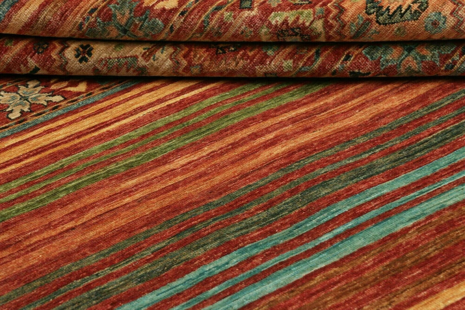 Die Wahl von Wolle als Hauptmaterial ist besonders vorteilhaft, da Wolle für ihre Robustheit, Wärmedämmung und natürliche Schönheit bekannt ist. Der Teppich wird in aufwendiger Handarbeit geknüpft, was zu einer hohen Knotendichte führt und sicherstellt, dass das Muster detailreich und lebendig zur Geltung kommt. Diese sorgfältige Verarbeitung macht den Teppich nicht nur zum idealen Bodenbelag, sondern auch zu einem wertvollen Sammlerstück. Die Farbpalette und die Struktur der Wolle tragen zu einem angenehmen Raumklima bei und bieten eine angenehme Haptik.
