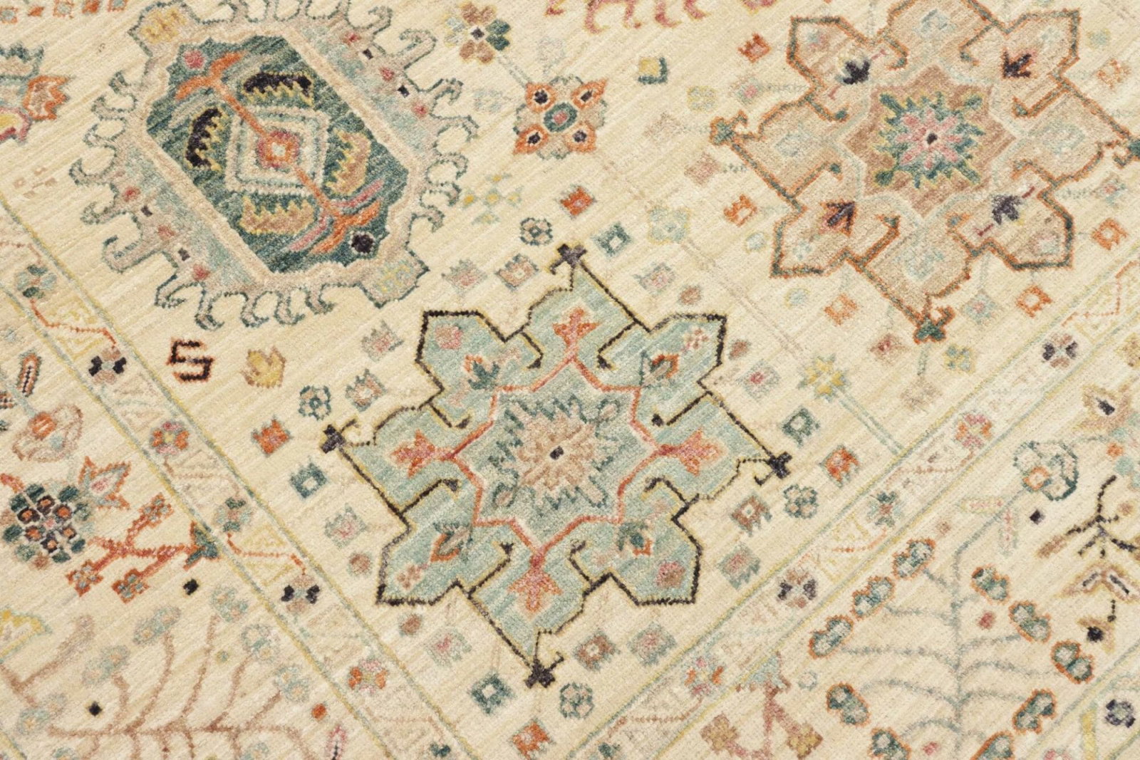 Was diesen Samarkand Orientteppich besonders auszeichnet, ist seine Kombination aus handwerklicher Tradition und zeitloser Eleganz. Jedes Stück ist ein Unikat, das mit Liebe und Hingabe gefertigt wurde. Der Teppich ist robust und pflegeleicht, was ihn ideal für stark frequentierte Bereiche macht. Darüber hinaus wirkt die Wolle auf natürliche Weise schmutzabweisend und sorgt für einen angenehmen Fußkomfort.
