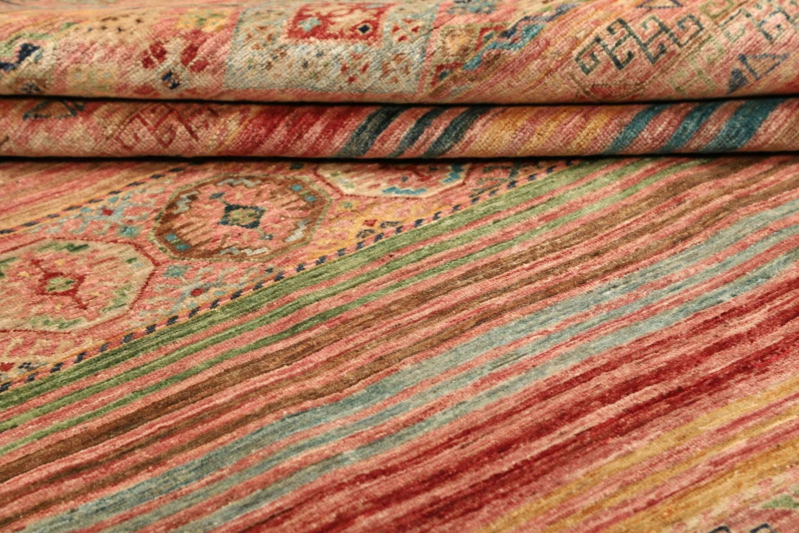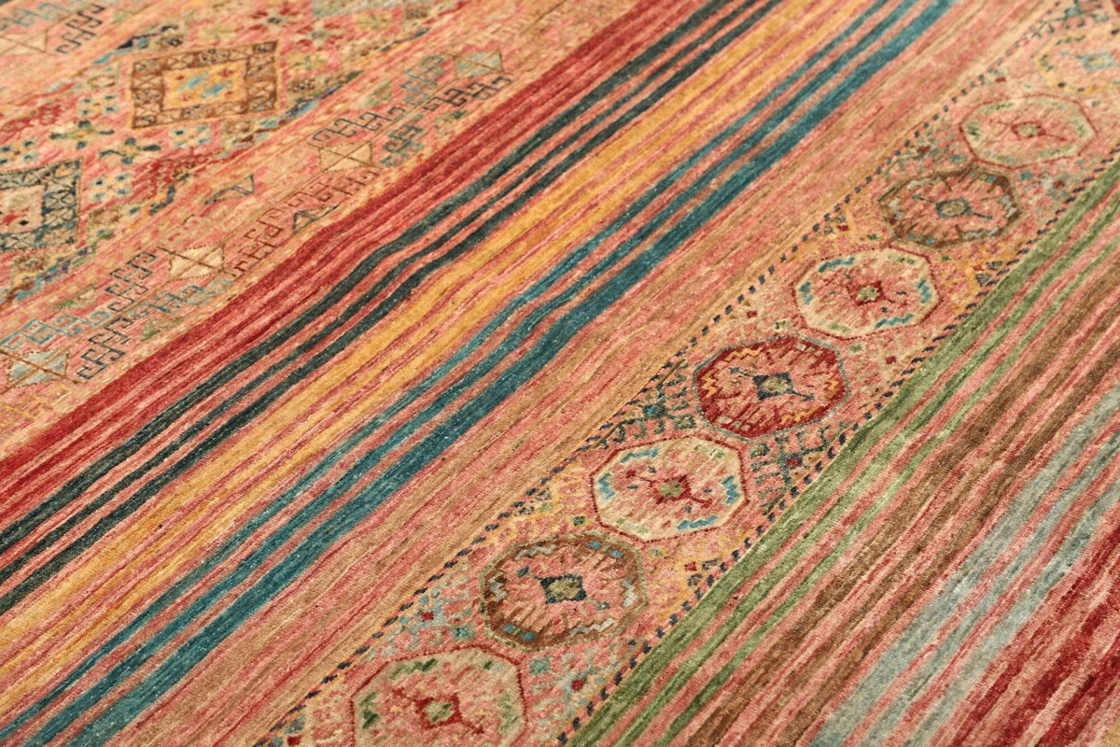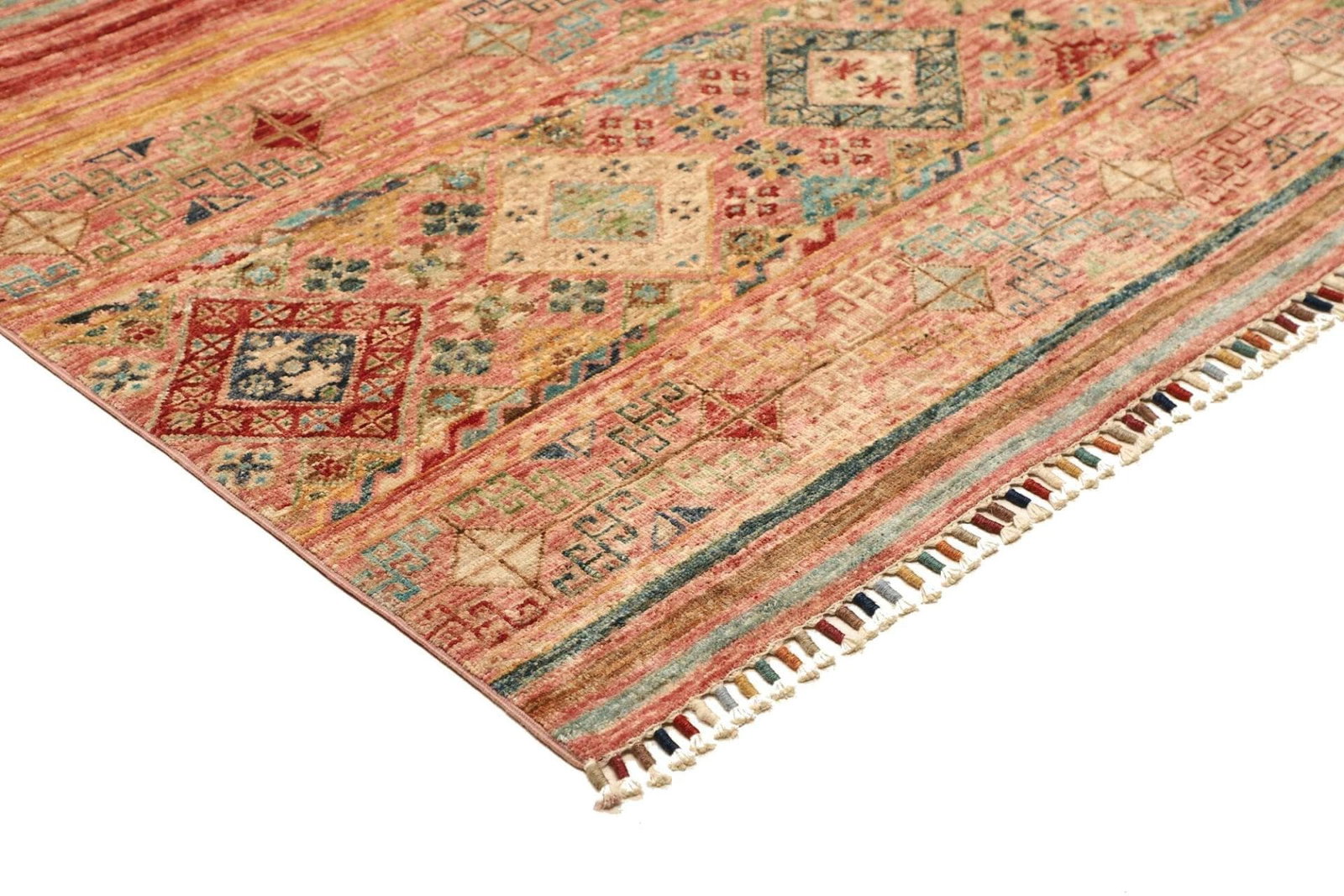 Die Farben des Samarkand Teppichs variieren von sanften Erdtönen bis hin zu lebhaften Rot- und Blautönen, die lebendige Akzente in jedem Raum setzen. Diese Farbauswahl wird durch traditionelle Färbetechniken aus pflanzlichen Materialien erreicht, die die natürliche Schönheit der Wolle unterstreichen.