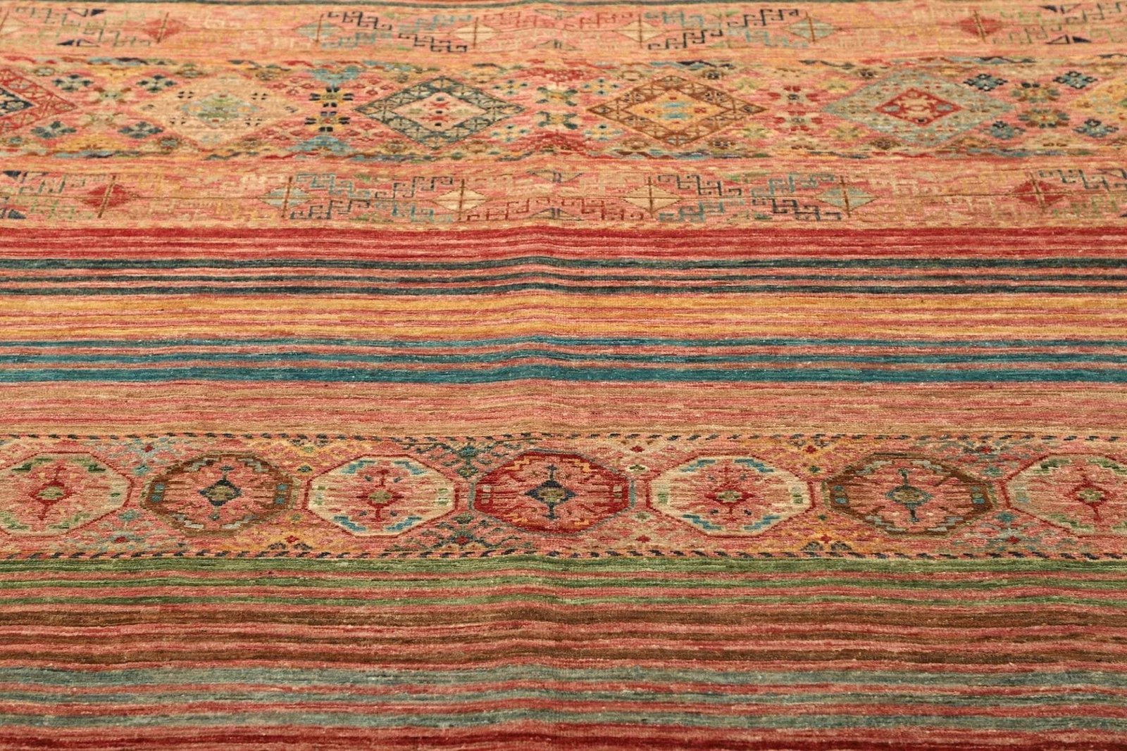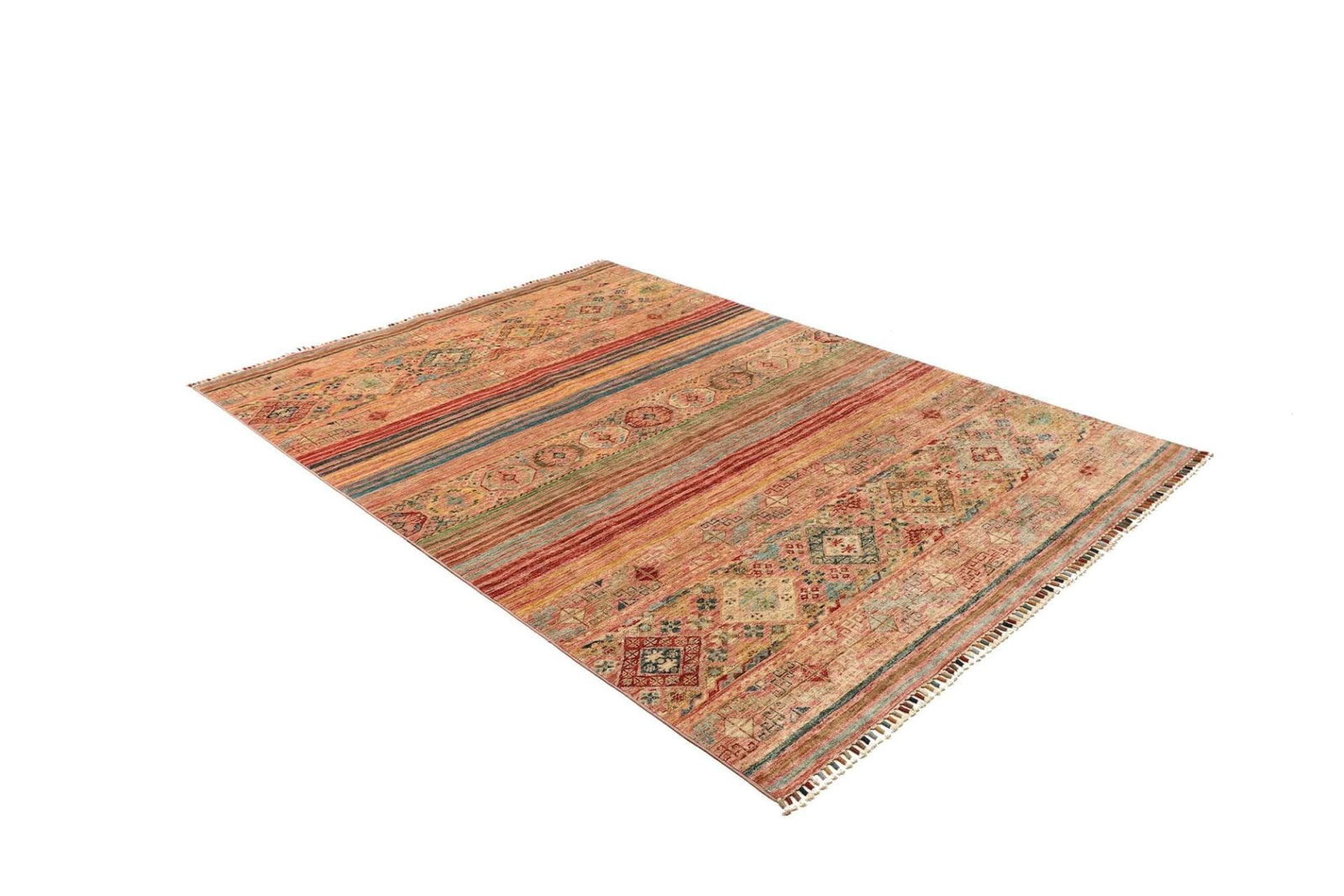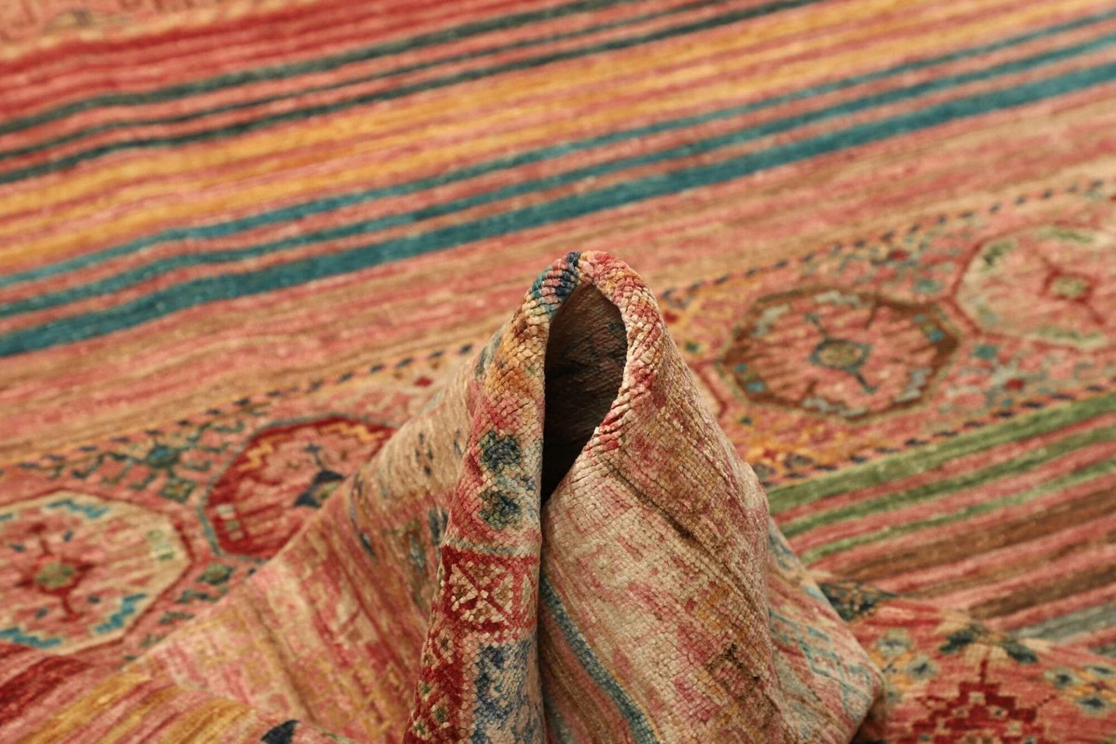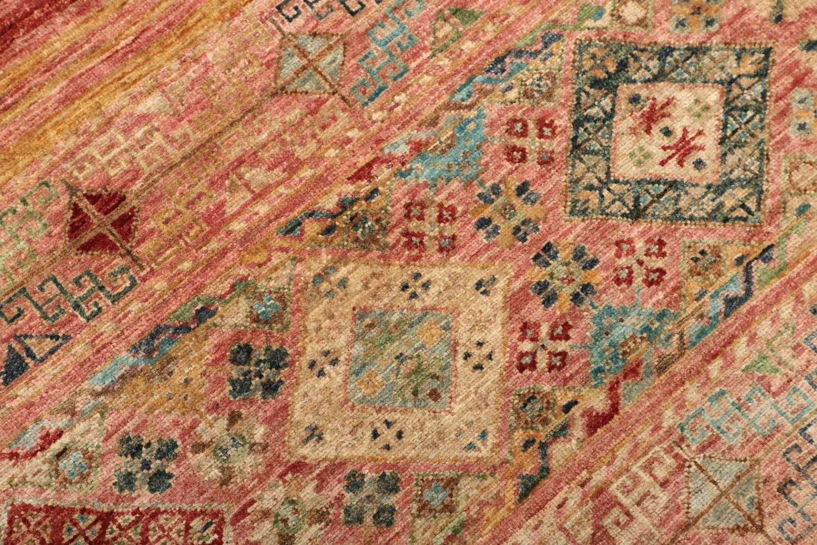 Die Farben des Samarkand Teppichs variieren von sanften Erdtönen bis hin zu lebhaften Rot- und Blautönen, die lebendige Akzente in jedem Raum setzen. Diese Farbauswahl wird durch traditionelle Färbetechniken aus pflanzlichen Materialien erreicht, die die natürliche Schönheit der Wolle unterstreichen.