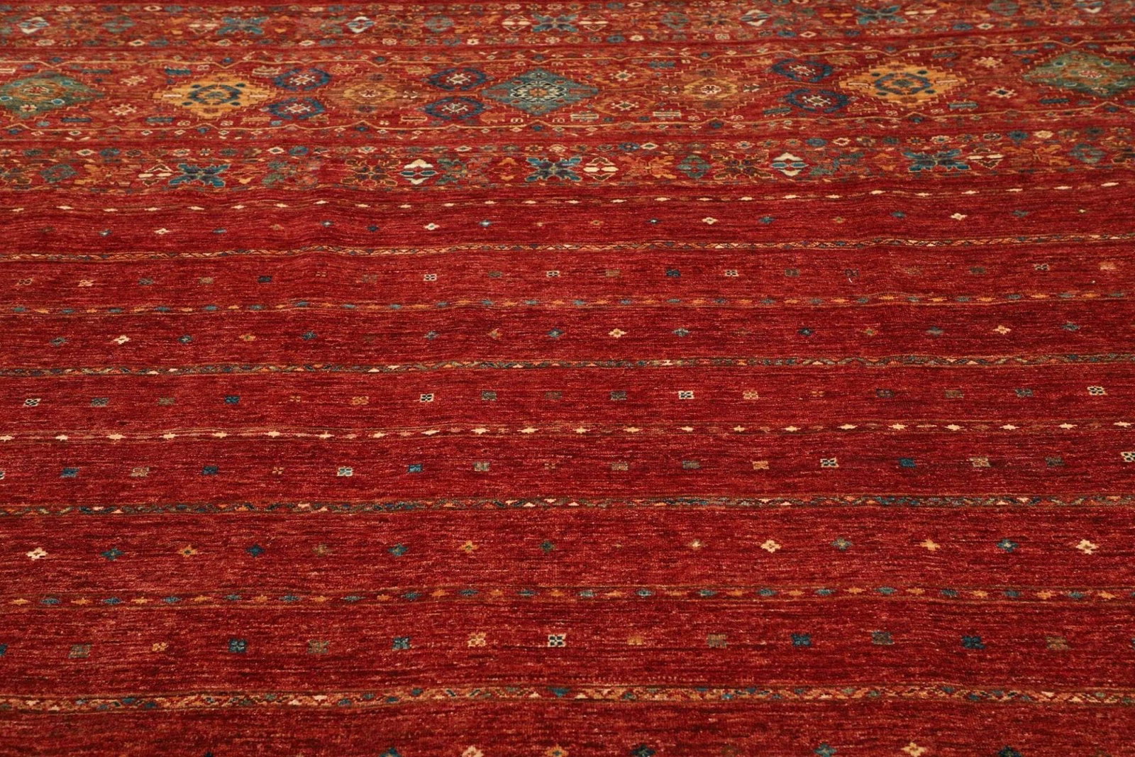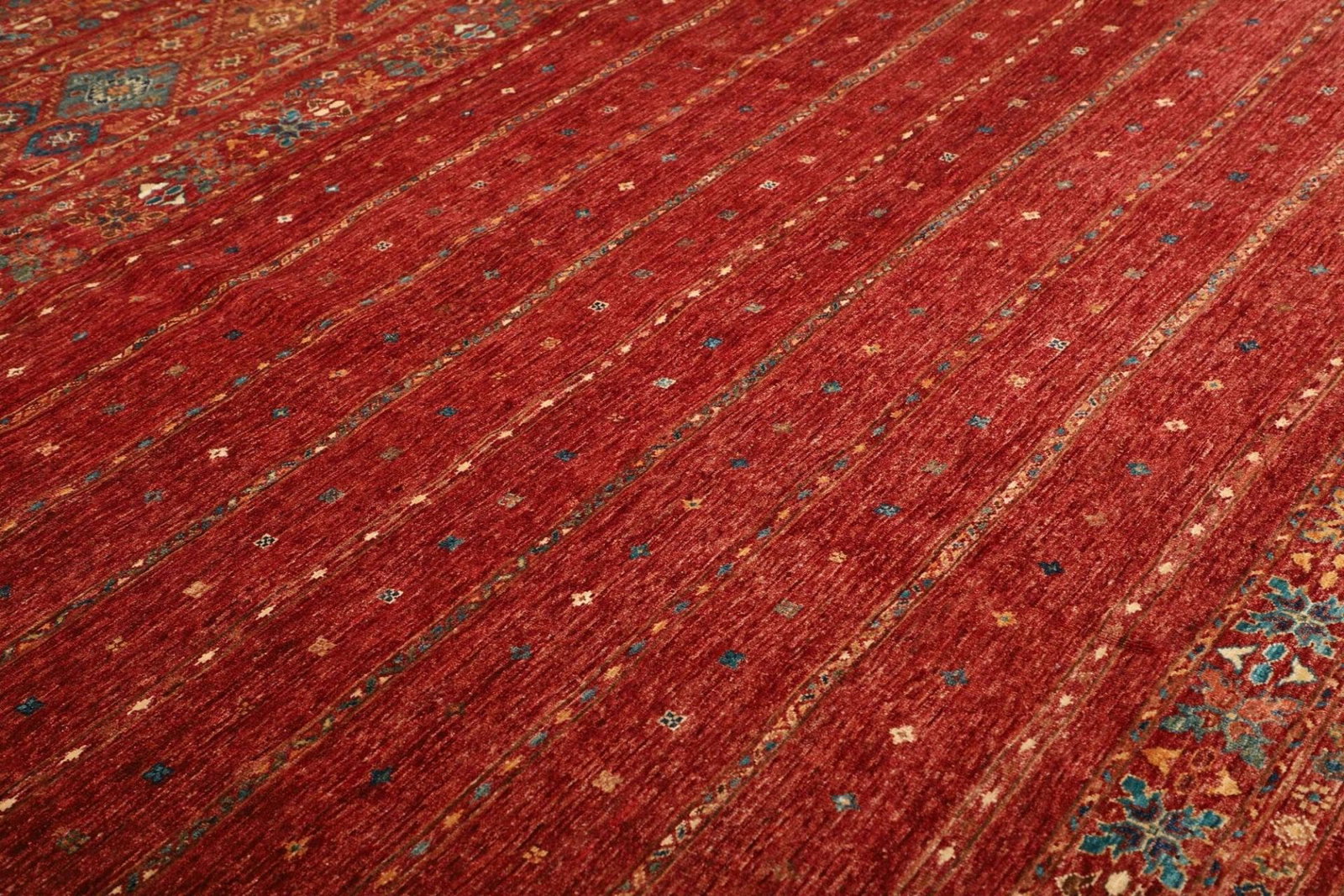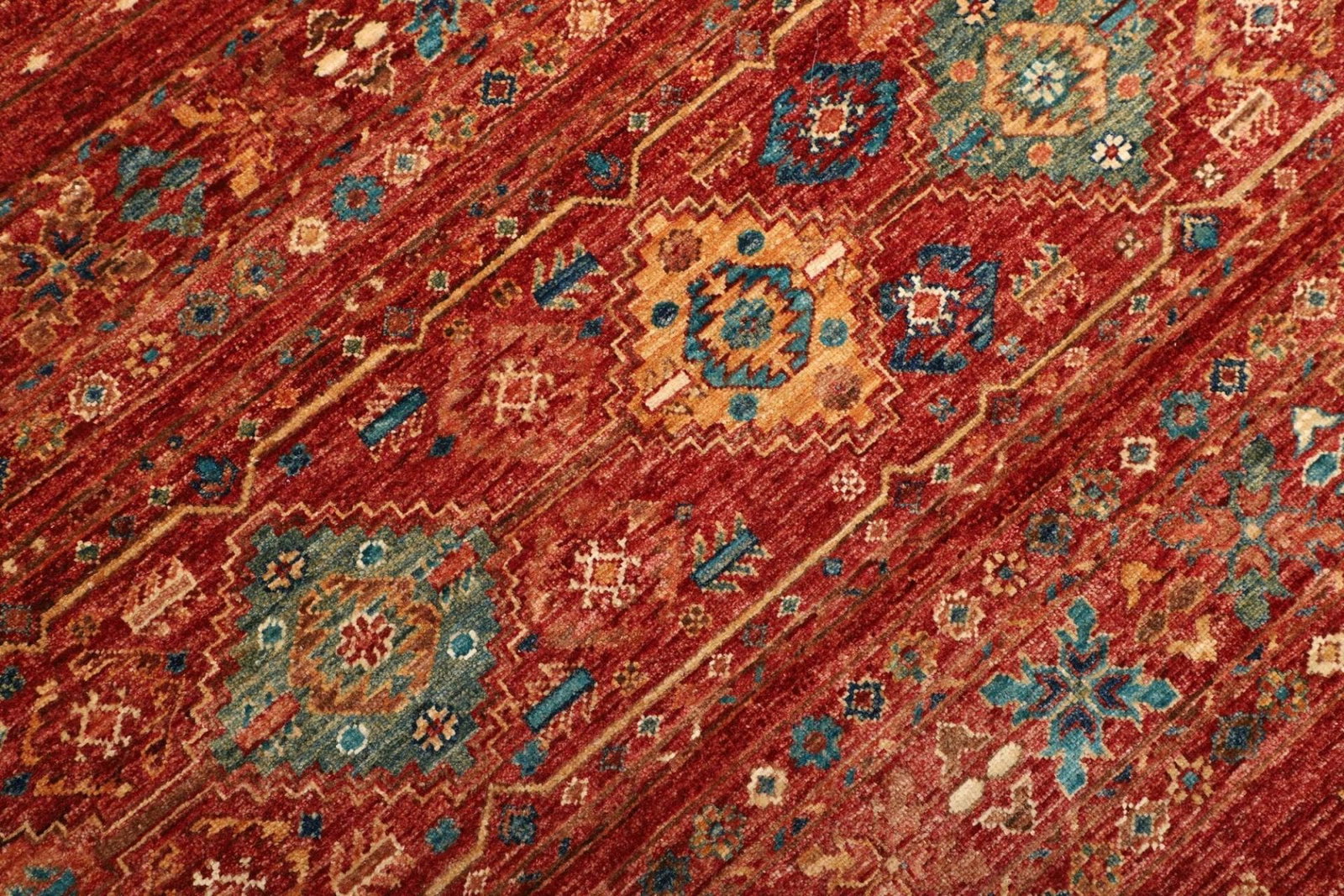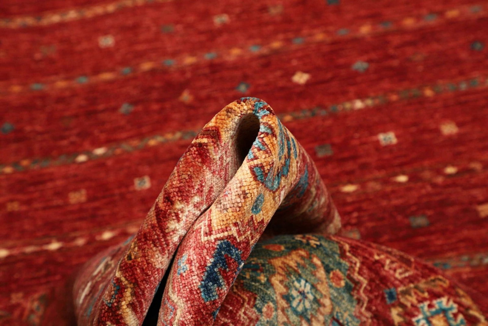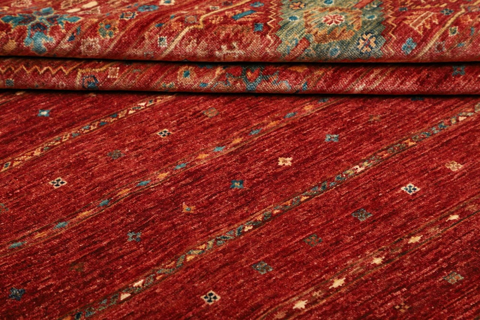 Die Grundlage dieses wunderschönen Teppichs ist reine Wolle. Wolle ist nicht nur für ihre Weichheit und Langlebigkeit bekannt, sondern bietet auch eine hervorragende Wärmeisolierung. Durch die handgeknüpfte Technik erhält der Teppich eine bemerkenswerte Robustheit, die ihn besonders langlebig macht. Die hohe Knotendichte sorgt dafür, dass die Muster klar und detailliert bleiben, auch nach Jahren der Nutzung. Diese Qualität zeigt sich besonders in den feinen Nuancen der Farben, die bei Licht wunderbar schimmern.