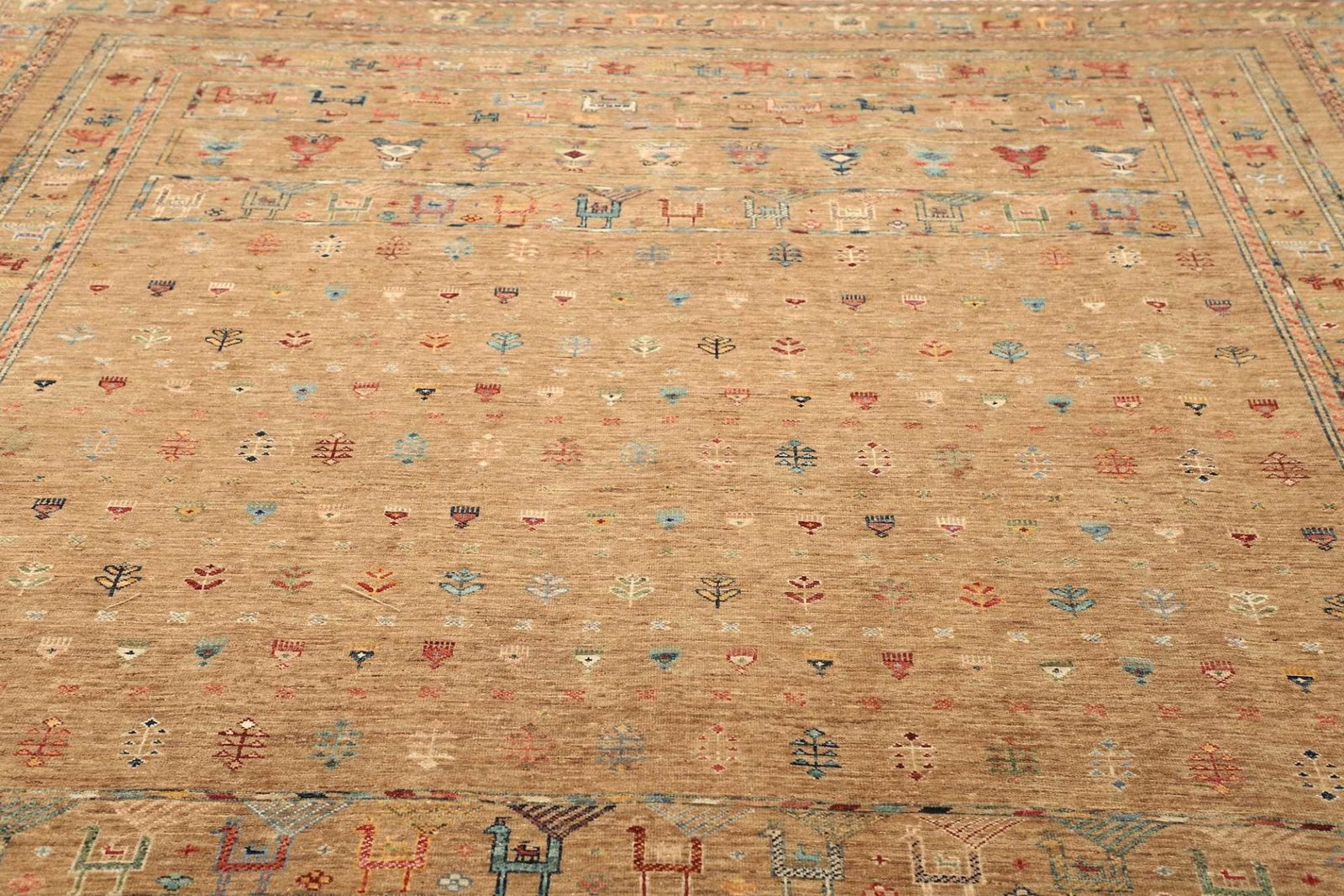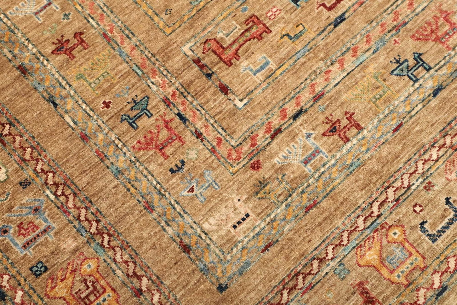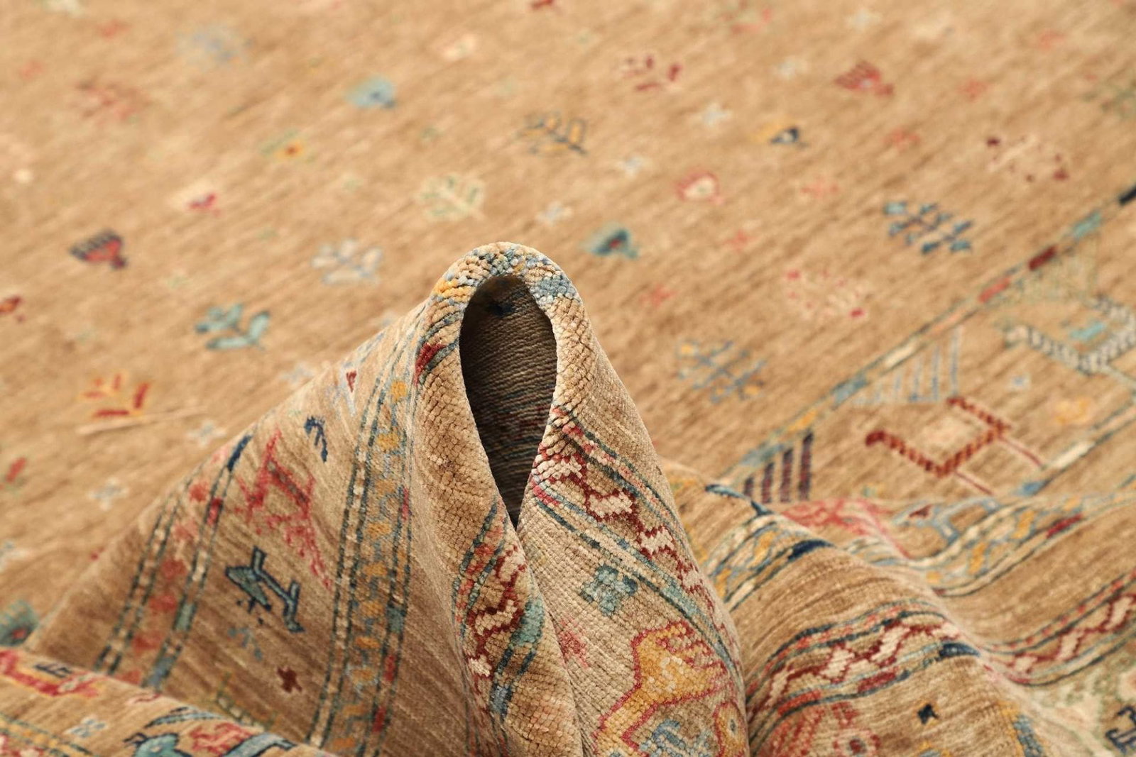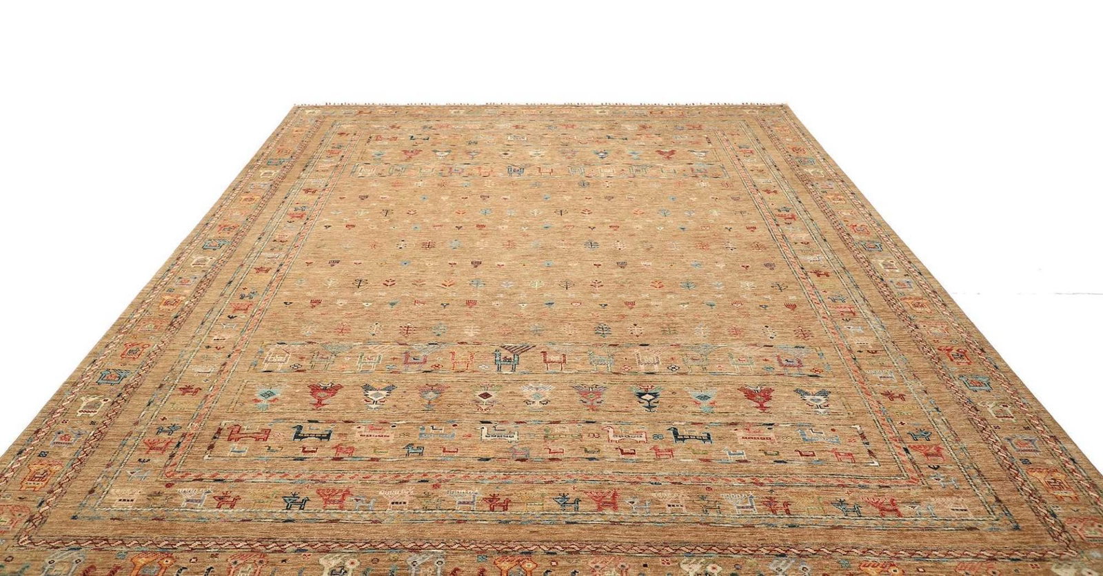 Die Farbpaletten sind meist reichhaltig und lebhaft, wobei rote, blaue und goldene Töne dominieren und dem Raum eine warme und einladende Atmosphäre verleihen. Durch die handwerkliche Knüpfung und die naturbelassenen Farben erhält jeder Teppich seinen einzigartigen Charakter, was ihn zu einem einzelnen Kunstwerk macht.