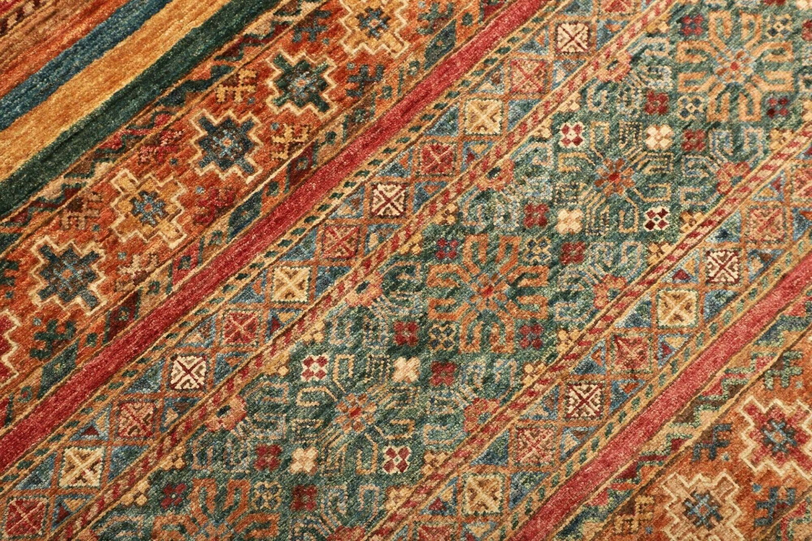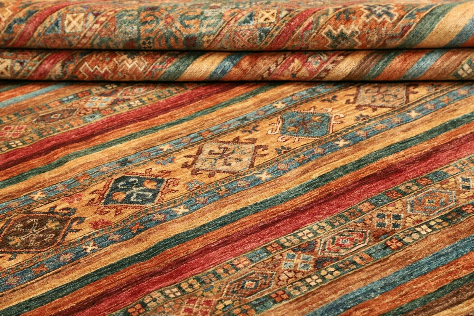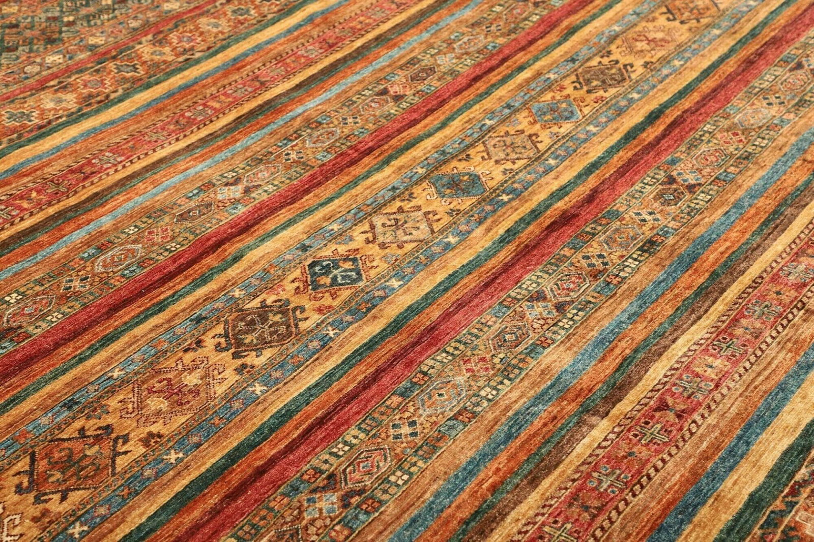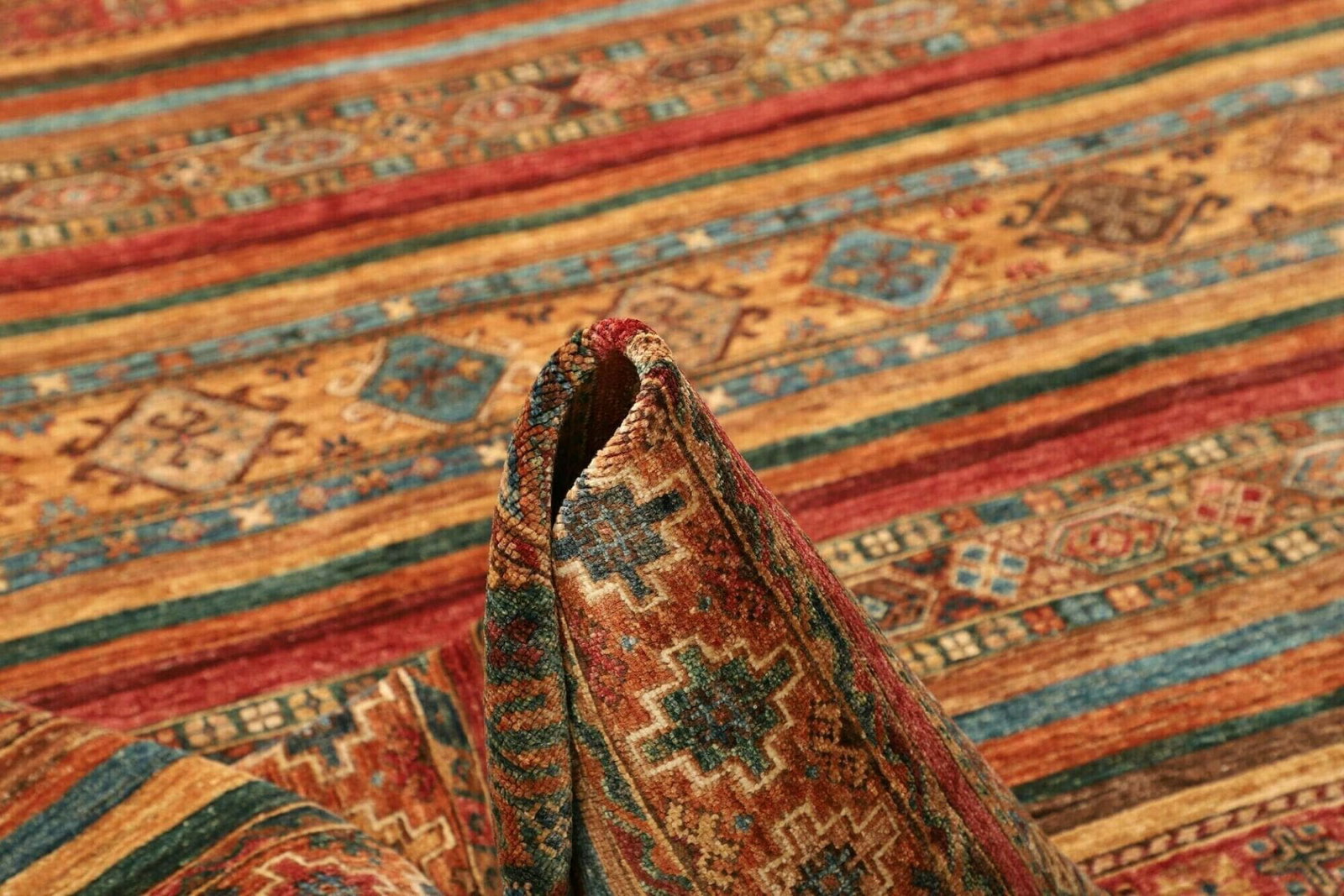 Der Teppich ist aus reiner Schurwolle gefertigt, was ihn nicht nur weich und angenehm macht, sondern auch eine hohe Langlebigkeit garantiert. Schurwolle ist bekannt für ihre widerstandsfähigen Eigenschaften und ihre Fähigkeit, Temperatur und Feuchtigkeit zu regulieren. Dies sorgt dafür, dass der Teppich selbst in stark frequentierten Bereichen aufgrund seiner Robustheit und Pflegeleichtigkeit optimale Bedingungen bietet. Die handgeknüpfte Technik ist das Markenzeichen des Teppichs und hebt die Kunstfertigkeit der Handwerker hervor, die jeden Knoten mit Sorgfalt und Präzision setzen.
