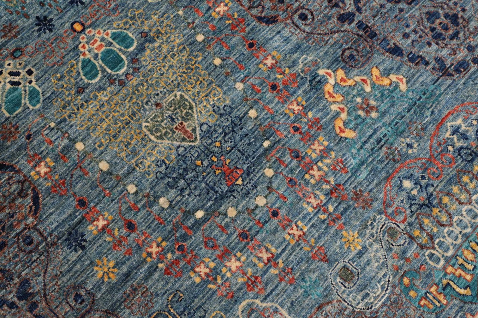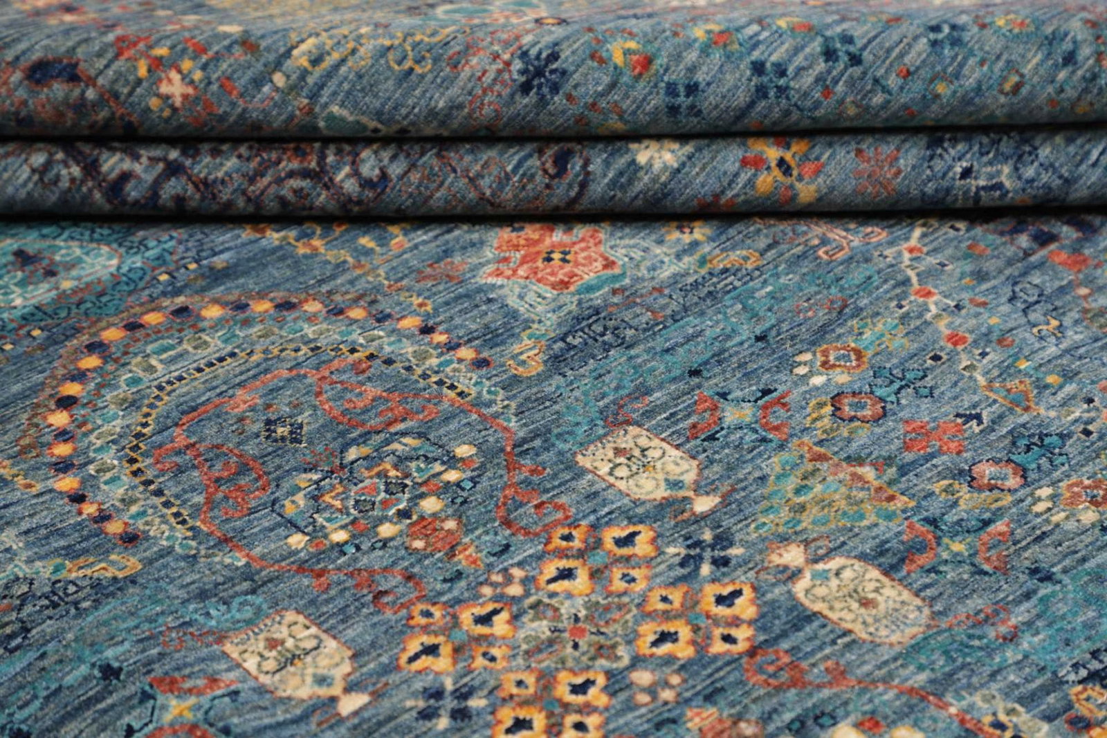 Der Samarkand Orientteppich zeichnet sich durch seine vielfältigen und lebendigen Muster aus, die im Allgemeinen Grau-, Blau- und Rottöne enthalten. Diese Farbpalette ist aufgrund der traditionell verwendeten natürlichen Farbstoffe besonders ansprechend und macht den Teppich zu einem stilvollen Element in jeglicher Inneneinrichtung. Die Muster sind oft komplex und erfordern stundenlange Arbeit und viel Geschick, weshalb handgeknüpfte Teppiche häufig als wertvolle Sammlerstücke betrachtet werden.