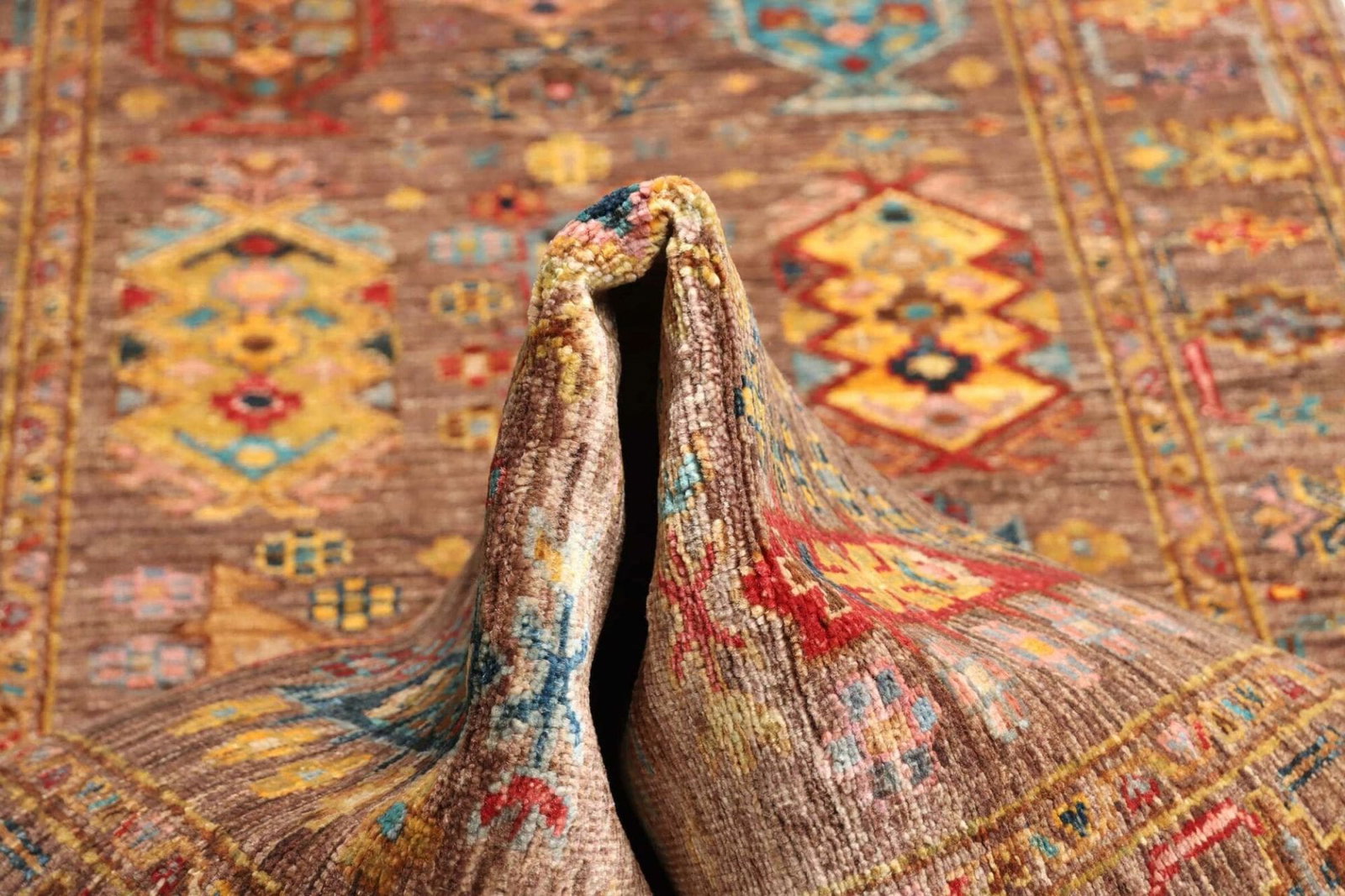 Die verwendete Schurwolle verleiht diesem Teppich seine charakteristische Weichheit und Strapazierfähigkeit. Schurwolle ist bekannt für ihre natürlichen Eigenschaften, darunter die Fähigkeit, Feuchtigkeit zu regulieren, was den Teppich besonders pflegeleicht macht. Die handgeknüpfte Technik garantiert eine hohe Knotendichte, wodurch die Stabilität und Langlebigkeit des Produkts gesichert wird. Jeder Teppich wird mit viel Liebe zum Detail gefertigt, was sich in der Qualität und der Haltbarkeit widerspiegelt.