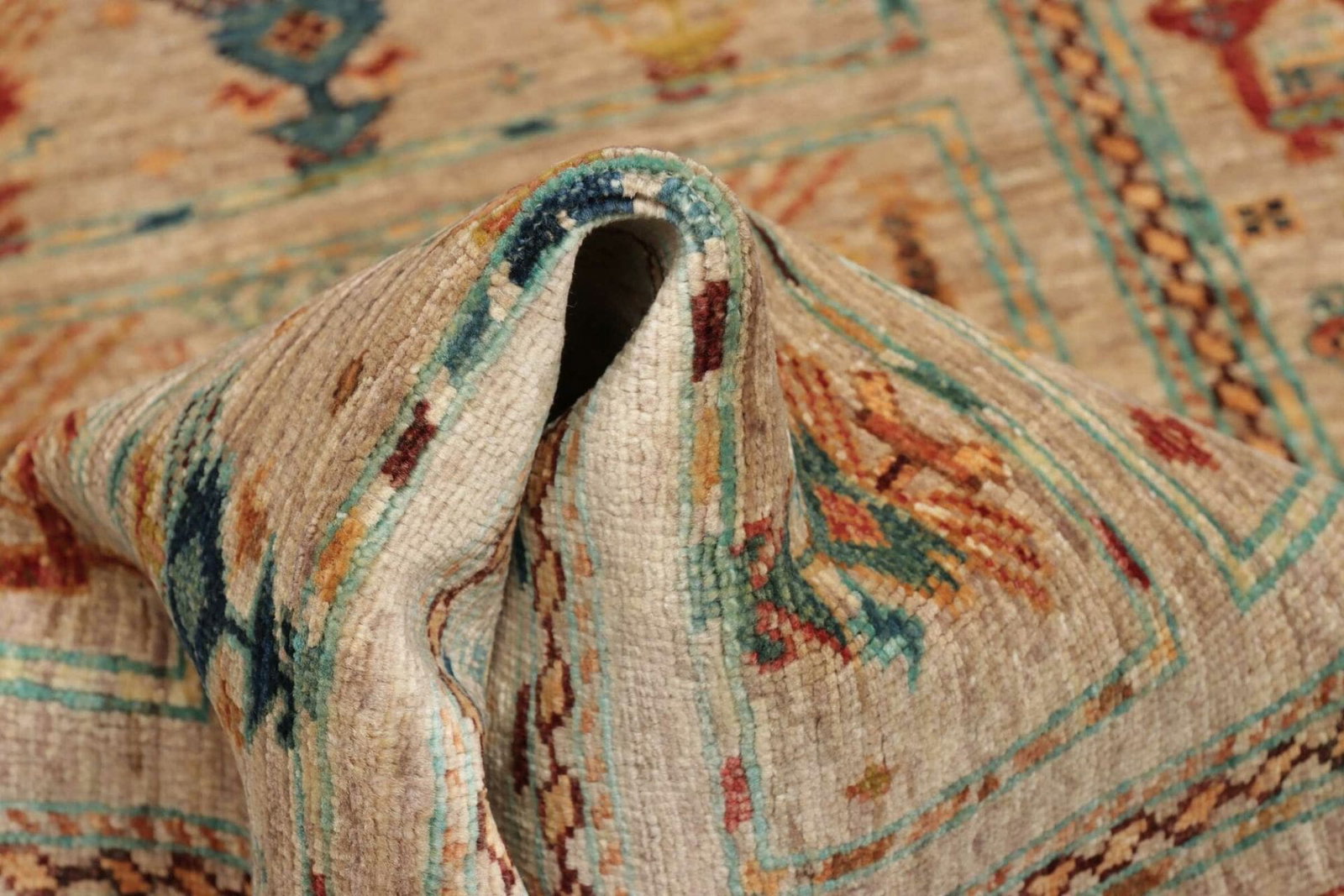 Der Samarkand Orientteppich zeichnet sich durch ein lebhaftes und vielseitiges Design aus. Die bunten Farben reichen von warmen Rottönen bis hin zu sanften Blautönen, die miteinander harmonieren und ein ausgewogenes Gesamtbild schaffen. Dieses bunte Muster entfaltet seine volle Wirkung besonders in hellen Räumen oder als Kontrast zu minimalistischen Einrichtungen. Die verwendeteten Symbole und Muster haben oft eine tiefe Bedeutung. Sie stehen für Glück, Wohlstand, und die Verbindung zur Natur. Während der Teppich die Tradition und das Erbe der Region verkörpert, fügt er sich gleichzeitig nahtlos in moderne Wohnkonzepte ein.
